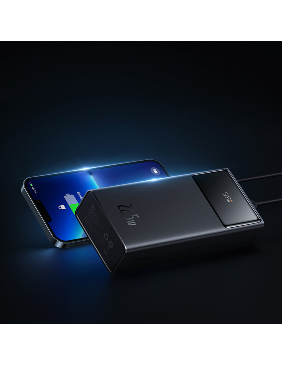 - - Nešiojamoji baterija 30000mAh 22.5W su USB-A - USB-C 3A 30cm laidu - juoda