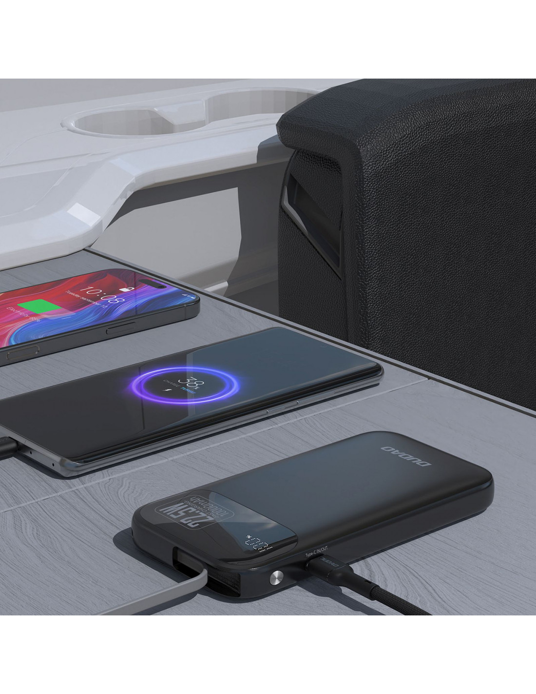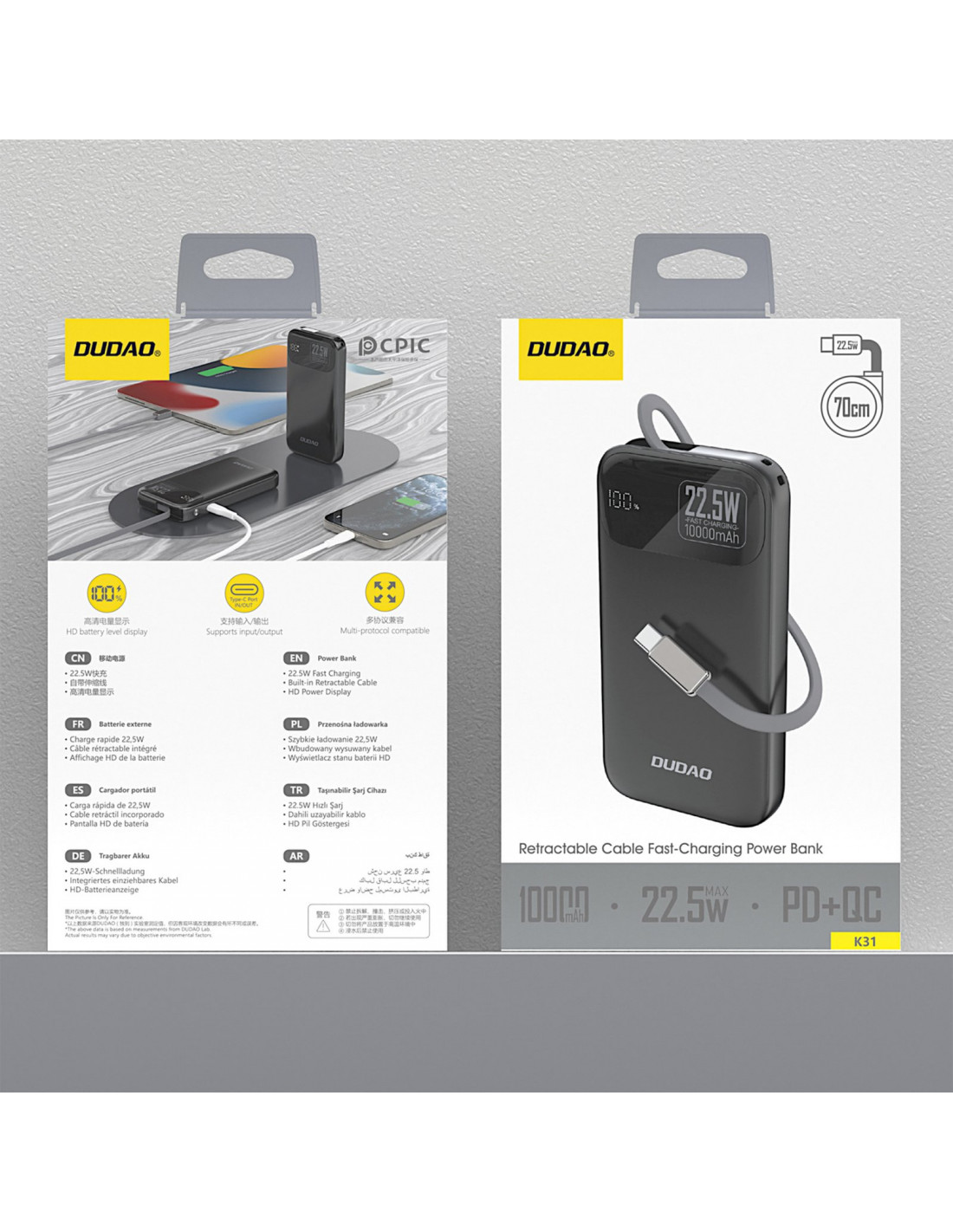 „Dudao K31“ – tai moderni 10 000 mAh talpos išorinė baterija, pasižyminti elegantišku dizainu ir išskirtiniu funkcionalumu. Dėl greito įkrovimo iki 22,5 W ir integruoto, ištraukiamo 70 cm ilgio USB-C laido , ji užtikrina patogumą ir mobilumą bet kokioje situacijoje. Įrengtas skaitmeninis LED ekranas rodo realaus laiko energijos lygį, o išmanioji grandinė apsaugo įrenginius nuo trumpojo jungimo, perkrovimo ir perkaitimo. Dėl kompaktiško dydžio ir juodos spalvos ji yra patikimas maitinimo šaltinis tiek kelionėms, tiek kasdieniam naudojimui.