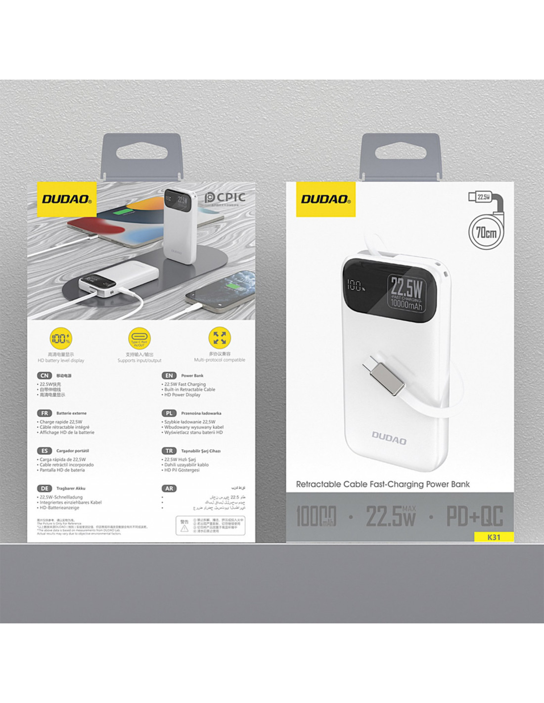 „Dudao K31“ – tai moderni 10 000 mAh talpos išorinė baterija , pasižyminti elegantišku dizainu ir išskirtiniu funkcionalumu. Dėl greito įkrovimo iki 22,5 W ir integruoto, ištraukiamo 70 cm ilgio USB-C laido, ji užtikrina patogumą ir mobilumą bet kokioje situacijoje. Įrengtas skaitmeninis LED ekranas rodo realaus laiko energijos lygį, o išmanioji grandinė apsaugo įrenginius nuo trumpojo jungimo, perkrovimo ir perkaitimo. Dėl kompaktiško dydžio ir baltos spalvos ji yra patikimas maitinimo šaltinis tiek kelionėms, tiek kasdieniam naudojimui.