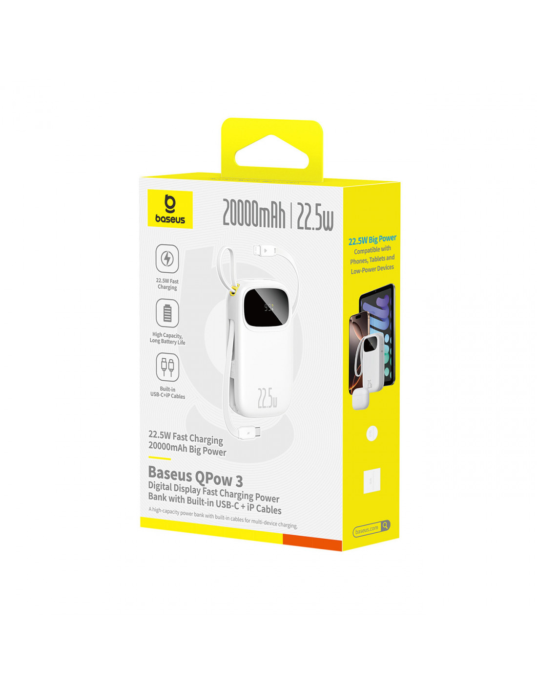 20000mAh 22,5W nešiojamoji baterija su ekranu, USB-C, „iPhone“ „Lightning“ laidais – balta