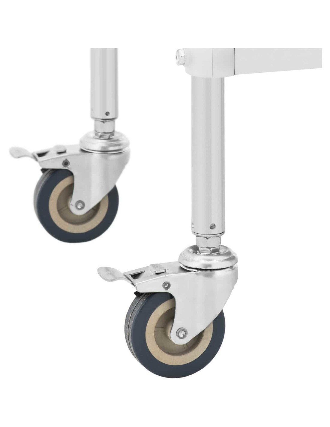 Steinberg Systems laboratorinis vežimėlis puikiai tinka stelažams, mėgintuvėliams, skysčiams ar popieriniams rankšluosčiams laikyti ir transportuoti. Dvi lentynos, kurių matmenys 61 x 40 x 13 cm, ir du stalčiai, kurių matmenys 21 x 31 x 8 cm, leidžia gerai organizuoti priedus. Suvirinti rėmai neleidžia daiktams netyčia nuslysti. Viena pusė atvira, todėl daiktus lengva išimti ir sudėti. Keturi ratai ir patogios rankenos palengvina transportavimą. Ratai pagaminti iš plastiko (PVC), nesubraižys net ir gležnų grindų. Du iš jų turi stovėjimo stabdžius. Ant šoninio vamzdžio yra praktiška šiukšlių dėžė, kurią galima pasukti 360°. Vežimėlio konstrukcija pagaminta iš nerūdijančio plieno ir jo keliamoji galia yra iki 20 kg .