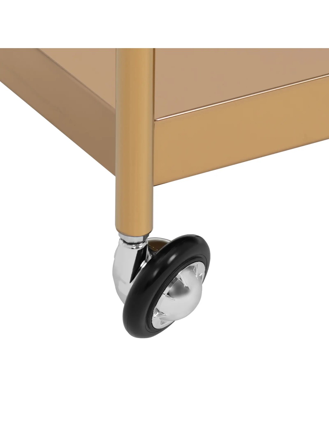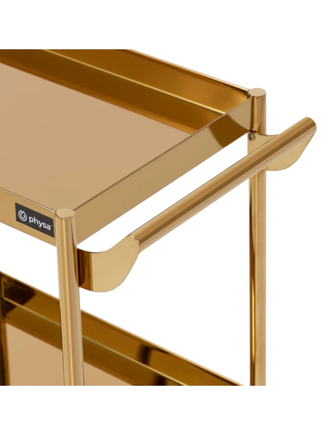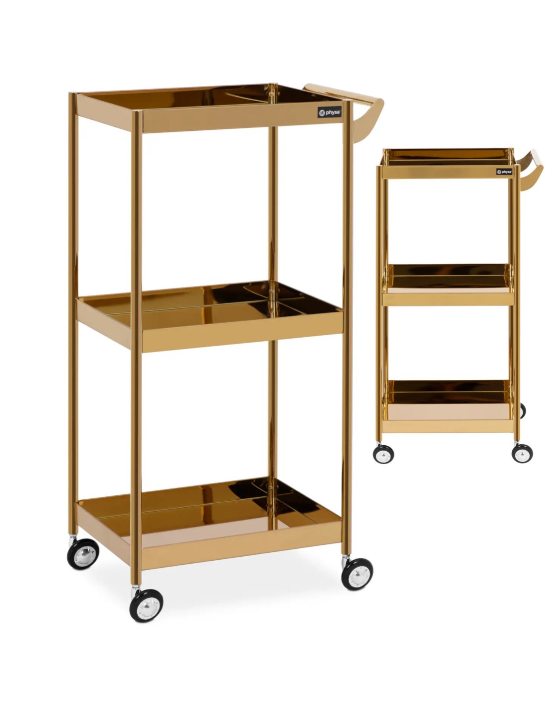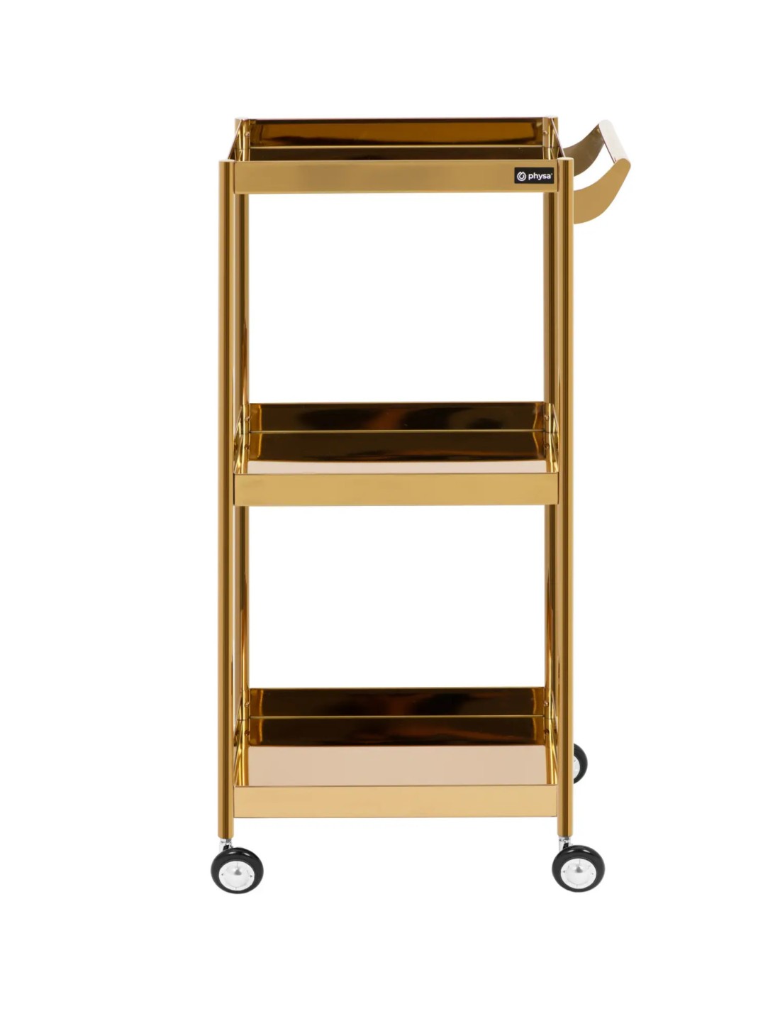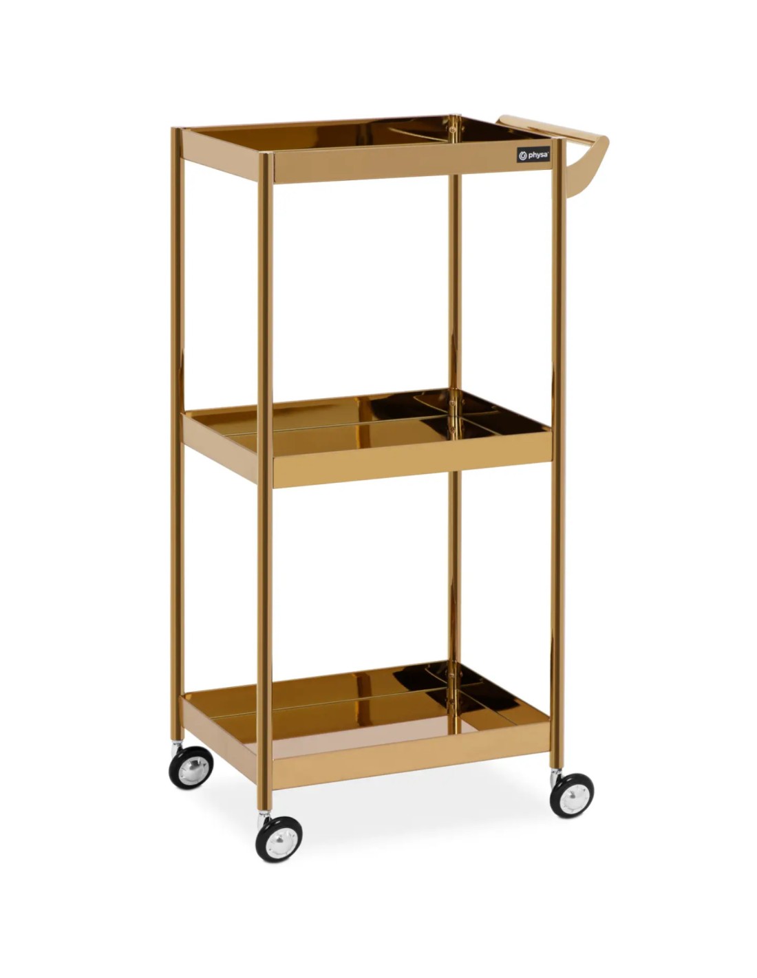 Physa kosmetikos asistentas leidžia įgyti praktišką ir mobilią saugojimo sistemą. Aukso spalvos modelis žavi savo paprasta elegancija, kuri tiks prie bet kokio interjero. Keturi besisukantys ratai leidžia pagalbininkui lengvai judėti įvairiais aukštais, o kompaktiški matmenys leidžia tilpti net siauruose koridoriuose. Šone yra ypač plati stūmimo rankena, leidžianti visada valdyti rėmą. Trys lentynos suteikia daug vietos darbo reikmenims, pavyzdžiui, rankšluosčiams, kremams ir valymo priemonėms. Lentynos turi paaukštintus kraštus. Taip dirbdami su vežimėliu nenukris kosmetika ir kiti priedai. Atstumas tarp lentynų 37 cm. Kiekviena lentyna talpina iki 10 kg, todėl vienu metu galite gabenti iki 30 kg. Nepaisant mažo svorio, kosmetikos asistentas yra ne tik išskirtinai stabilus, bet ir labai patvarus. Modelis pagamintas iš 2,5 mm storio nerūdijančio plieno , todėl yra atsparus smūgiams ir korozijai. Medžiaga nejautri išoriniams veiksniams ir džiugins nepriekaištinga išvaizda net ir po naudojimo metų.