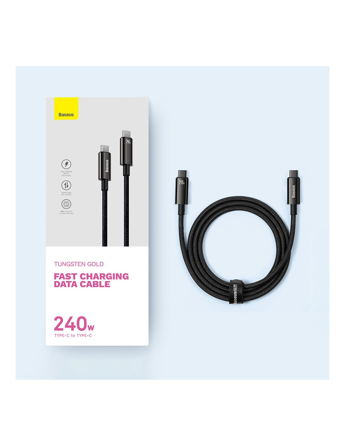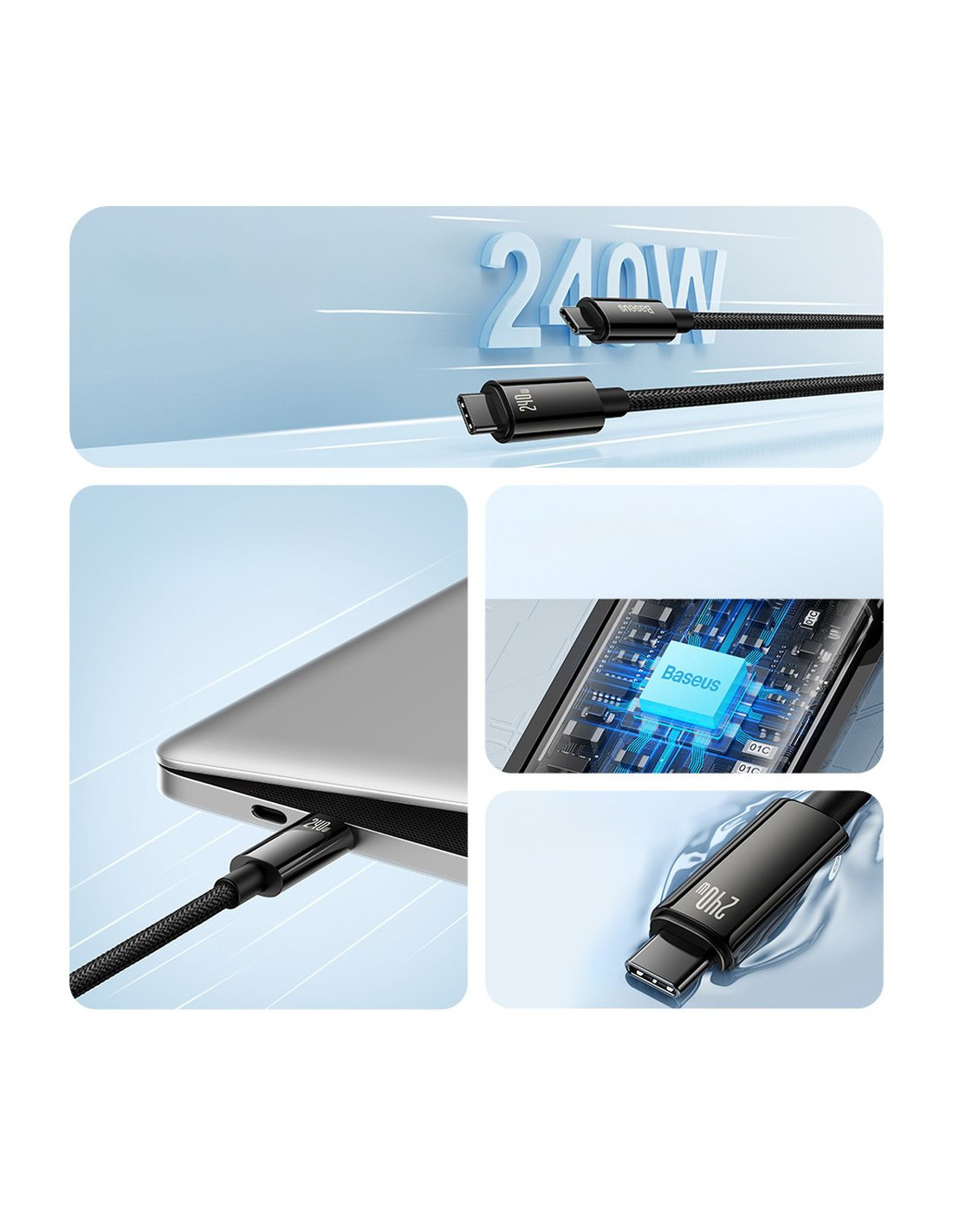 Greitas įkrovimas ir duomenų perdavimas įmanomas naudojant „Baseus USB-C“ – USB-C laidą . Idealūs našumo parametrai – 480 Mbps duomenų perdavimo greitis ir palaikymas įrenginiams iki 240 W. Laidas leidžia lengvai prijungti didelės galios įrenginius prie maitinimo šaltinio įkrovimo metu. Integruotos saugumo funkcijos užtikrina aukštą saugumo lygį naudojimo metu.