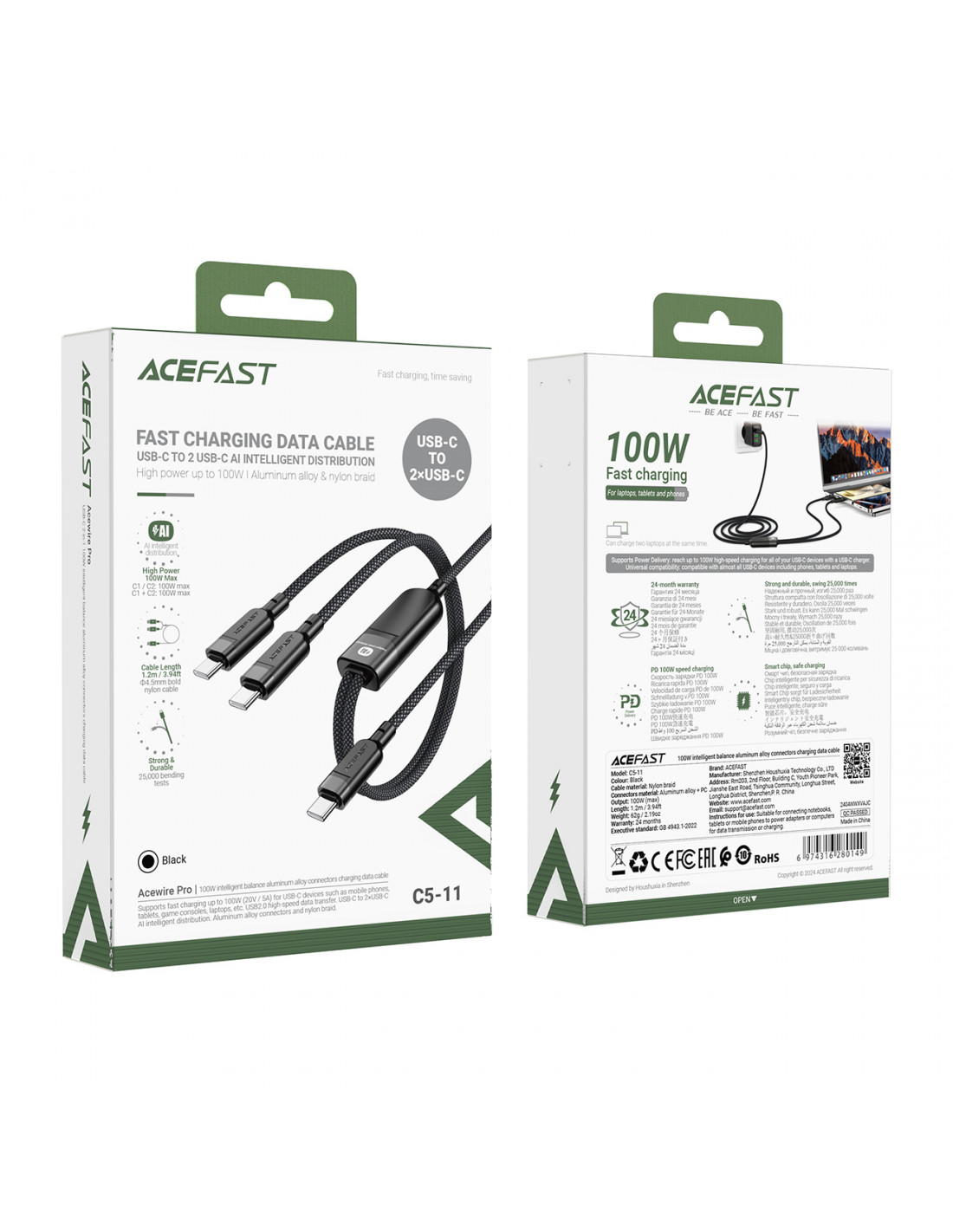 „Acefast C5“ laidas yra 2 viename sprendimas , leidžiantis vienu metu prijungti du įrenginius (dėl dviejų USB-C jungčių). Jis idealiai tinka greitam įkrovimui ir duomenų perdavimui, palaikydamas platų įrenginių asortimentą, pvz., išmaniuosius telefonus, planšetinius kompiuterius, nešiojamuosius kompiuterius ir mobiliųjų žaidimų konsoles. Jo išmanusis energijos paskirstymas užtikrina optimalų kiekvieno įrenginio įkrovimą, prisitaikant prie jo poreikių.