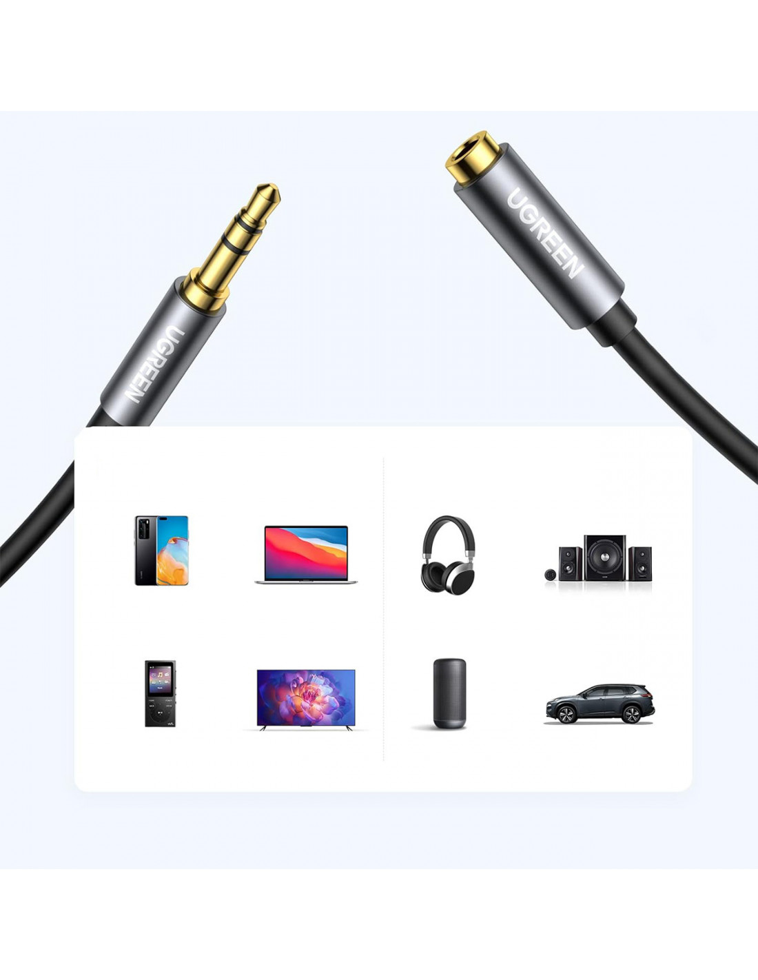 „Ugreen AV118“ leidžia lengvai prijungti įvairius įrenginius. Kištuką galima prijungti prie telefono, planšetinio kompiuterio, MP3 grotuvo, kompiuterio ar nešiojamojo kompiuterio, o kištuką – prie automobilio, garsiakalbio, ausinių ar garso sistemos. Šis universalumas daro laidą neįtikėtinai funkcionalų ir tinkamą įvairioms reikmėms.