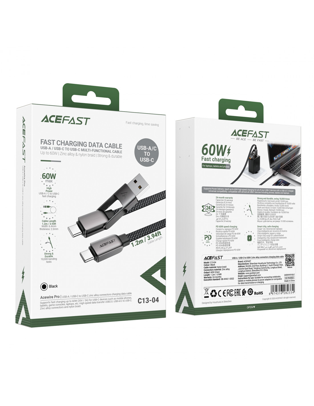 „Acefast C13-04“ laidas sukurtas maksimaliam universalumui. Suderinamas su USB-A ir USB-C prievadais, jį galite naudoti su įvairiais įrenginiais – nuo nešiojamųjų kompiuterių ir išmaniųjų telefonų iki išorinių akumuliatorių ir planšetinių kompiuterių.