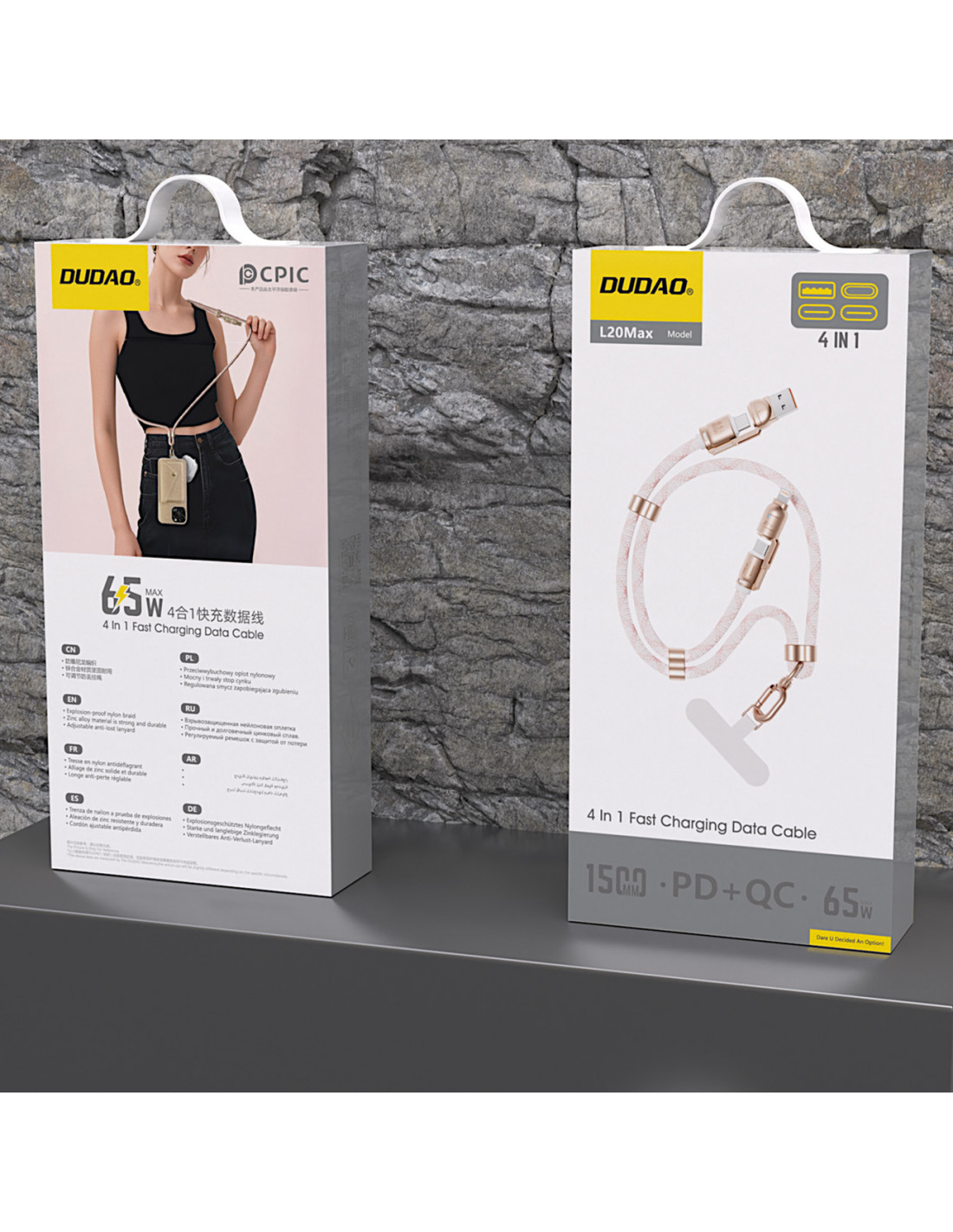 Šis modernus ir universalus 4 viename „Dudao L20MAX“ laidas patenkins net ir reikliausių vartotojų lūkesčius. Galimybė atlaikyti iki 65 W galią ir palaikyti „Power Delivery“ bei „Quick Charge“ technologijas užtikrina žaibišką jūsų įrenginių įkrovimą. Pagamintas iš aukštos kokybės aliuminio lydinio ir pinto nailono, jis garantuoja patvarumą ir atsparumą pažeidimams. Galimybė konfigūruoti įvairius prievadų derinius (USB-A - USB-C, USB-C - USB-C, USB-C - „Lightning“, USB-A - „Lightning“) daro šį laidą idealiu visiems. Be to, novatoriškas dizainas leidžia jį naudoti kaip telefono dirželį, užtikrinant patogumą ir funkcionalumą viename.