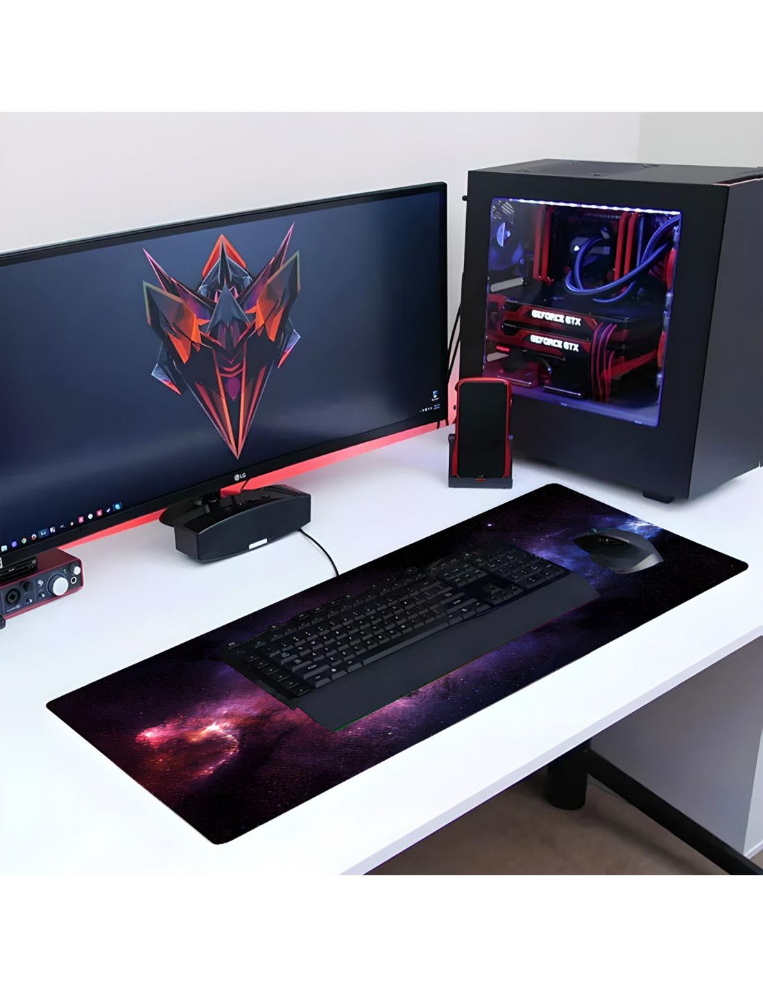 Šis juodas žaidimų pelės kilimėlis su rausvos ir violetinės spalvos atspalviais erdvės rašte yra praktiškas aksesuaras, puikiai tinkantis tiek darbui biure, tiek žaidimams. Didelis 800 x 400 mm paviršius leidžia laisvai judėti net ir esant žemai DPI raiškai, o lygus audinio viršus leidžia sklandžiai ir tiksliai slysti optinėms ir lazerinėms pelėms. Neslystantis guminis pagrindas užtikrina stabilumą net ir atliekant dinaminius judesius, o siūti kraštai padidina patvarumą. Kilimėlis yra lankstus, atsparus dilimui ir lengvai nešiojamas, todėl jį galima naudoti įvairiomis sąlygomis.
