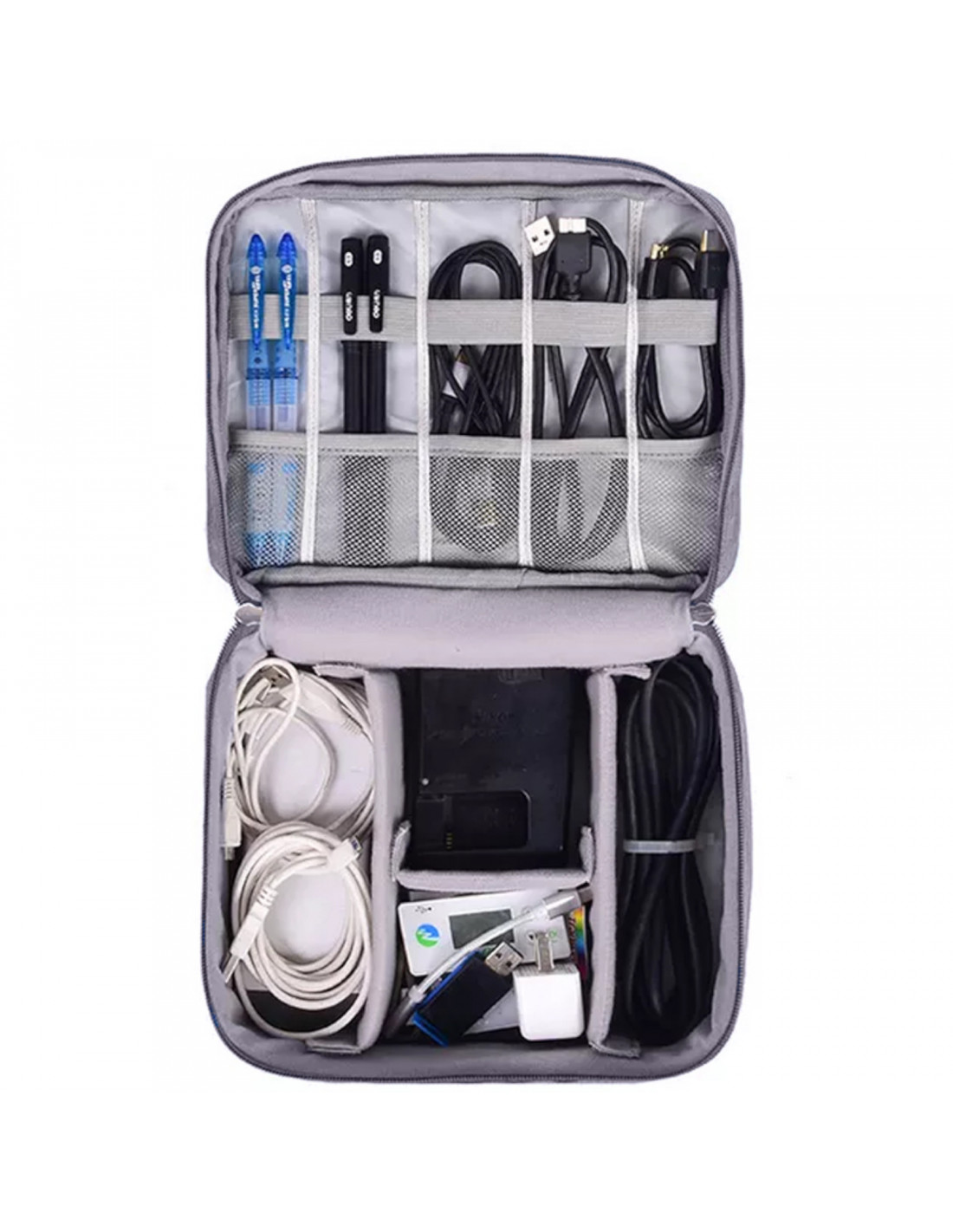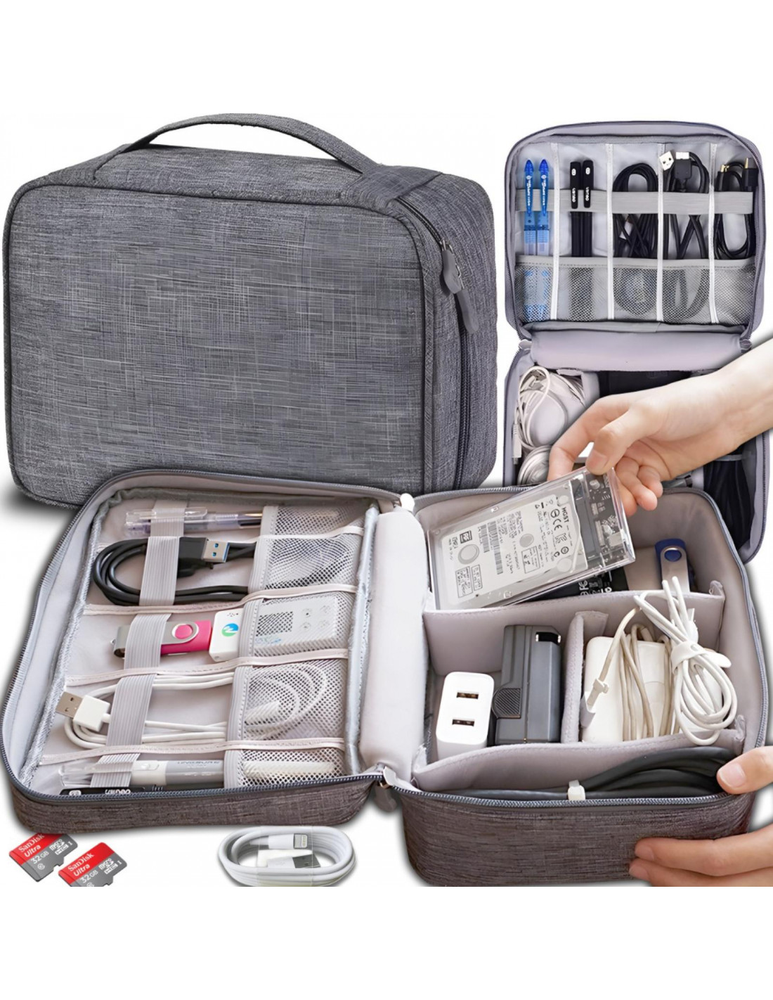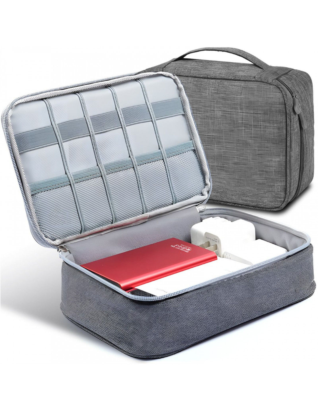 Šis elektronikos ir priedų organizatorius yra praktiškas dėklas, leidžiantis vienoje vietoje laikyti laidus, įkroviklius, ausines, išorines baterijas, atminties korteles, standžiuosius diskus, telefonus ir kitus smulkius elektroninius prietaisus. Pagamintas iš aukštos kokybės, vandeniui atsparios pilkos melanžo medžiagos, jis turi dvipusį užtrauktuką ir rankeną, todėl idealiai tinka namams ir kelionėms. Organizatoriuje yra daug skyrių ir kišenių, kurios padės tvarkingai laikyti jūsų elektroniką ir apsaugoti ją nuo pažeidimų.