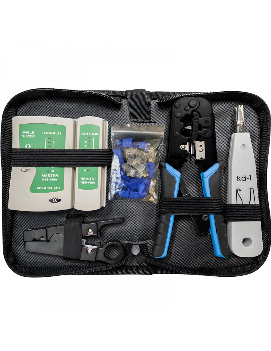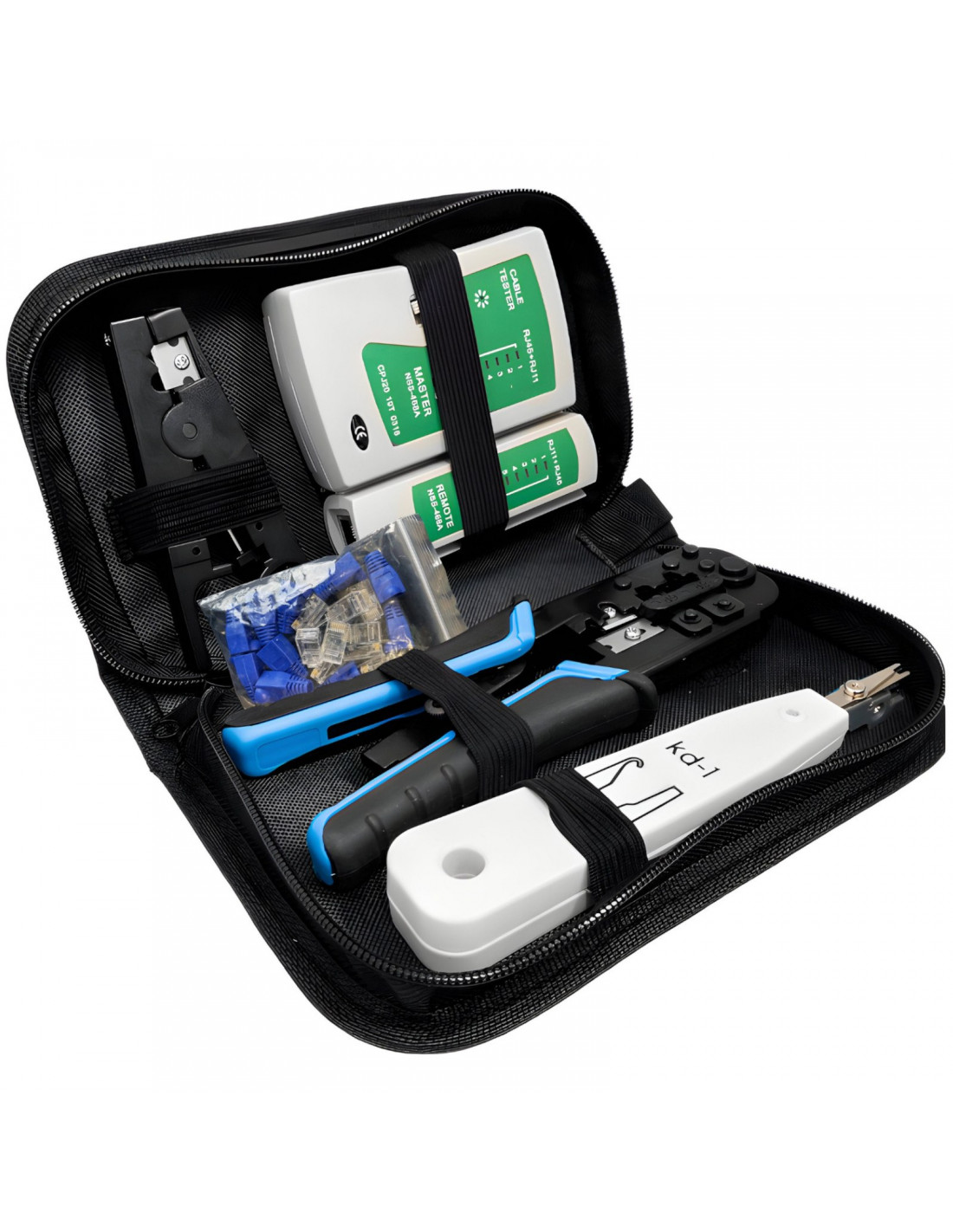 Pilnas tinklo priežiūros įrankių rinkinys , supakuotas praktiškame dėkle, skirtas tinklo kabeliams taisyti, tikrinti ir testuoti. Rinkinys leidžia patogiai dirbti su RJ45, RJ11 ir RJ12 kabeliais ir kištukais.