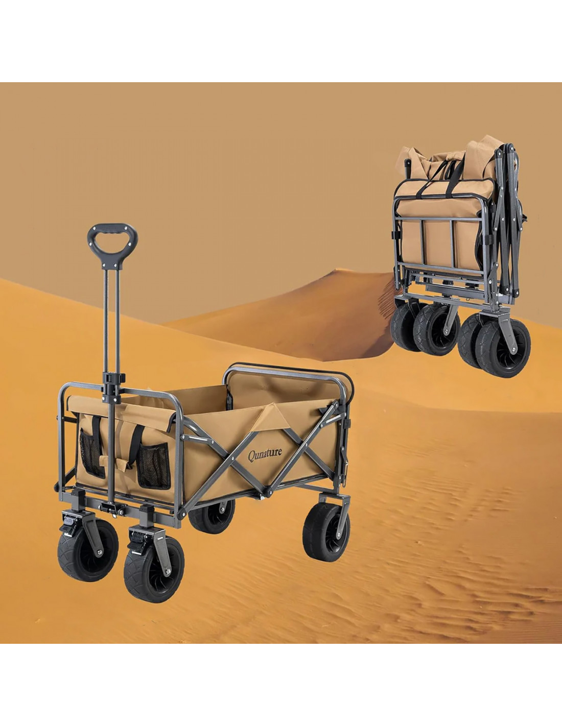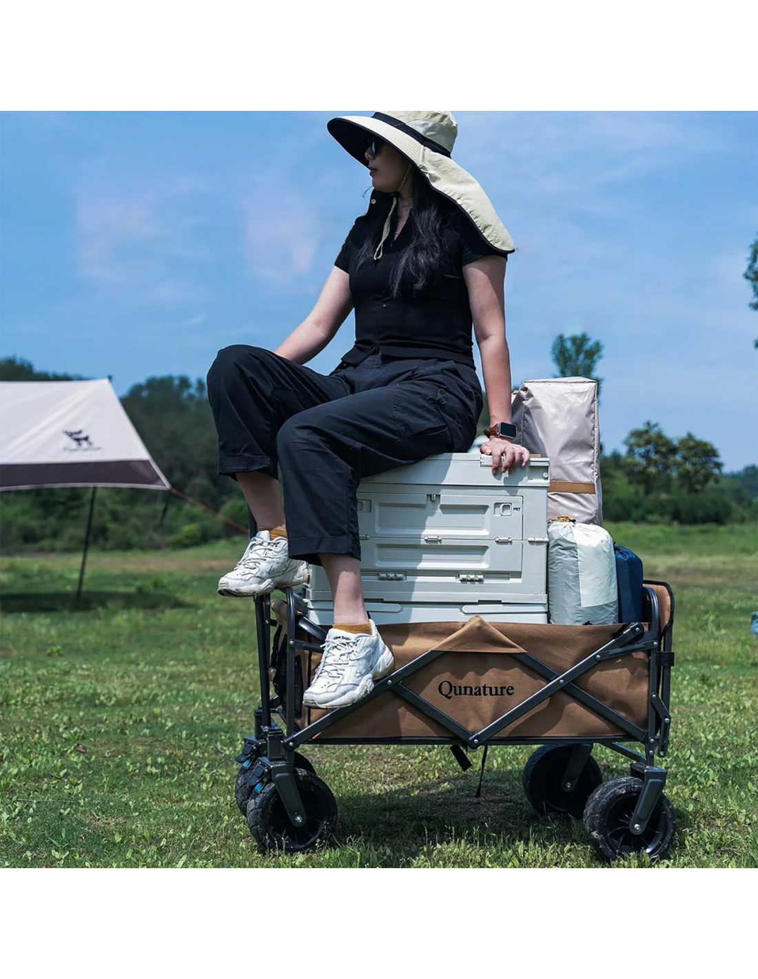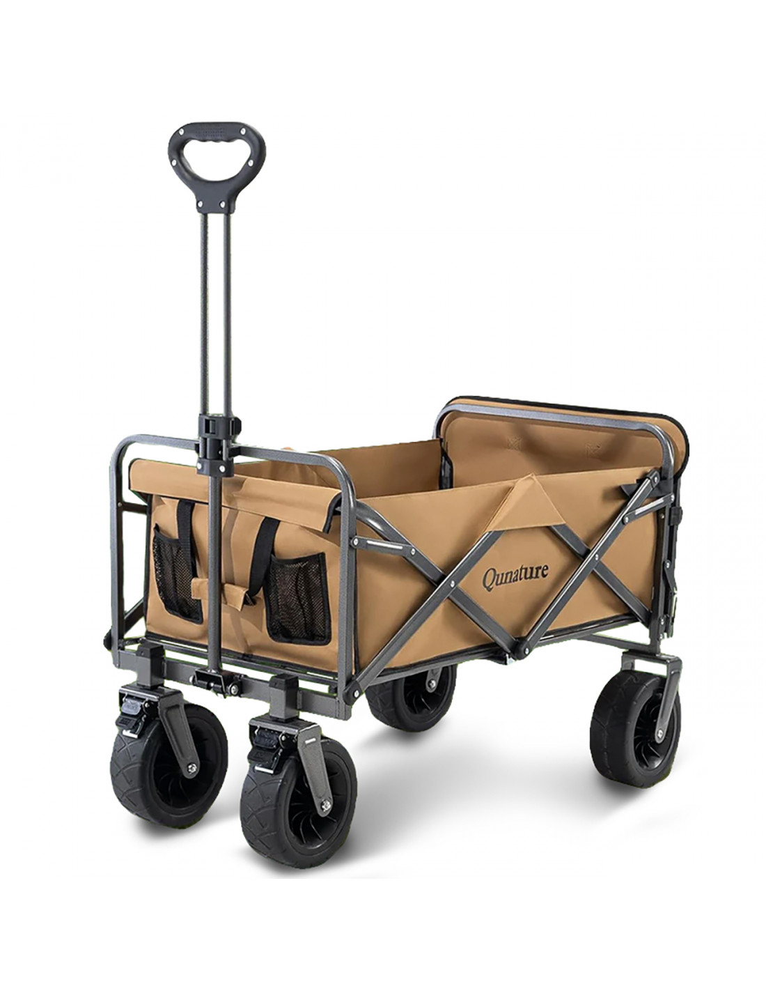 „Qunature“ kelioninis vežimėlis yra nepakeičiamas palydovas bet kokiai veiklai lauke – nuo stovyklavimo ir kelionių paplūdimyje iki sodininkystės ir apsipirkimo. Dėl tvirto plieninio rėmo ir didelės keliamosios galios iki 150 kg lengvai transportuosite viską, ko jums reikia. Sulankstomas dizainas su greito atleidimo funkcija leidžia lengvai transportuoti ir laikyti, o ergonomiška, reguliuojama rankena užtikrina patogų naudojimą. Vežimėlis aprūpintas dideliais, lanksčiais, visureigiais ratais su fiksavimo mechanizmais , kurie tinka įvairiems paviršiams. Talpa iki 180 litrų ir šoninės tinklinės kišenės leis dar geriau išlikti organizuotam. Patvarus 600D Oksfordo audinys, modernus dizainas ir apgalvotos detalės paverčia „Qunature“ tobulu stiliaus ir patikimumo deriniu.