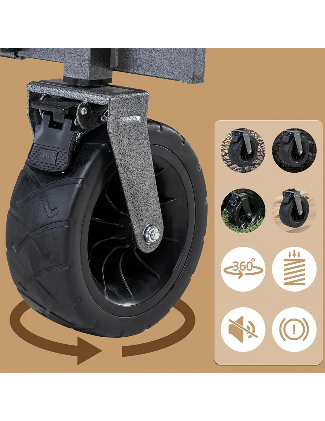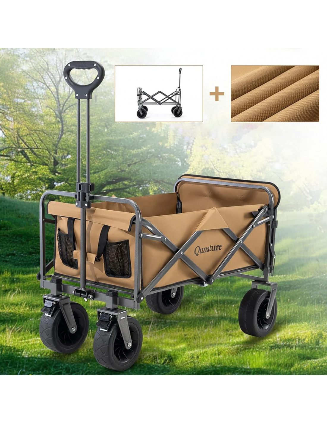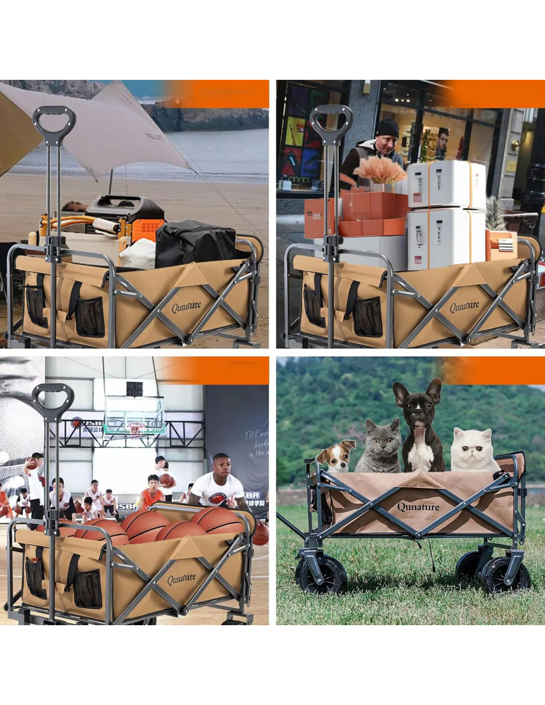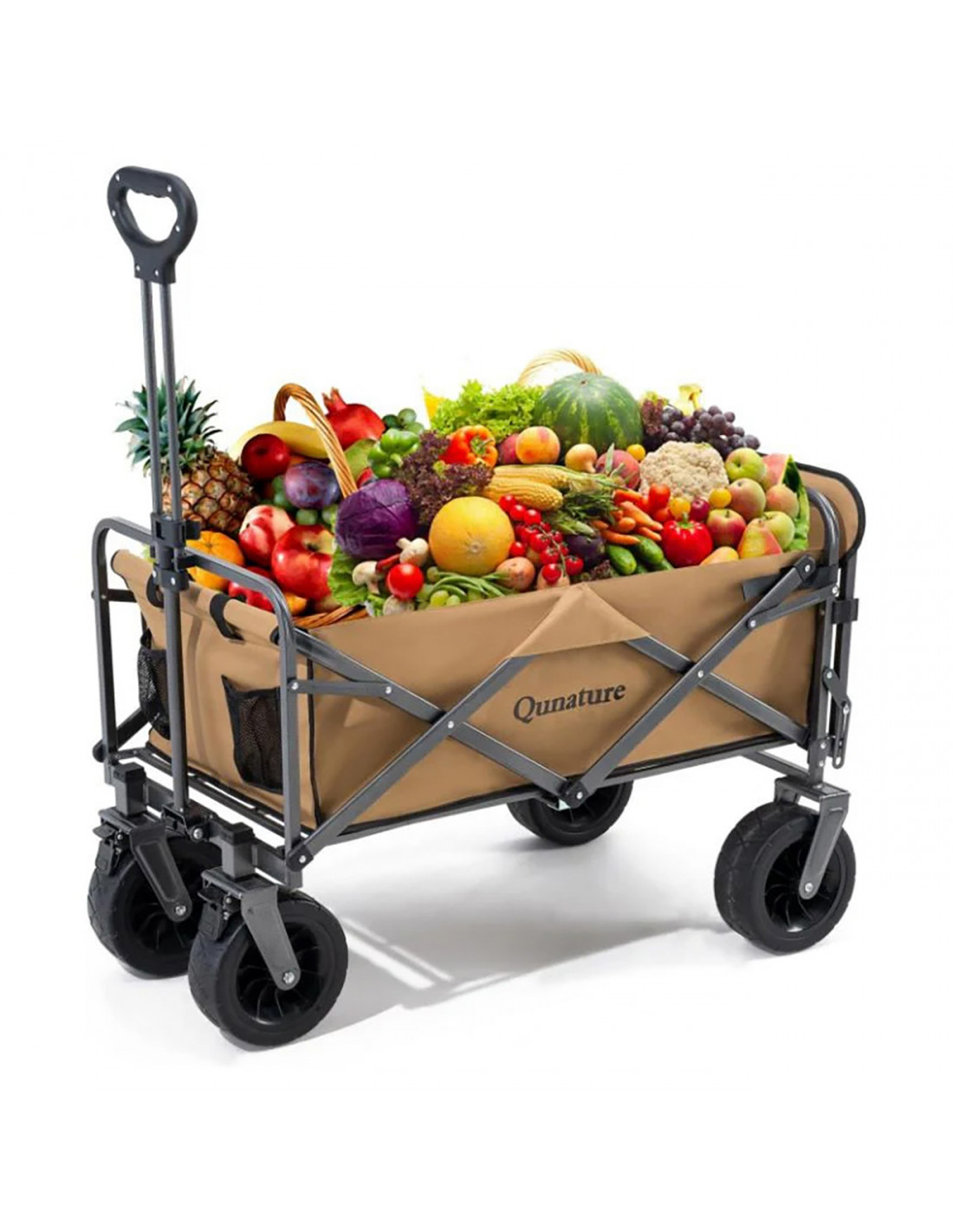 „Qunature“ kelioninis vežimėlis yra nepakeičiamas palydovas bet kokiai veiklai lauke – nuo stovyklavimo ir kelionių paplūdimyje iki sodininkystės ir apsipirkimo. Dėl tvirto plieninio rėmo ir didelės keliamosios galios iki 150 kg lengvai transportuosite viską, ko jums reikia. Sulankstomas dizainas su greito atleidimo funkcija leidžia lengvai transportuoti ir laikyti, o ergonomiška, reguliuojama rankena užtikrina patogų naudojimą. Vežimėlis aprūpintas dideliais, lanksčiais, visureigiais ratais su fiksavimo mechanizmais , kurie tinka įvairiems paviršiams. Talpa iki 180 litrų ir šoninės tinklinės kišenės leis dar geriau išlikti organizuotam. Patvarus 600D Oksfordo audinys, modernus dizainas ir apgalvotos detalės paverčia „Qunature“ tobulu stiliaus ir patikimumo deriniu.