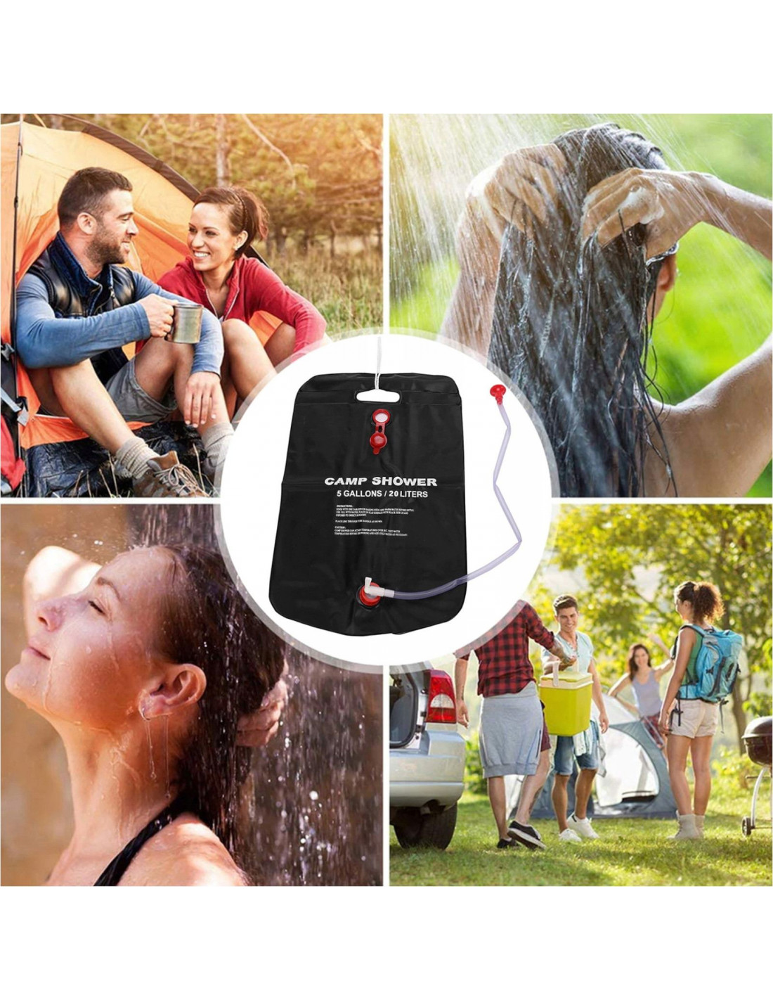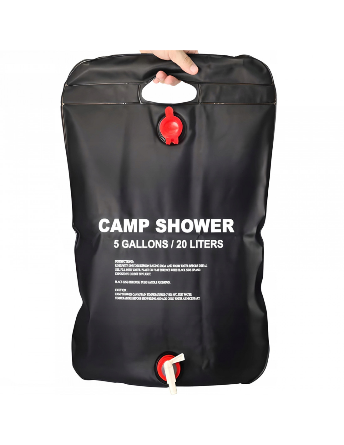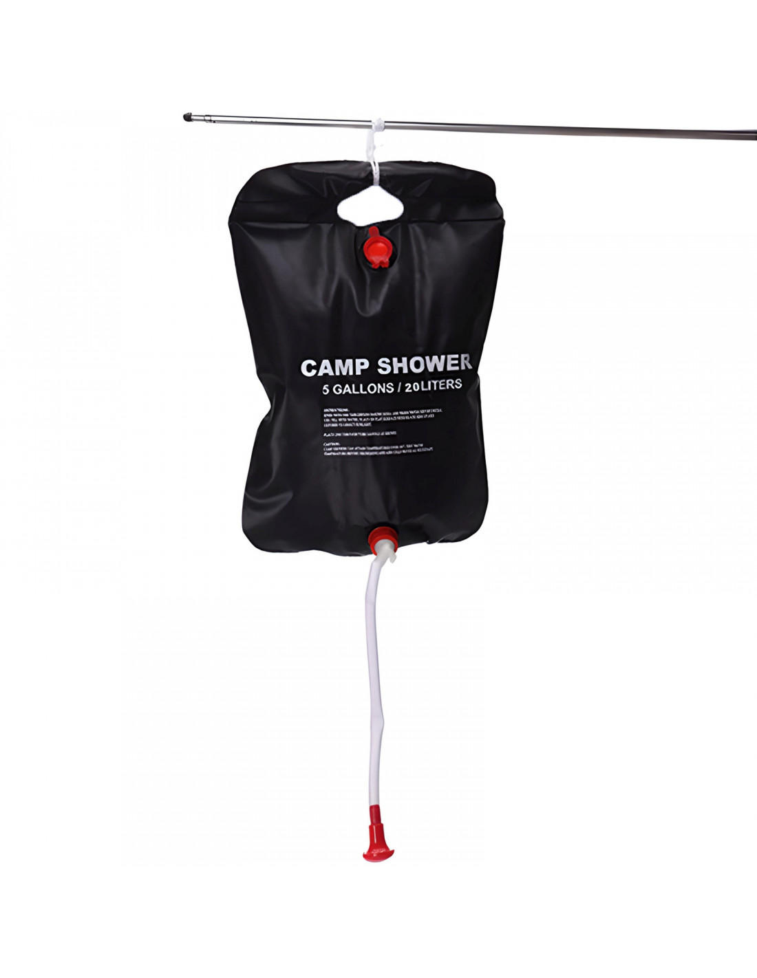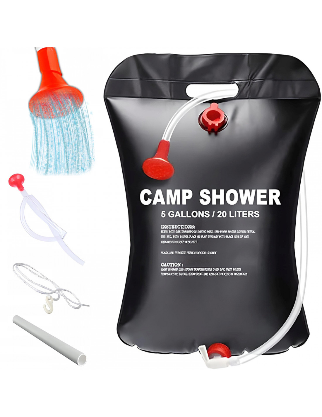 Šis 20 litrų talpos saulės energija varomas kempingo dušas yra praktiškas sprendimas tiems, kurie laiką leidžia stovyklaudami, name ant ratų, soduose ar ekspedicijoje. Juodo PVC pagamintas krepšys naudoja saulės šviesą vandeniui šildyti iki 50 °C, užtikrindamas patogias maudynes be tekančio vandens. Dušą galima lengvai pakabinti ant šakos, vamzdžio ar kito išsikišusio objekto naudojant pridedamą virvelę.