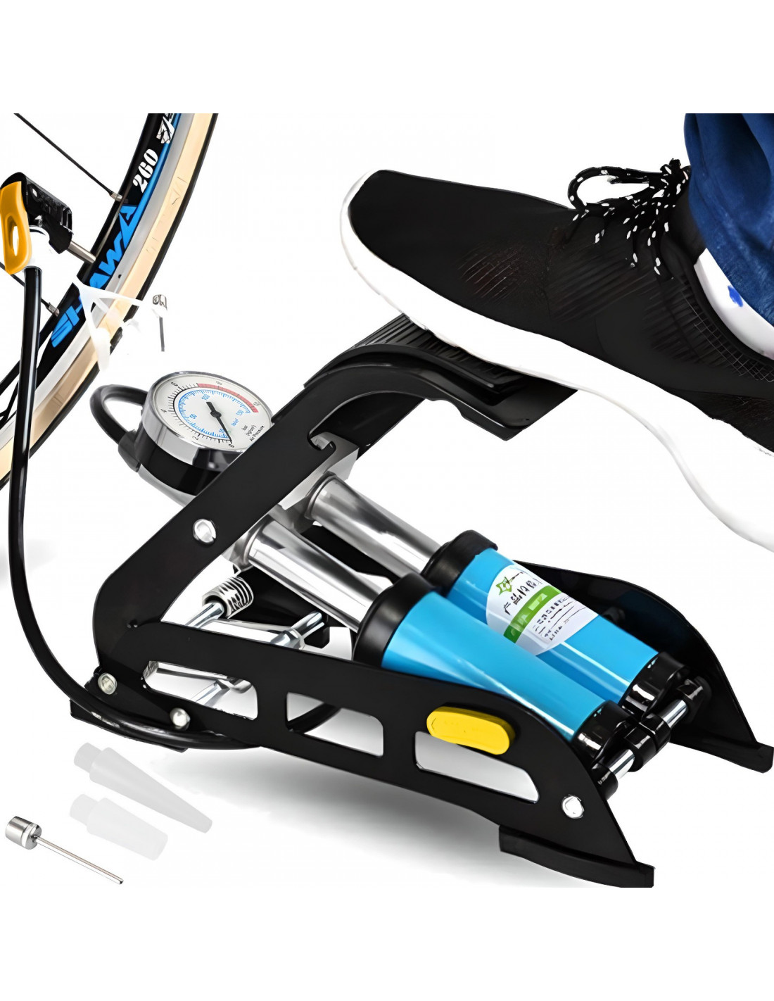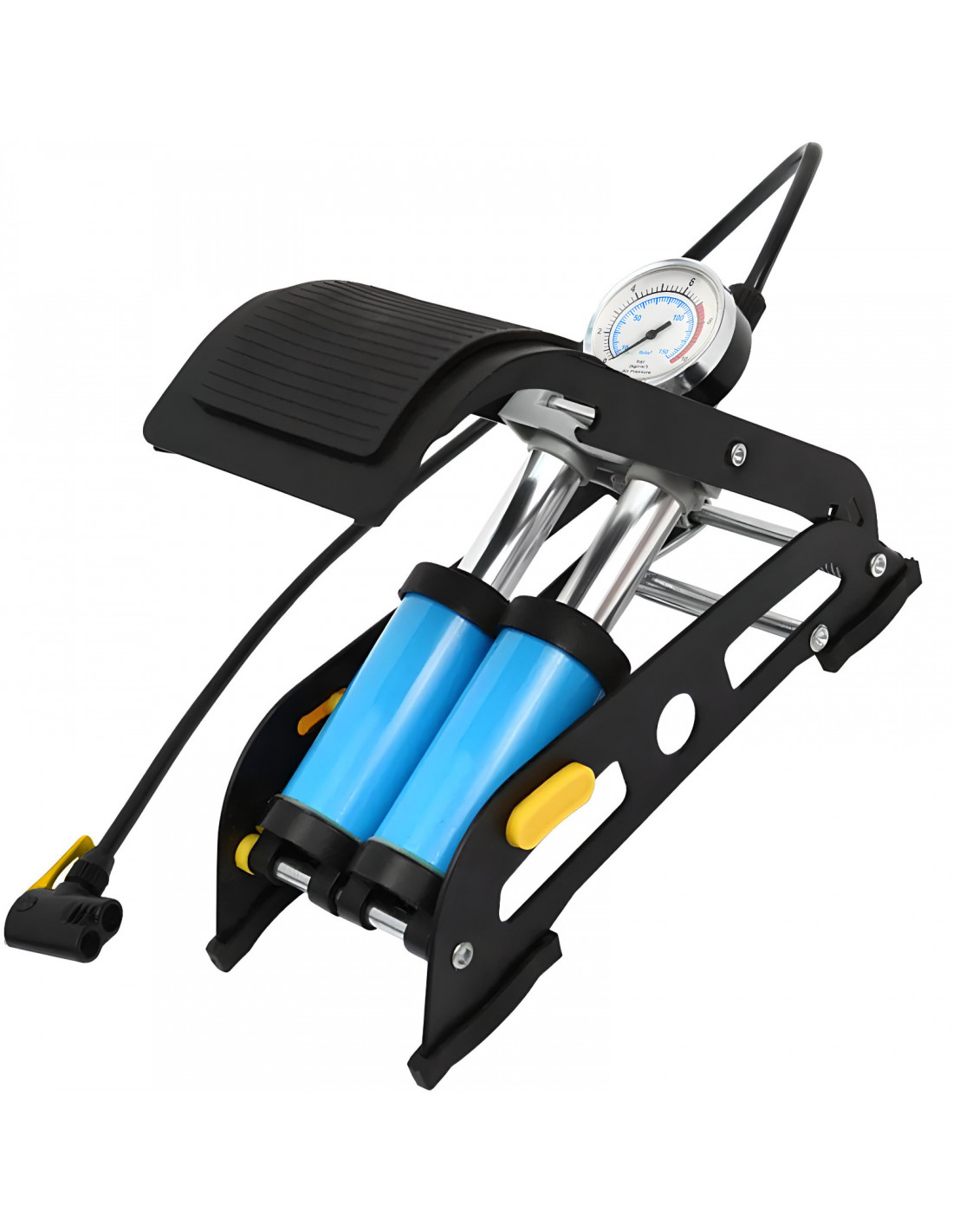 Šis universalus dviejų stūmoklių kojinis siurblys yra patikimas ir efektyvus prietaisas lengviesiems automobiliams ir mikroautobusams, dviračiams, kamuoliams, čiužiniams ir pripučiamiems žaislams pripūsti. Įrengtas 10 barų slėgio matuoklis užtikrina tikslų slėgio valdymą. Tvirta plieninė konstrukcija, neslystanti pėdelė ir kompaktiškas sulankstomas dizainas užtikrina paprastą naudojimą ir ilgą tarnavimo laiką. Dviejų stūmoklių konstrukcija užtikrina greitą ir efektyvų pripūtimą.