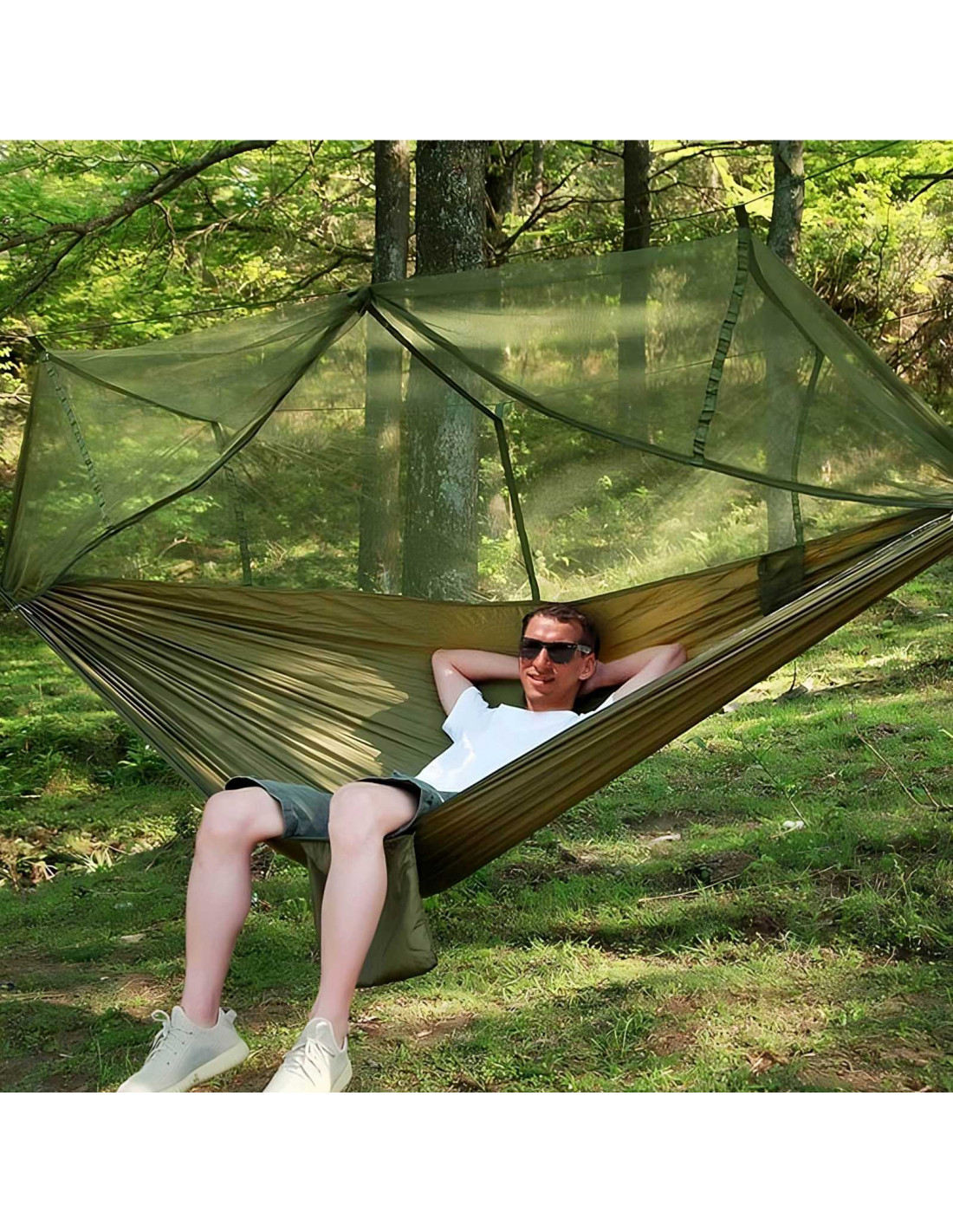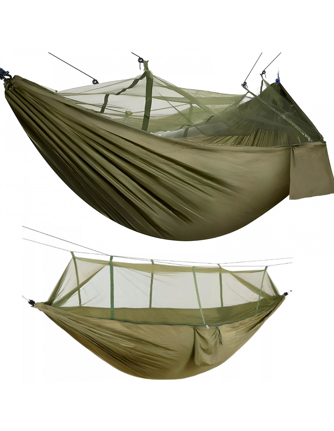 Šis lengvas ir kompaktiškas hamakas su tinklu puikiai tinka ekspedicijoms, stovyklavimui, žygiams pėsčiomis ir poilsiui gamtoje. Pagamintas iš patvaraus 210T karinės klasės parašiutinio nailono , jis užtikrina patogų poilsį ir apsaugą nuo vabzdžių dėl įmontuoto tinklelio nuo uodų. Lengvai surenkamas ir nešiojamas, garantuoja stabilumą net ir esant maksimaliai apkrovai.