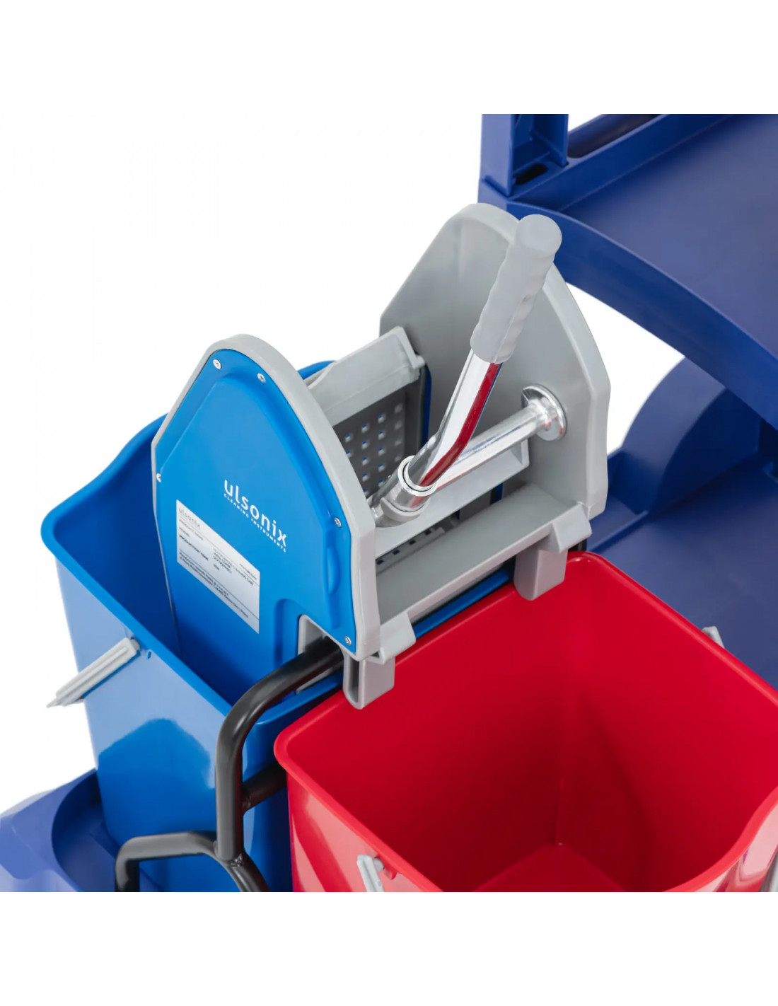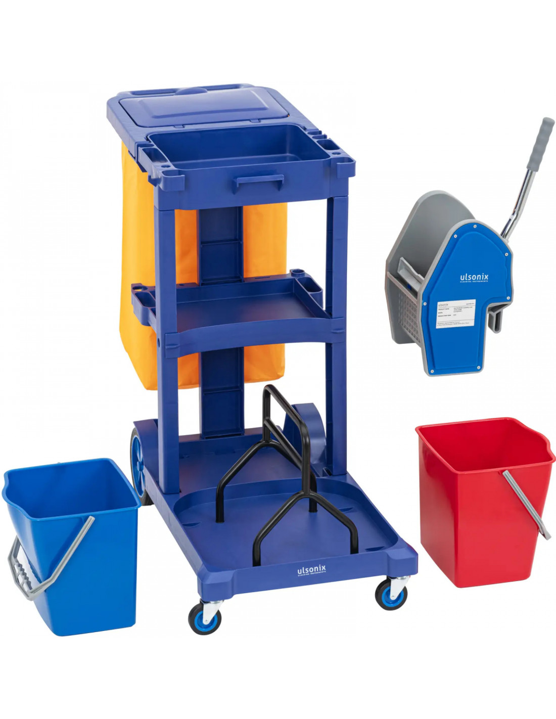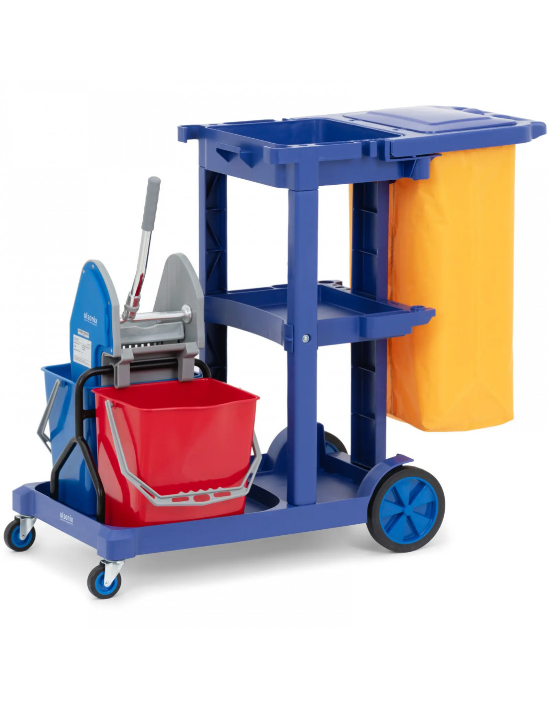 „UIsonix“ valymo vežimėlis žavi savo higienišku funkcionalumu ir didele talpa. Du spalvomis koduoti kibirai, kurių bendra talpa yra 18 litrų, leidžia efektyviai atskirti švarų ir nešvarų vandenį. Vandeniui atsparus 65 litrų maišas su dangčiu idealiai tinka šiukšlėms išmesti ar nešvariems skalbiniams transportuoti. Dėl tvirtos konstrukcijos ir praktiško išdėstymo jis bus nepakeičiamas darbo įrankis. Ypač didelės kibirų angos ir tvirtos rankenos užtikrina patogų valdymą. Dėl stabilios konstrukcijos ir iki 200 kg keliamosios galios valymo vežimėlis pateisina visus lūkesčius net ir sudėtingiausioje aplinkoje. Vežimėlis tinka iki 19 cm skersmens šluostėms , kurias lengva įdėti į integruotą gręžtuvą , kad išspaustų vandens perteklių. Keturi sklandžiai važiuojantys ratukai ir ergonomiška rankena leidžia lengvai manevruoti aptarnavimo vežimėliu net ankštose vietose ar pilnai pakrautą. Trys lentynos su ratlankiais suteikia papildomos vietos valymo priemonėms ir priedams laikyti. Šis valymo vežimėlis sujungia aukštus higienos standartus, patvarumą ir intuityvų valdymą. Šios savybės daro jį patikimu partneriu profesionaliam naudojimui.