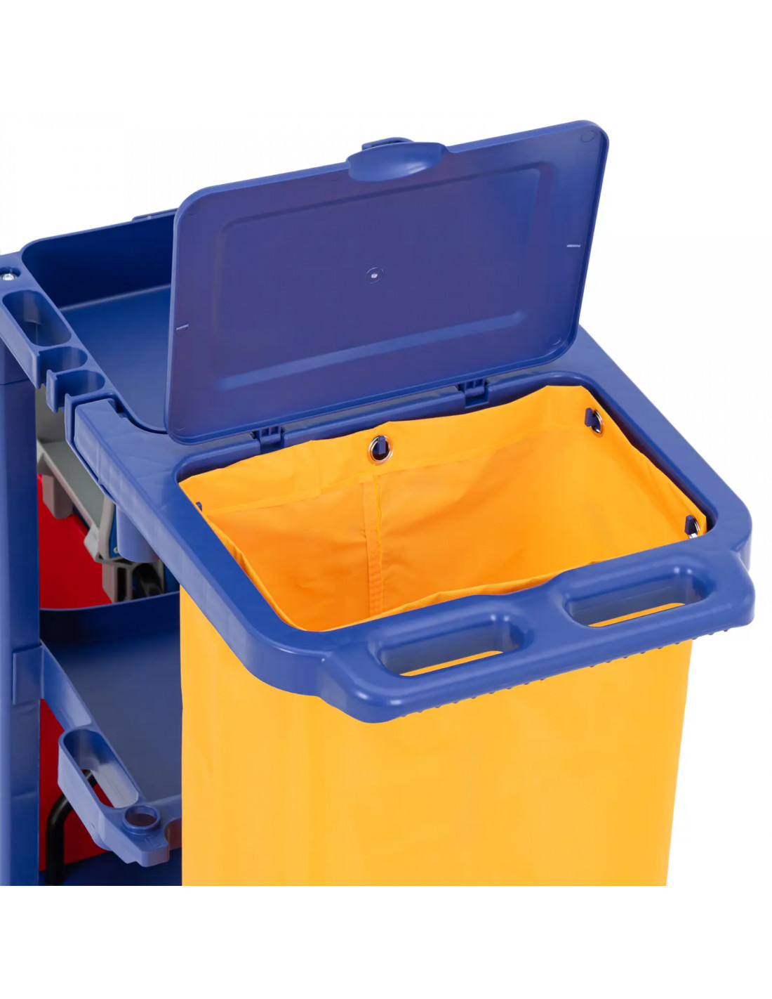 - - Valymo vežimėlis turi 2 spalvingus kibirus, kurių bendra talpa yra 18 litrų, ir 65 litrų talpos vandeniui atsparų maišą su dangčiu,