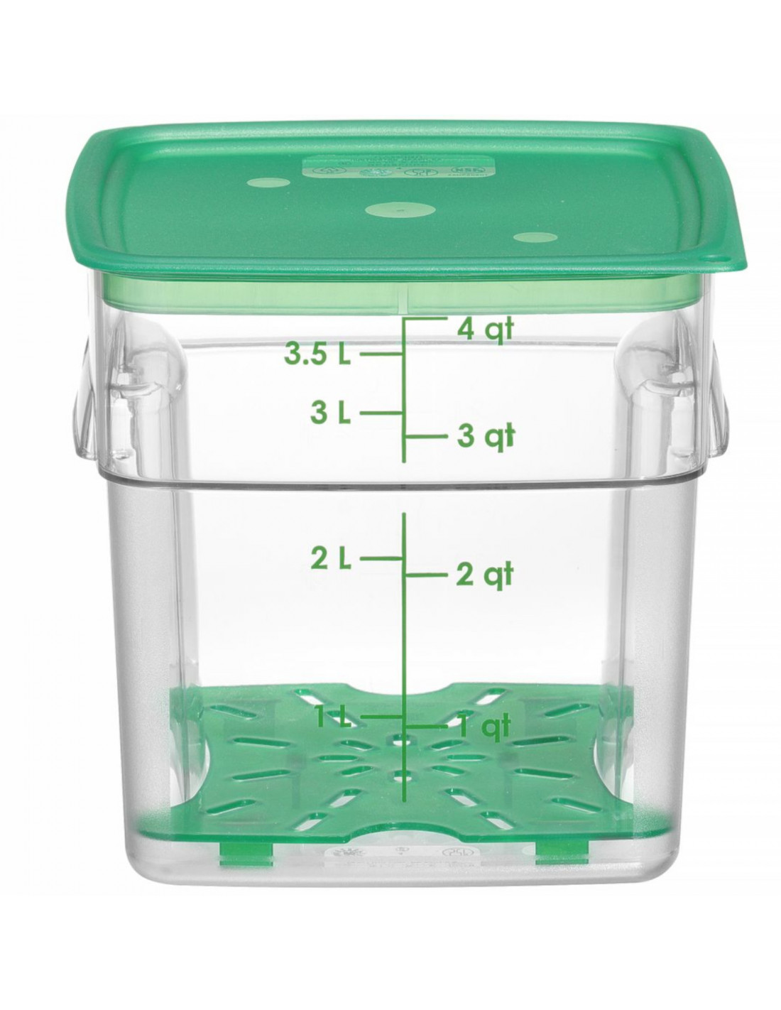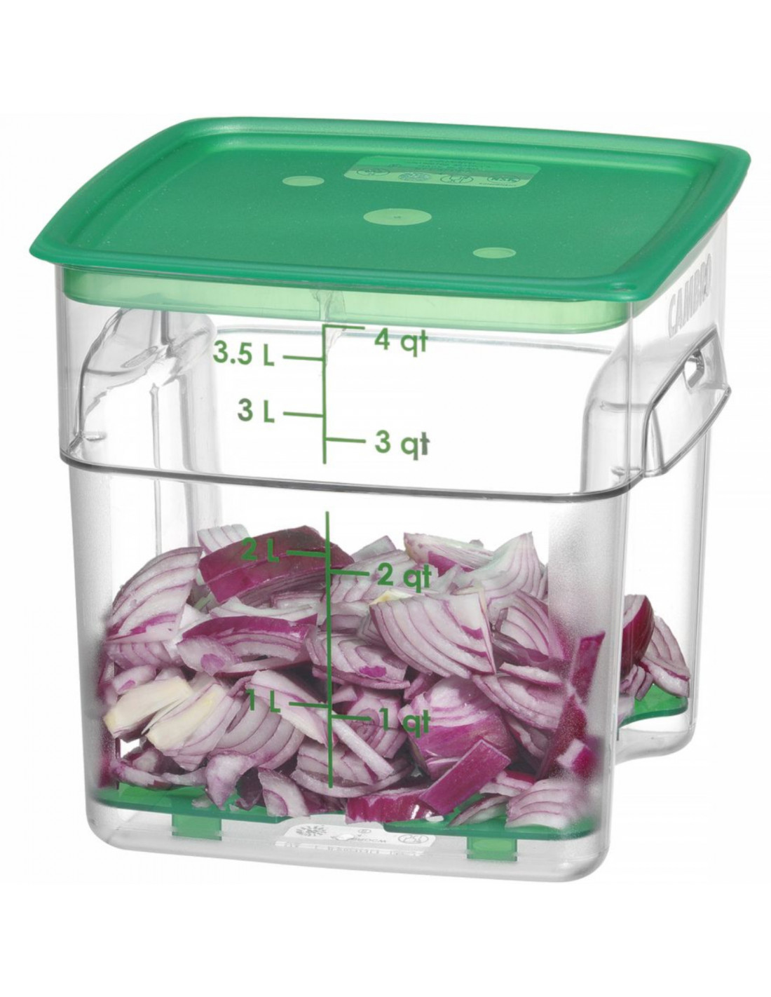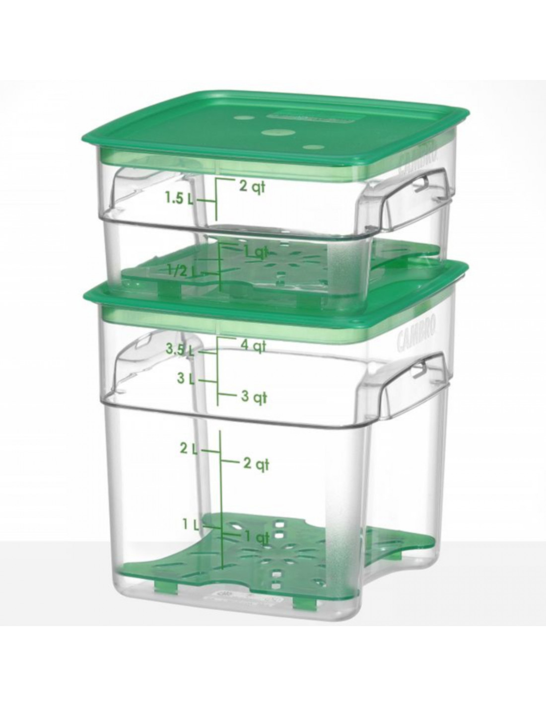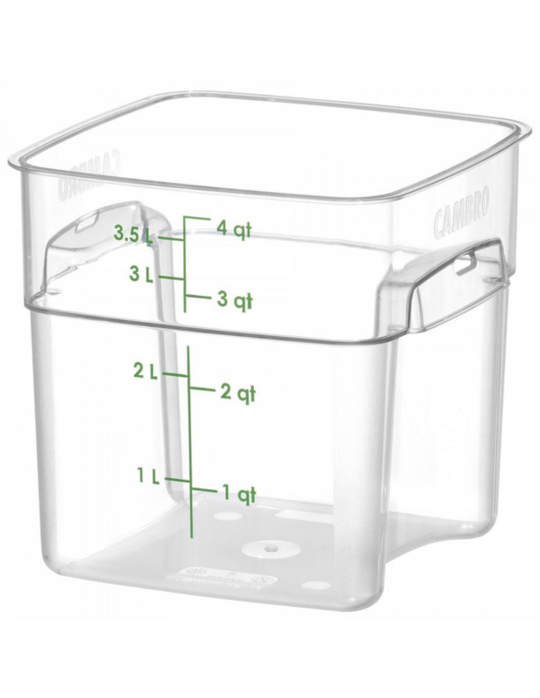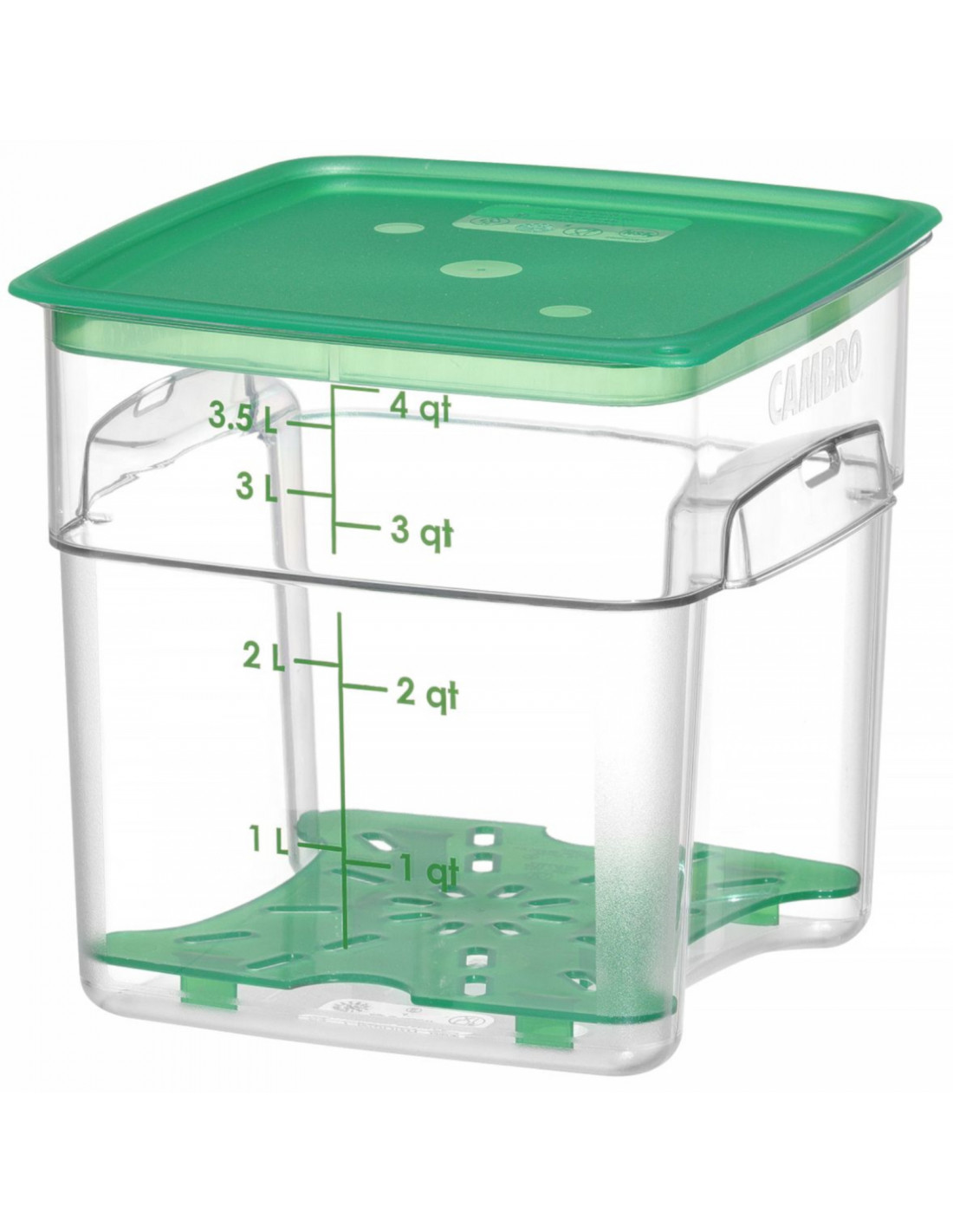„Cambro“ „CamSquaresreg; Fresh Pro“ maisto indas yra daugkartinio naudojimo ir ekologiškas sprendimas, skirtas pailginti maisto galiojimo laiką. Tinka šlapiam ir sausam maistui , idealiai tinka žolelėms ir prieskoniams, daržovėms, mėsai, jūros gėrybėms ir skysčiams laikyti. Pagamintas iš polikarbonato – medžiagos, atsparios spalvos pakitimams, maisto rūgštims ir kvapams, – indas yra neįtikėtinai patvarus, todėl idealiai tinka profesionalioms virtuvėms. Tekstūruotos šoninės pusės, užapvalinti kampai ir ergonomiškos rankenos užtikrina patogų naudojimą. Dangteliai parduodami atskirai .
