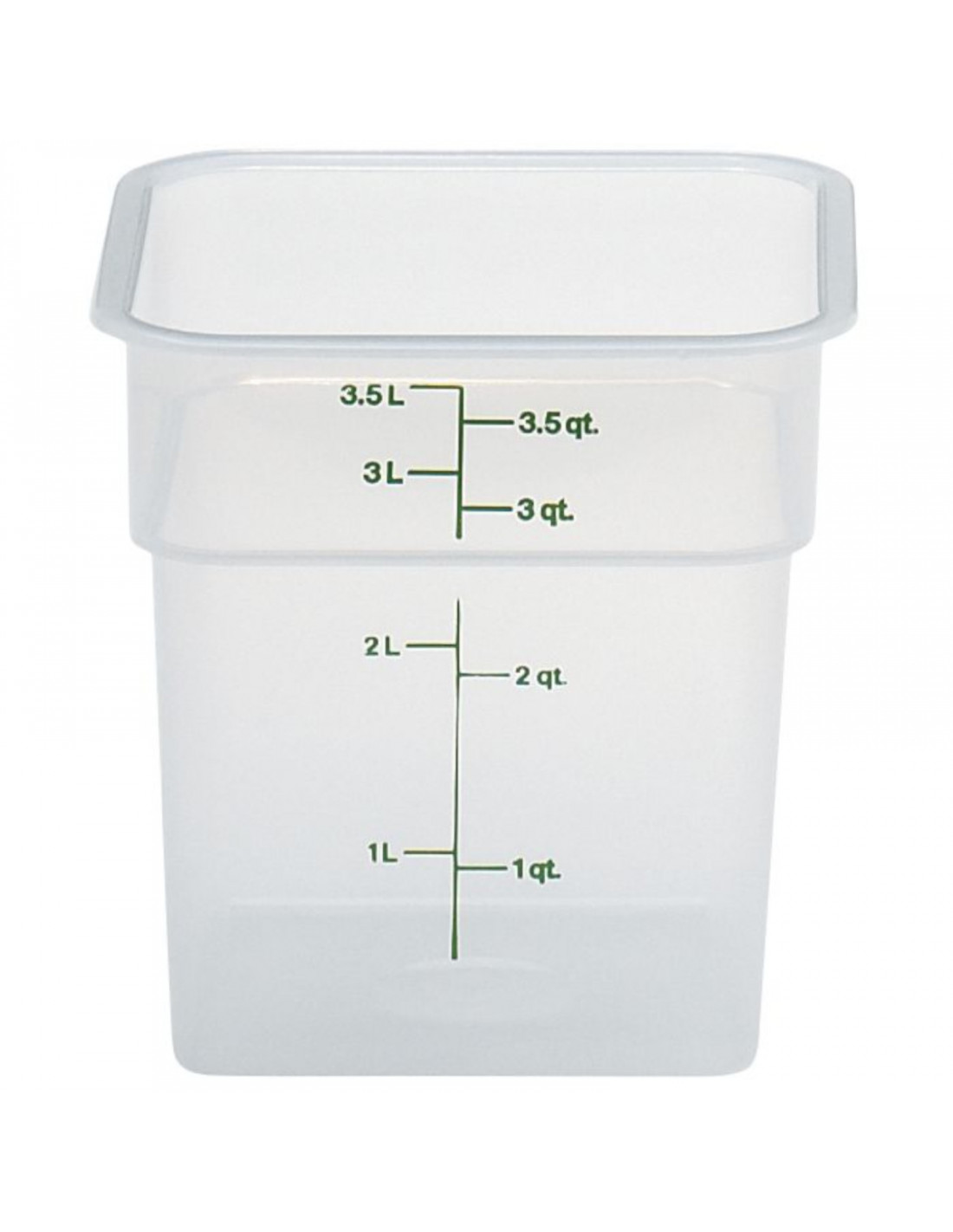 Skaidrus polipropileno maisto konteineris „Cambro“ „CamSquarereg“ puikiai tinka įvairiems maisto produktams laikyti ir virtuvei sutvarkyti. Dėl didelio atsparumo karščiui jis tinka naudoti šaldymo spintelėse.