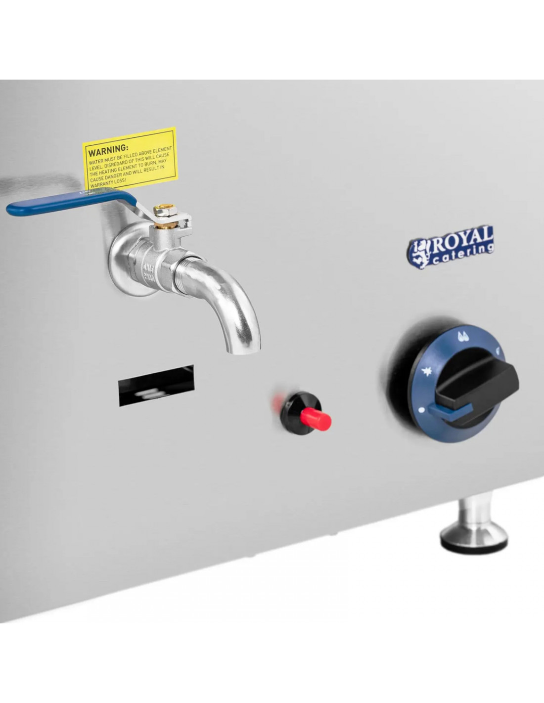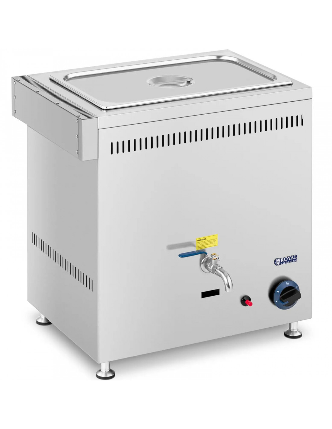 „Royal Catering“ dujinė vandens šildytuvas leidžia pašildyti ir palaikyti optimalią temperatūrą dideliems karšto maisto kiekiams. Jis puikiai tinka patiekti mėsą, žuvį, daržoves, ryžius, bulves ir padažus neprideginant. Sukurtas viešbučių restoranams, valgykloms, maitinimo renginiams, užkandinėms, kavinėms, senelių namams ir klinikoms, vandens šildytuvas veikia konvekcijos principu: kaitinimo elementas šildo vandenį tarp prietaiso ir GN indo, perduodamas šilumą į indą. Tai leidžia net ir gležnus maisto produktus ne tik efektyviai pašildyti, bet ir ilgą laiką išlaikyti šiltus, nerizikuojant pridegti. GN 1/1 indas su dangčiu yra 150 mm gylio ir gali talpinti didelį kiekį maisto. Tai reiškia didelį laiko taupymą, ypač didelių renginių metu arba piko valandomis restoranuose, valgyklose ir viešbučiuose. Vandens šildytuvą galima lengvai pritaikyti prie jūsų poreikių, laisvai derinant skirtingų dydžių indus, kurių gylis yra 150 mm. Didelė 3300 W galia užtikrina greitą vandens pašildymą. Rankenėlė leidžia įjungti automatinį termostatą ir tiksliai nustatyti temperatūrą iki 100 °C. Bain-marie maitinamas gamtinėmis dujomis ir gali atlaikyti maksimalų 0,02 baro slėgį. Prietaisas pasižymi gerai apgalvotu dizainu ir patvariu korpusu, todėl yra patikimas ir nereikalaujantis daug priežiūros. Nerūdijančio plieno konstrukcija užtikrina ilgalaikį tarnavimą. Medžiaga turi lygų, lengvai valomą paviršių. Be to, ji atspari korozijai ir mechaniniams pažeidimams. Guminės kojelės suteikia stabilumo ir apsaugo nuo įbrėžimų.