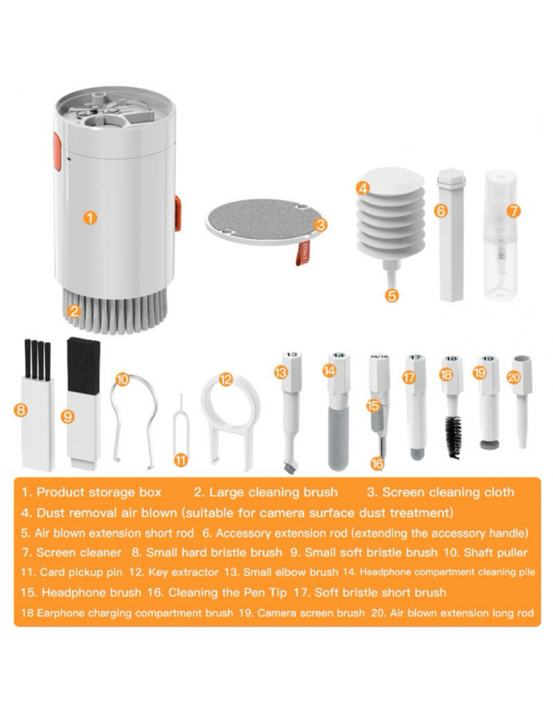 - - Universalumas : Rinkinyje yra net 20 elementų, kurie leidžia kruopščiai išvalyti įvairius paviršius ir įrenginius – nuo ekranų, ausinių iki klaviatūrų.