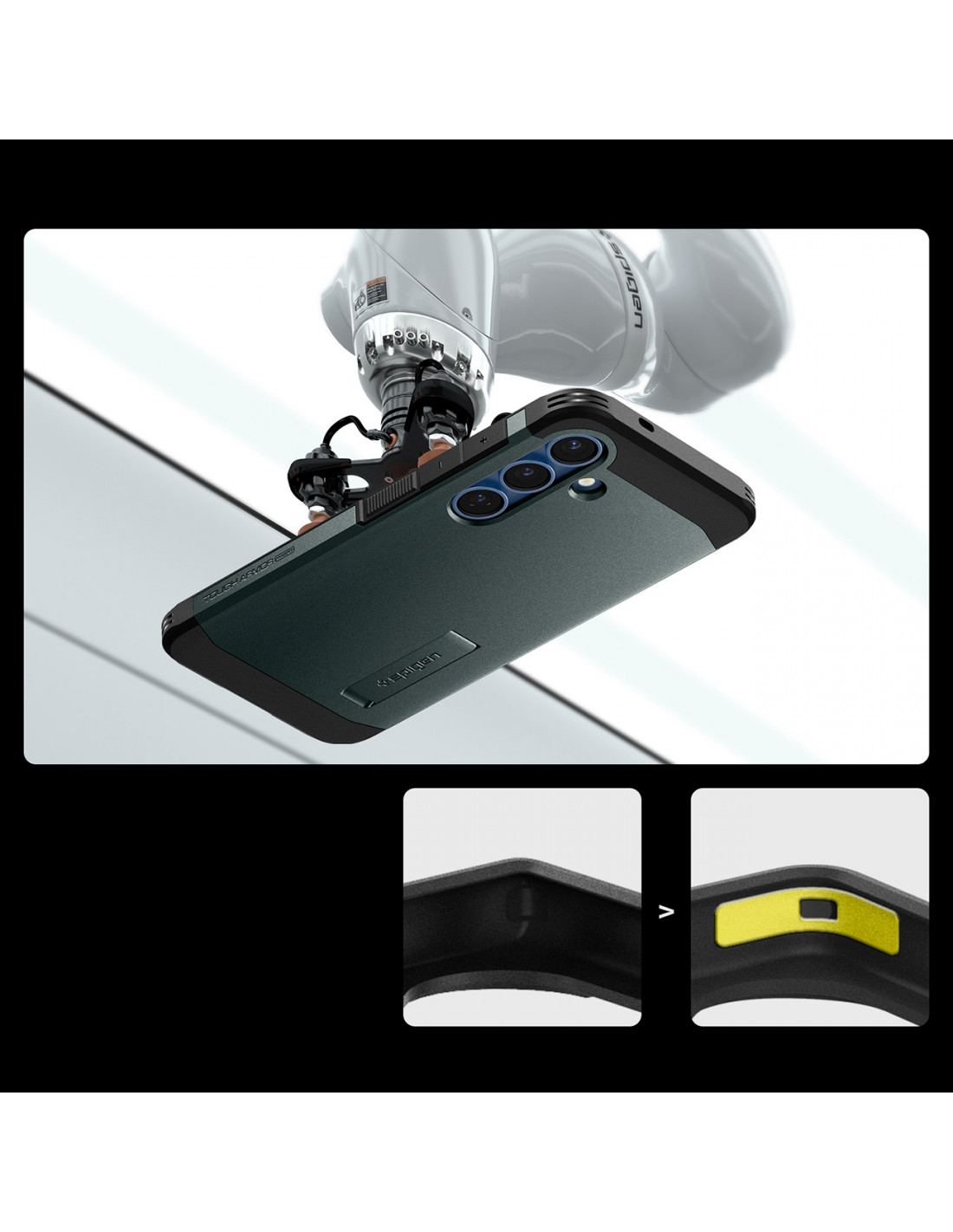 „Spigen“ „Tough Armor“ dėklas yra patobulinta savo pirmtako versija. Jame yra magnetinis žiedas, suderinamas su „MagSafe“ tvirtinimo ir belaidžio įkrovimo sistema, užtikrinantis greitą ir paprastą „Apple“ technologijų naudojimą. Dviejų dalių konstrukcija pagaminta iš dilimui atsparaus termoplasto ir sutvirtinančio polikarbonato rėmo. Dėklo viduje yra technologinis putplasčio paminkštinimas, kuris suteikia papildomą apsaugos sluoksnį nuo smūgių ar kritimų. Dėklas puikiai priglunda ir netrukdo belaidžiam įkrovimui. Šiek tiek pakelta konstrukcija aplink kamerą ir ekraną apsaugo jį nuo įbrėžimų, pakeliant telefoną šiek tiek virš lygaus paviršiaus. Jame yra mygtukų dangteliai ir angos prievadams. „Tough Armor“ dėklas buvo 26 kartus išbandytas kritimo metu iš 1,2 metro aukščio, todėl gavo Amerikos MIL-STD 810G-516.6 sertifikatą.