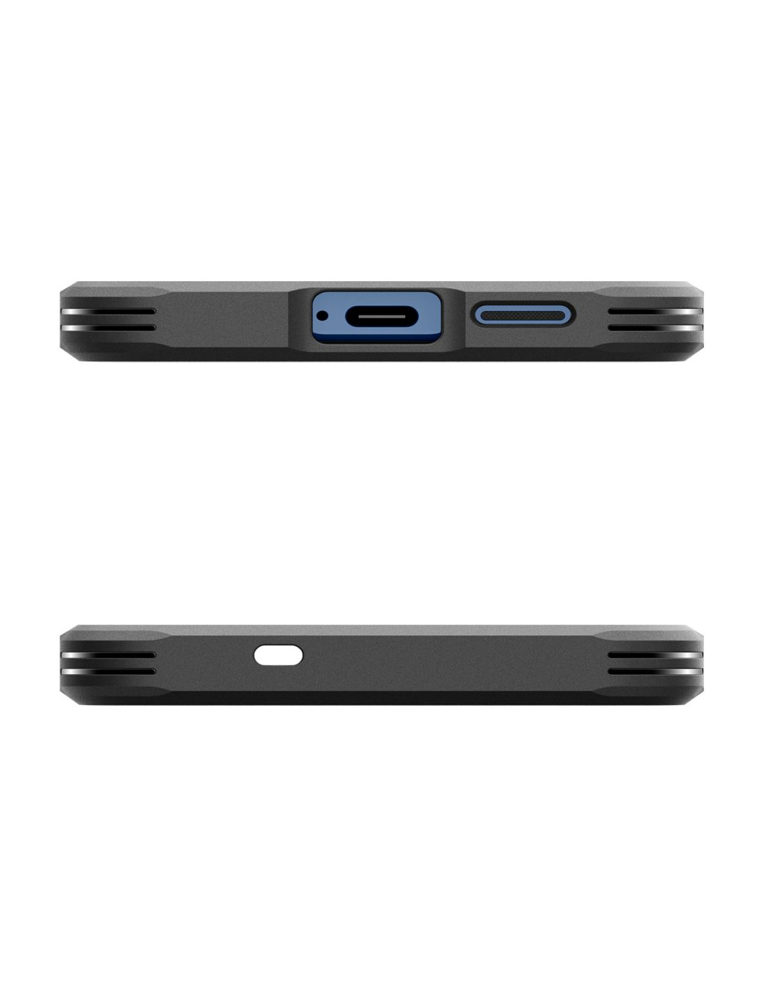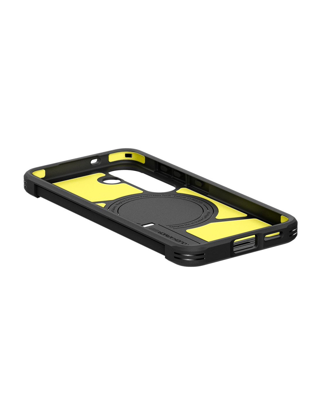 „Spigen“ „Tough Armor“ dėklas yra patobulinta savo pirmtako versija. Dėkle yra magnetinis žiedas, suderinamas su „MagSafe“ tvirtinimo ir belaidžio įkrovimo sistema , užtikrinantis greitą ir paprastą „Apple“ technologijų naudojimą. Jo dviejų dalių konstrukcija pagaminta iš dilimui atsparaus termoplasto ir sutvirtinančio polikarbonato rėmo. Dėklo viduje yra technologinis putplasčio paminkštinimas, kuris suteikia papildomą apsaugos sluoksnį nuo smūgių ar kritimų. Dėklas puikiai priglunda ir netrukdo belaidžiam įkrovimui. Šiek tiek pakelta konstrukcija aplink kamerą ir ekraną apsaugo juos nuo įbrėžimų, pakeliant telefoną šiek tiek virš lygaus paviršiaus. Jame yra mygtukų dangteliai ir angos prievadams . „Tough Armor“ dėklas buvo 26 kartus išbandytas kritimo metu iš 1,2 metro aukščio, todėl gavo Amerikos MIL-STD 810G-516.6 sertifikatą.