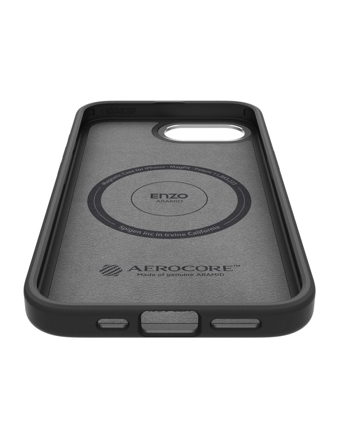 „Spigen Enzo Aramid Magsafe“ dėklas sujungia naujausias technologijas ir medžiagas, kad užtikrintų maksimalią išmaniojo telefono apsaugą neprarandant stilingos išvaizdos. Jis pagamintas iš pažangaus aramidinio pluošto , žinomo dėl išskirtinio patvarumo. Tiksli aliuminio apdaila ne tik suteikia unikalią išvaizdą, bet ir užtikrina papildomą apsaugą nuo smūgių ir pažeidimų. Sukurtas atsižvelgiant į minimalizmą, dėklas yra neįtikėtinai lengvas, todėl kišenėje ar rankoje nepajusite papildomo svorio. Dėkle yra žiedas, suderinamas su belaide „MagSafe“ technologija. Magnetinis žiedas užtikrina maksimalų įkrovimo efektyvumą ir greitą bei paprastą prijungimą prie visų „MagSafe“ palaikančių priedų.