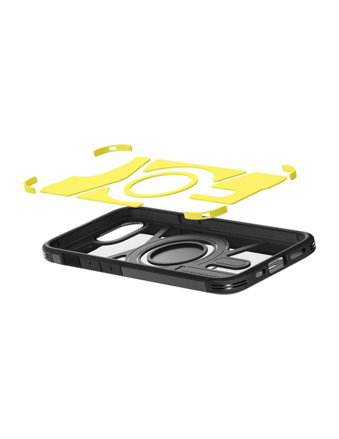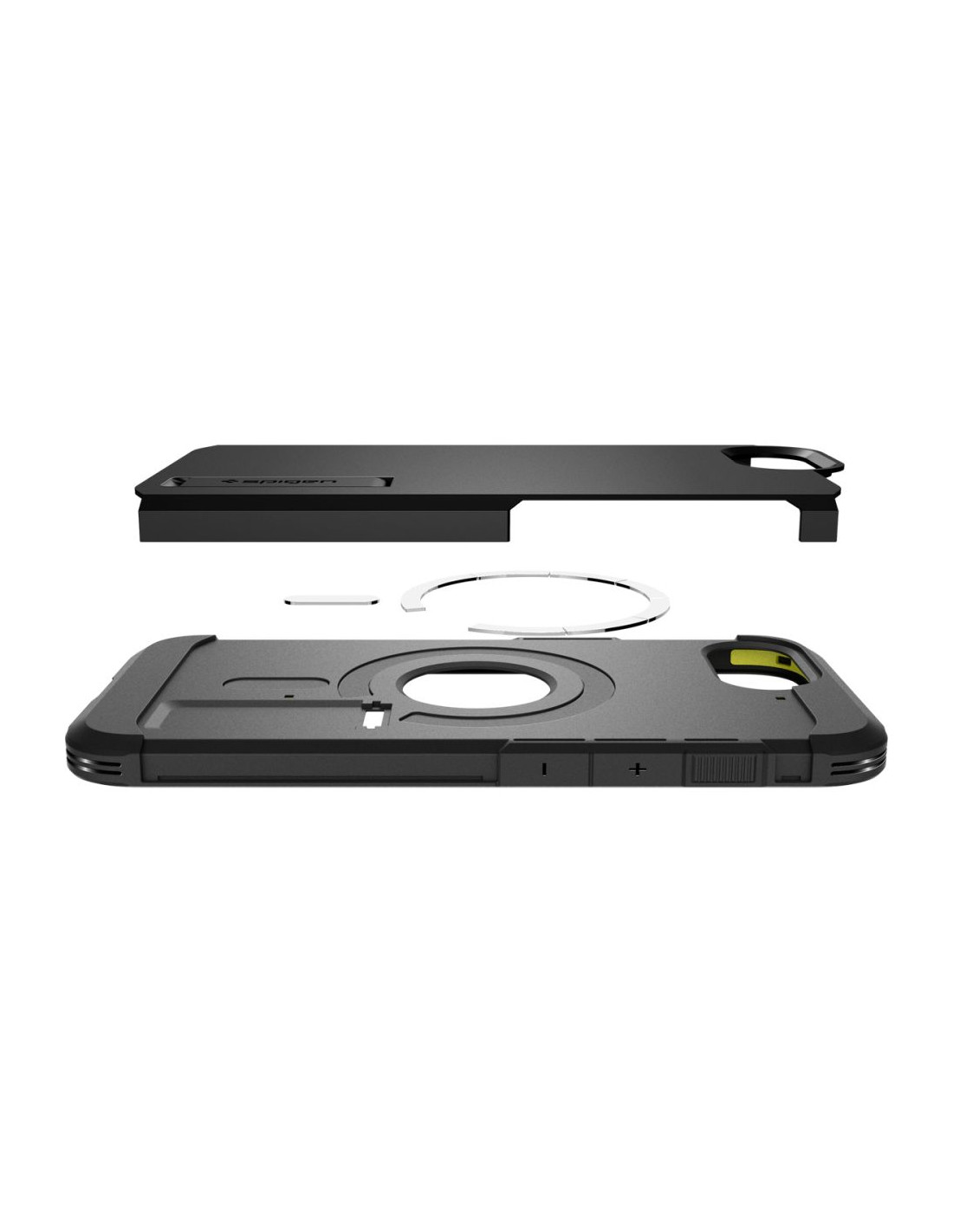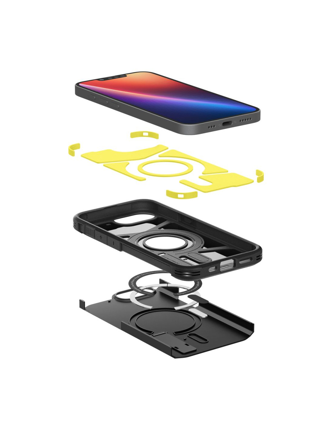 „Spigen“ „Tough Armor Mag“ dėklas yra patobulinta savo pirmtako versija. Jame yra magnetinis žiedas, suderinamas su belaidžio įkrovimo ir tvirtinimo sistema „MagSafe“ , užtikrinantis greitą ir paprastą „Apple“ technologijų naudojimą. Dviejų dalių konstrukcija pagaminta iš dilimui atsparaus termoplasto ir sutvirtinančio polikarbonato rėmo. Dėklo viduje yra technologinis putplasčio paminkštinimas, kuris suteikia papildomą apsaugos sluoksnį nuo smūgių ar kritimų. Dėklas puikiai priglunda ir netrukdo belaidžiam įkrovimui. Šiek tiek pakelta konstrukcija aplink kamerą ir ekraną apsaugo jį nuo įbrėžimų, pakeliant telefoną šiek tiek virš lygaus paviršiaus. Jame yra mygtukų dangteliai ir angos prievadams. „Tough Armor“ dėklas buvo 26 kartus išbandytas kritimo metu iš 1,2 metro aukščio, todėl gavo Amerikos MIL-STD 810G-516.6 sertifikatą.