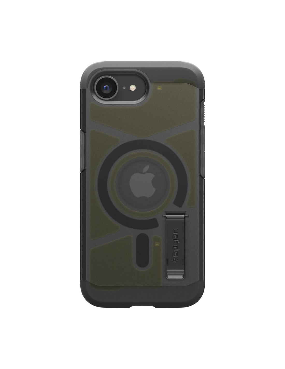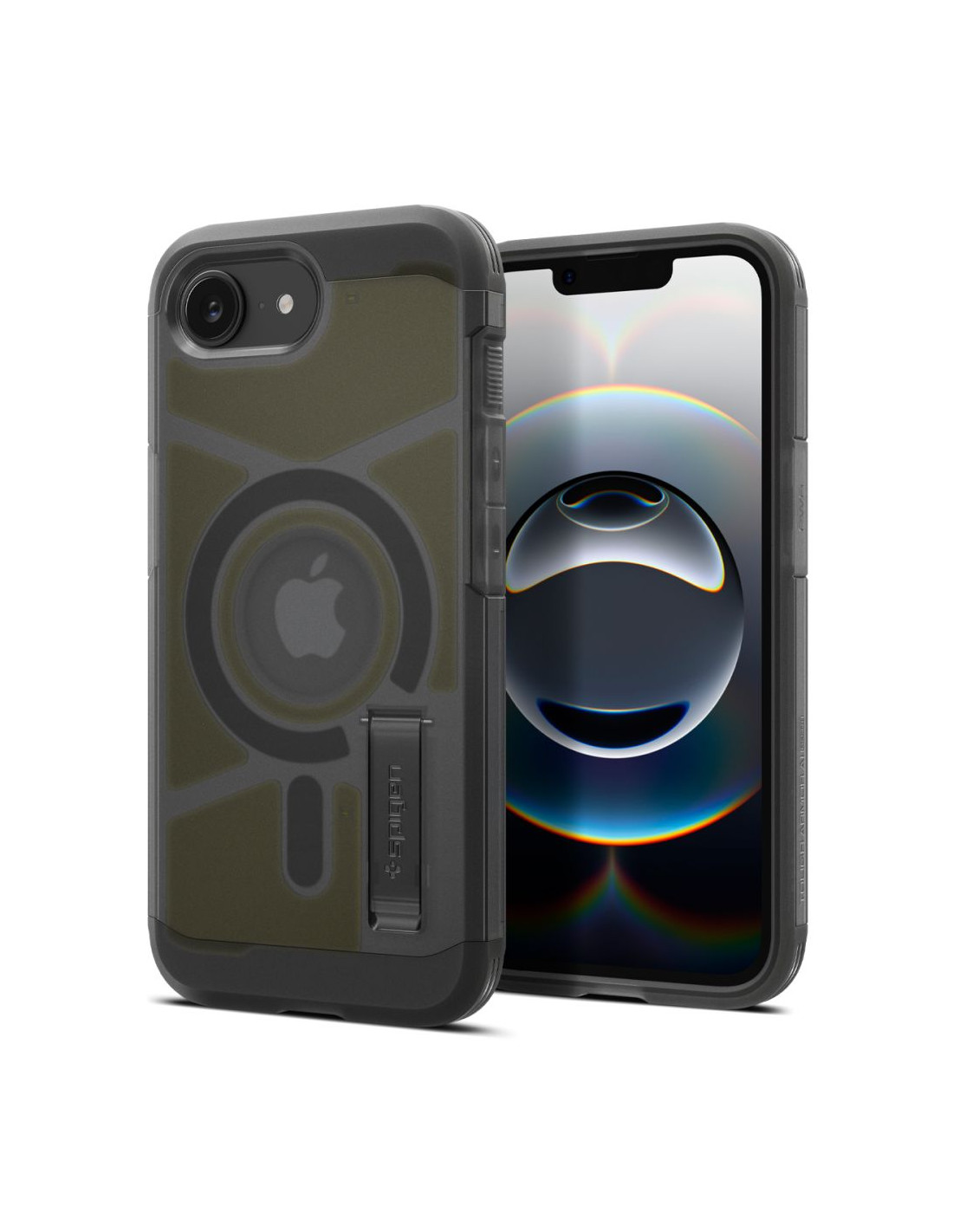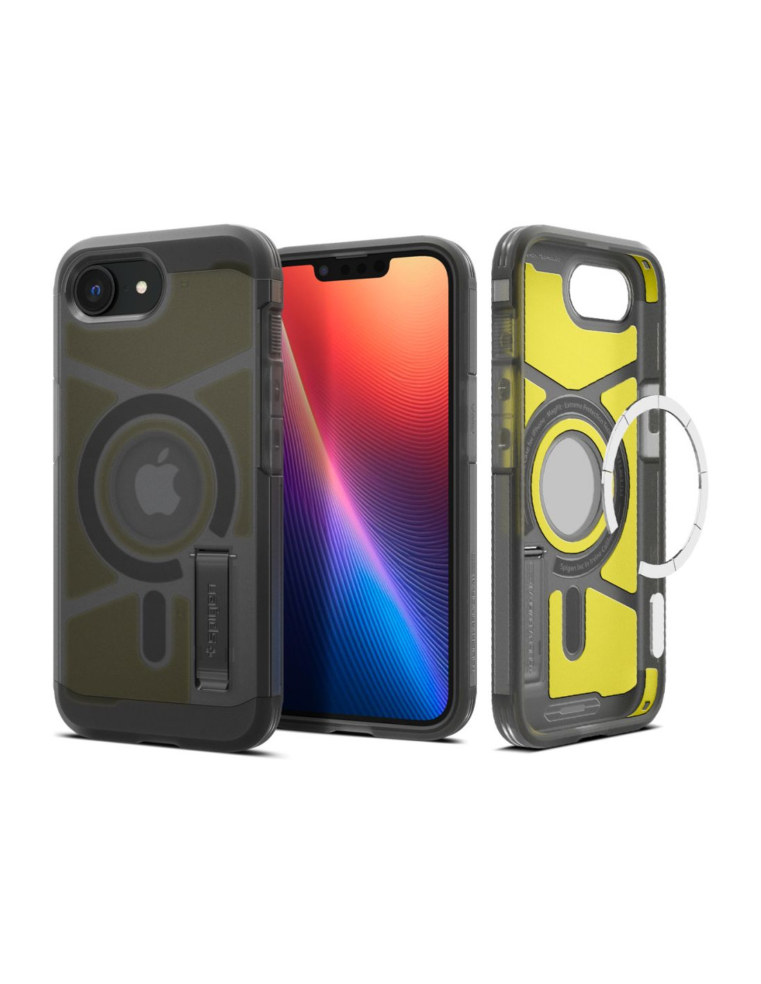 „Spigen“ „Tough Armor“ dėklas yra patobulinta savo pirmtako versija. Jame yra magnetinis žiedas, suderinamas su „MagSafe“ tvirtinimo ir belaidžio įkrovimo sistema , užtikrinantis greitą ir paprastą „Apple“ technologijų naudojimą. Dviejų dalių konstrukcija pagaminta iš dilimui atsparaus termoplasto ir sutvirtinančio polikarbonato rėmo. Dėklo viduje yra technologinis putplasčio paminkštinimas, kuris suteikia papildomą apsaugos sluoksnį nuo smūgių ar kritimų. Dėklas puikiai priglunda ir netrukdo belaidžiam įkrovimui. Šiek tiek pakelta konstrukcija aplink kamerą ir ekraną apsaugo juos nuo įbrėžimų, pakeliant telefoną šiek tiek virš lygaus paviršiaus. Jame yra mygtukų dangteliai ir angos prievadams. „Tough Armor“ dėklas buvo 26 kartus išbandytas kritimo metu iš 1,2 metro aukščio, todėl gavo Amerikos MIL-STD 810G-516.6 sertifikatą.