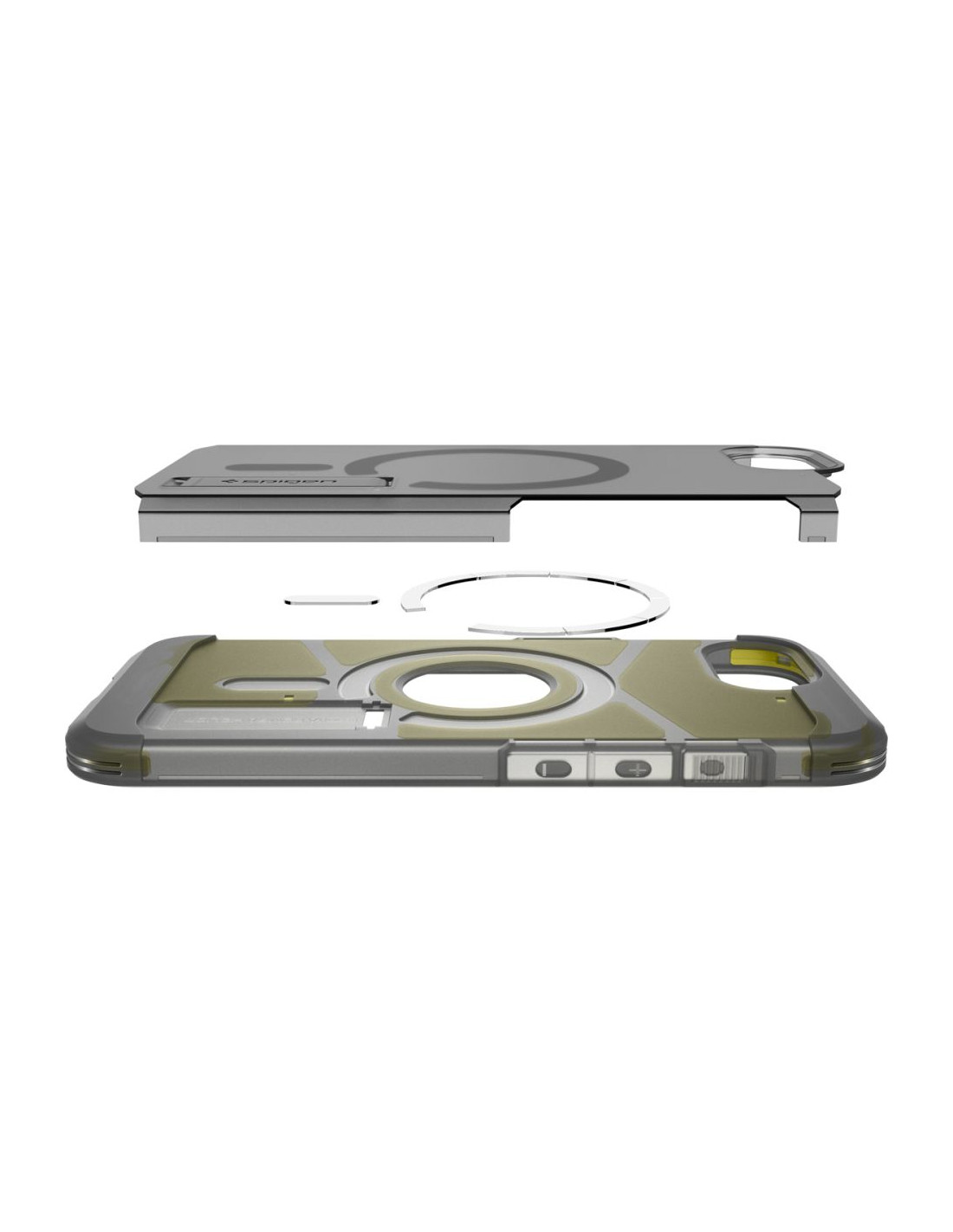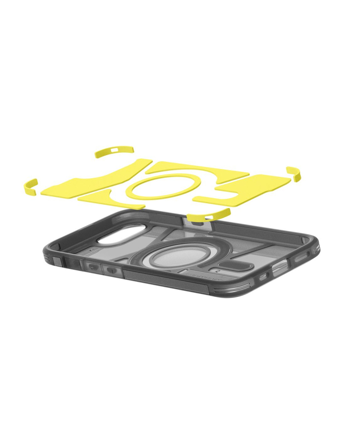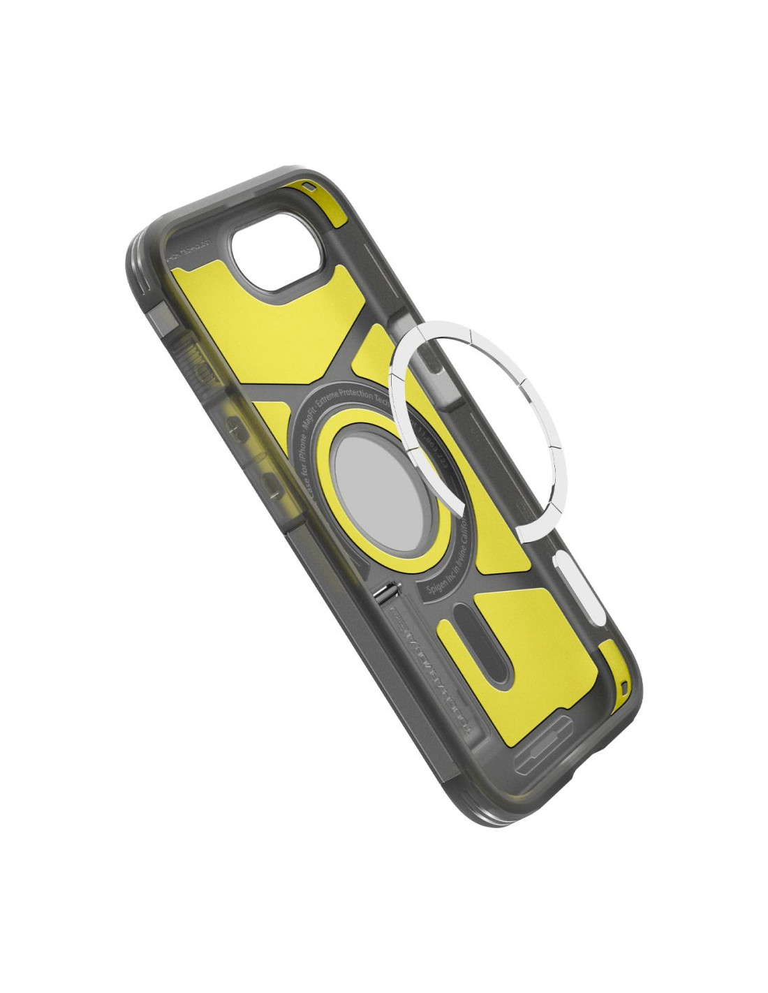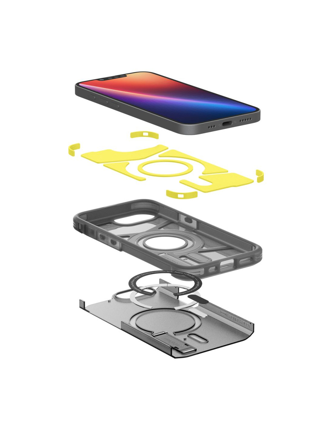 „Spigen“ „Tough Armor“ dėklas yra patobulinta savo pirmtako versija. Jame yra magnetinis žiedas, suderinamas su „MagSafe“ tvirtinimo ir belaidžio įkrovimo sistema , užtikrinantis greitą ir paprastą „Apple“ technologijų naudojimą. Dviejų dalių konstrukcija pagaminta iš dilimui atsparaus termoplasto ir sutvirtinančio polikarbonato rėmo. Dėklo viduje yra technologinis putplasčio paminkštinimas, kuris suteikia papildomą apsaugos sluoksnį nuo smūgių ar kritimų. Dėklas puikiai priglunda ir netrukdo belaidžiam įkrovimui. Šiek tiek pakelta konstrukcija aplink kamerą ir ekraną apsaugo juos nuo įbrėžimų, pakeliant telefoną šiek tiek virš lygaus paviršiaus. Jame yra mygtukų dangteliai ir angos prievadams. „Tough Armor“ dėklas buvo 26 kartus išbandytas kritimo metu iš 1,2 metro aukščio, todėl gavo Amerikos MIL-STD 810G-516.6 sertifikatą.