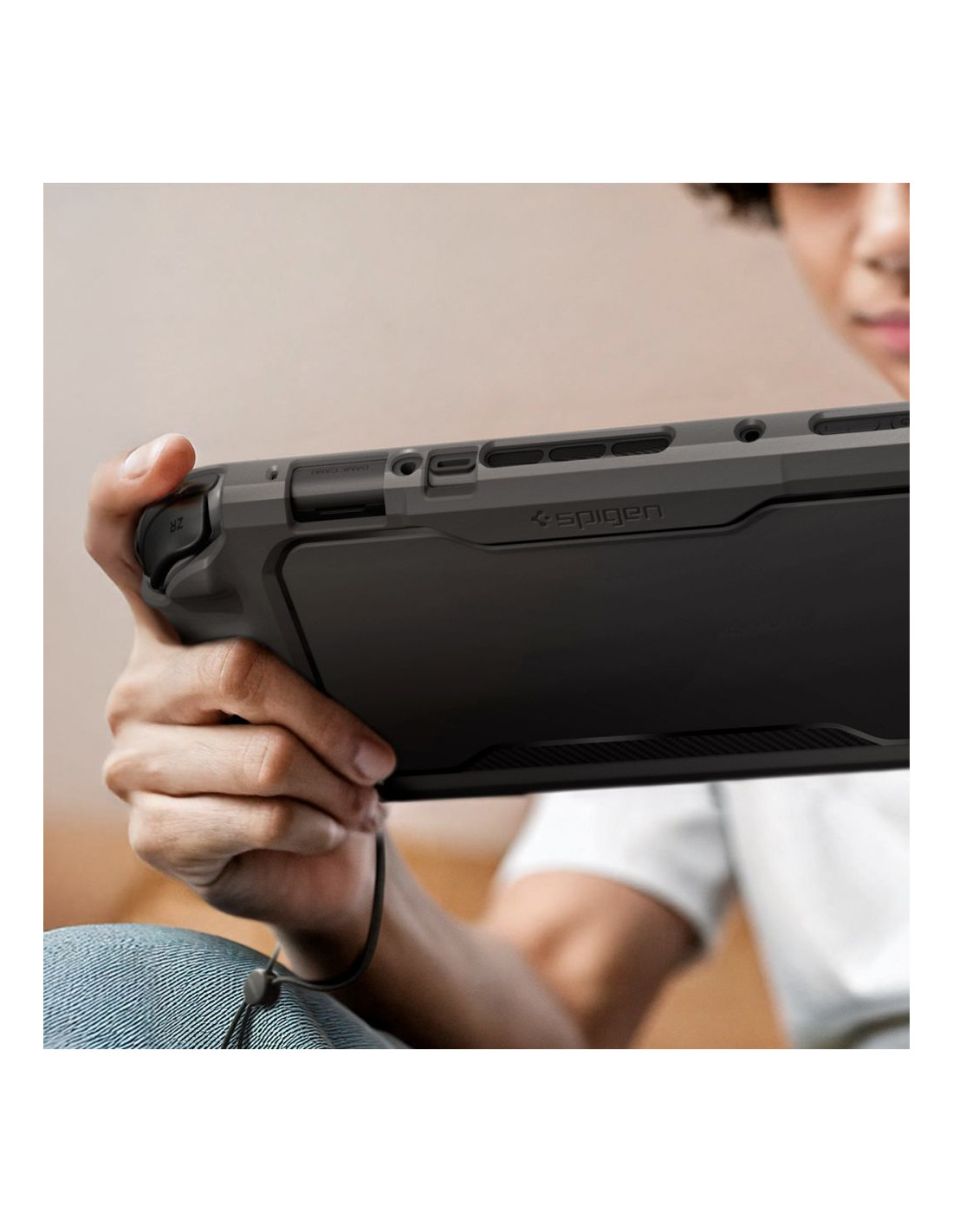„Spigen Rugged Armor“ – puikus apsauginis dėklas žaidėjams, vertinantiems stilių ir funkcionalumą. Pagamintas iš aukštos kokybės TPU , jis efektyviai apsaugo konsolę nuo smūgių ir kritimų, užtikrindamas saugumą net ir įdomiausiomis žaidimo akimirkomis. Ergonomiška forma ir tekstūruotas, matinis paviršius garantuoja saugų ir patogų sukibimą, žymiai pagerindamas naudojimo komfortą. Be to , elegantiškos anglies pluošto detalės suteikia dėklui modernų ir stilingą vaizdą. Tikslūs išpjovimai leidžia lengvai pasiekti visus mygtukus, paleidiklius, prievadus ir valdymo svirtis, o pridedamas riešo dirželis leidžia lengvai transportuoti konsolę keliaujant.