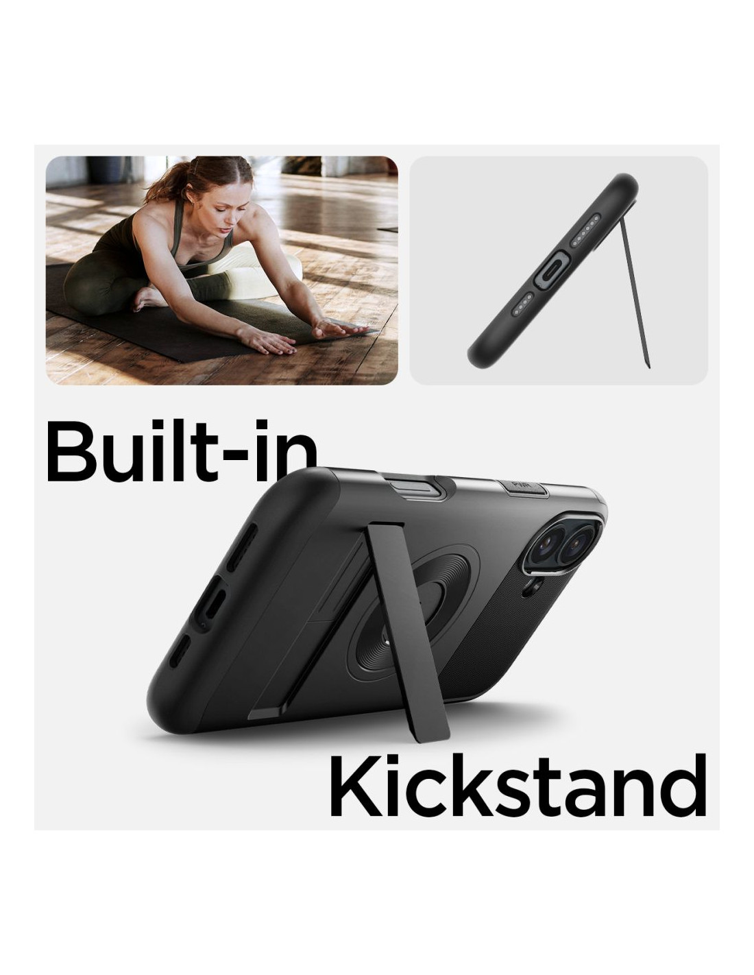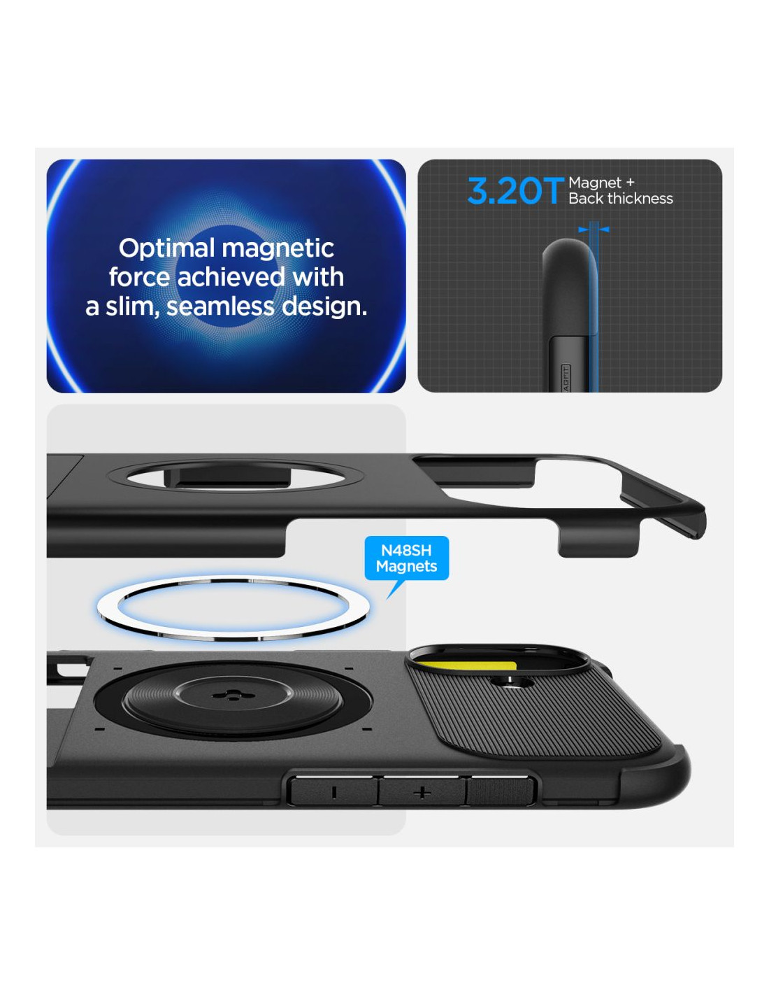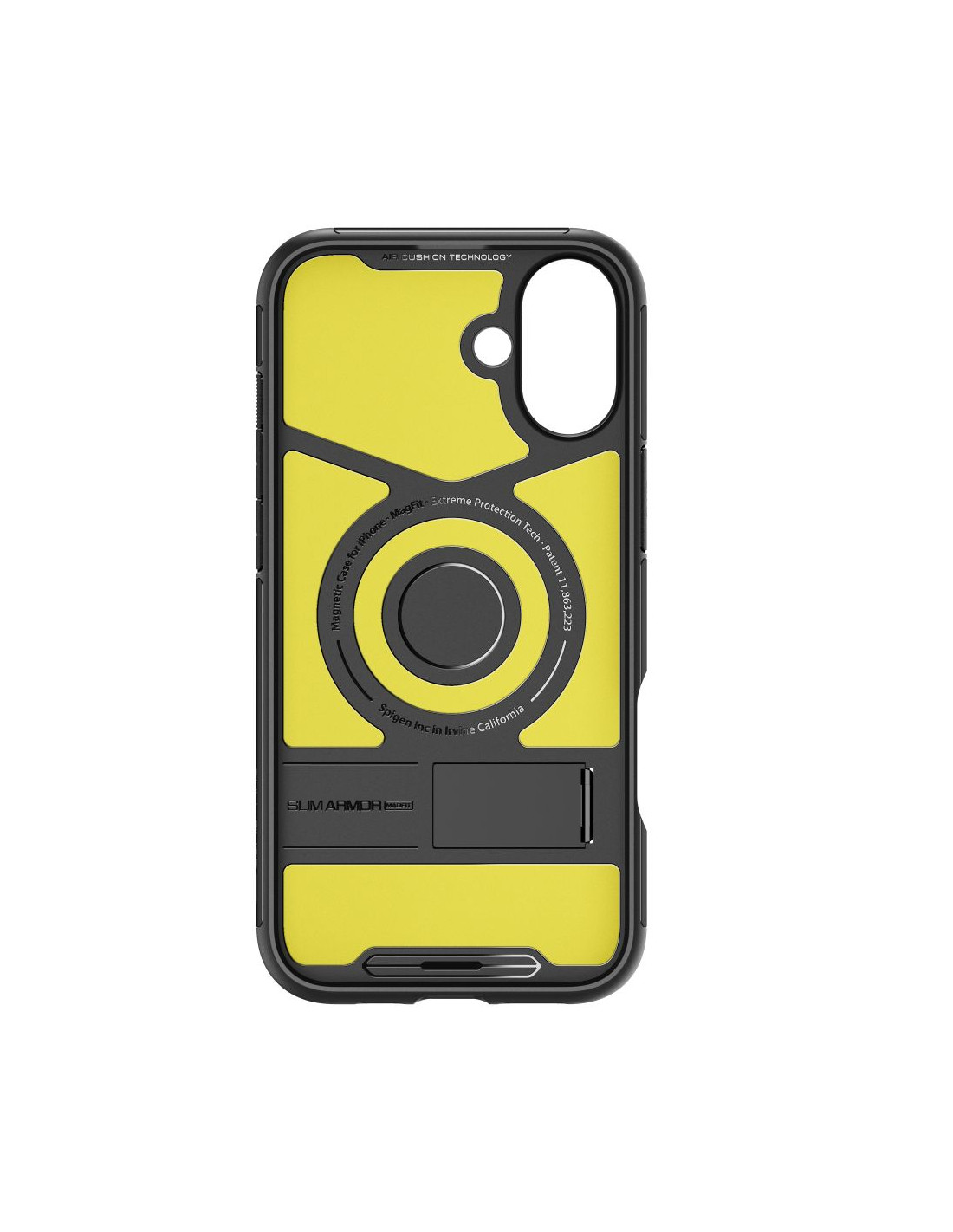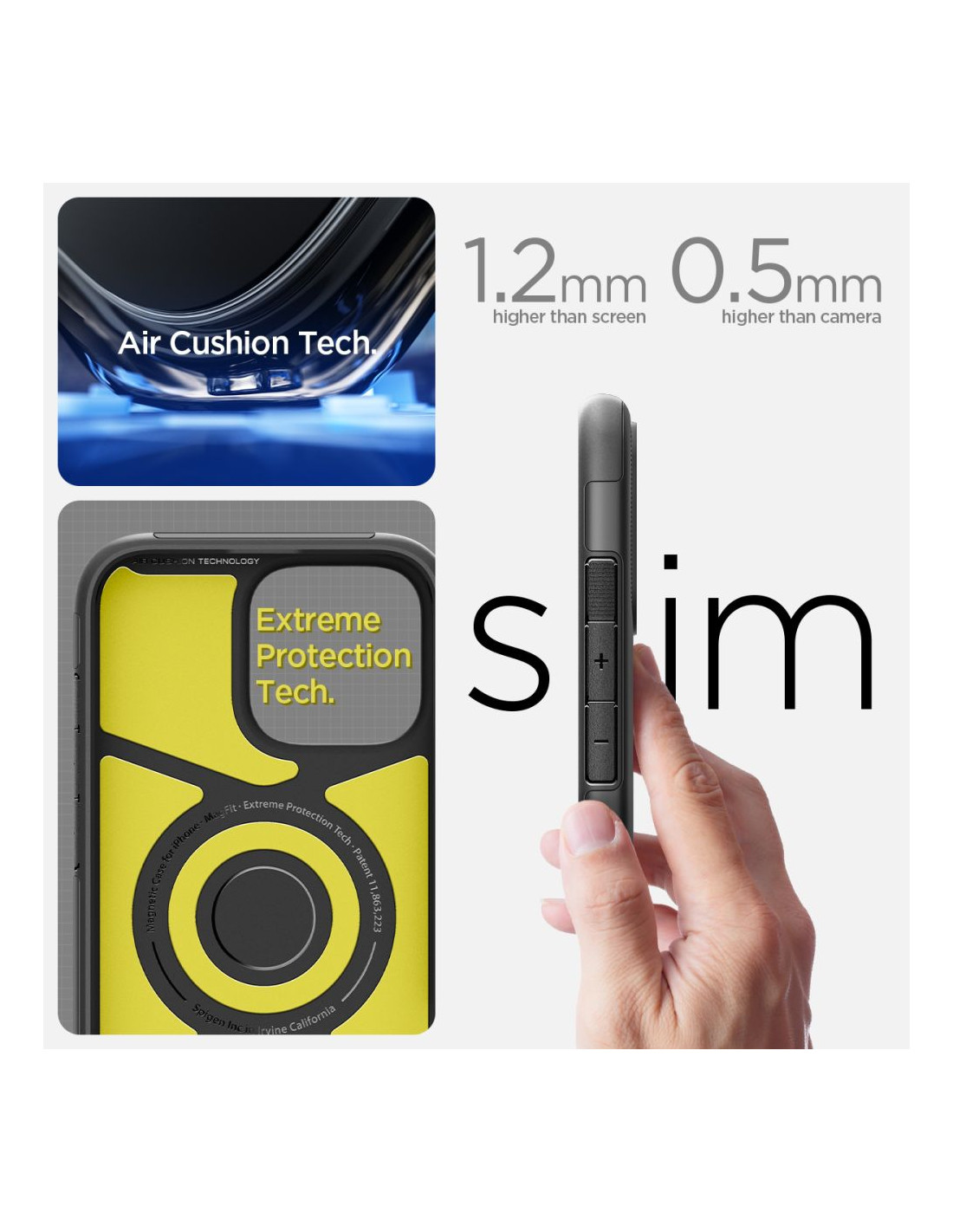 „Spigen Slim Armor Magsafe“ – tai dėklas , kuris sujungia išskirtinę apsaugą su elegantišku, plonu dizainu. Sukurtas tiems, kuriems reikia tvirtos išmaniojo telefono apsaugos neprarandant estetikos ir naudojimo patogumo. Dėl dvisluoksnės konstrukcijos „Slim Armor“ efektyviai apsaugo nuo kritimų ir smūgių, išlaikydamas ploną profilį, kuris puikiai priglunda prie rankos. Tai puikus pasirinkimas tiems, kurie nori užtikrinti, kad jų telefonas būtų geriausiose rankose. Lankstaus TPU ir patvaraus polikarbonato derinys užtikrina maksimalią apsaugą nuo smūgių, kritimų ir įbrėžimų. Sustiprinti kampai su oro pagalvėlėmis efektyviai sugeria smūgius, padidindami atsparumą kritimams. Nepaisant pažangios apsaugos, dėklas išlaiko ploną formą, kuri nepadidina įrenginio svorio. Šiek tiek pakelti kraštai aplink ekraną ir kamerą suteikia papildomą apsaugą nuo įbrėžimų, o puikiai pagamintos išpjovos užtikrina lengvą prieigą prie visų prievadų, mygtukų ir išmaniojo telefono funkcijų. Praktiškas, sulankstomas stovas leidžia patogiai žiūrėti filmus, naršyti internete ar skambinti laisvų rankų įranga vaizdo skambučiais. Dėkle yra žiedas, suderinamas su belaidžio ryšio technologija „MagSafe“. Magnetinis žiedas užtikrina maksimalų įkrovimo efektyvumą ir greitą bei paprastą prijungimą prie visų priedų, palaikančių „MagSafe“.