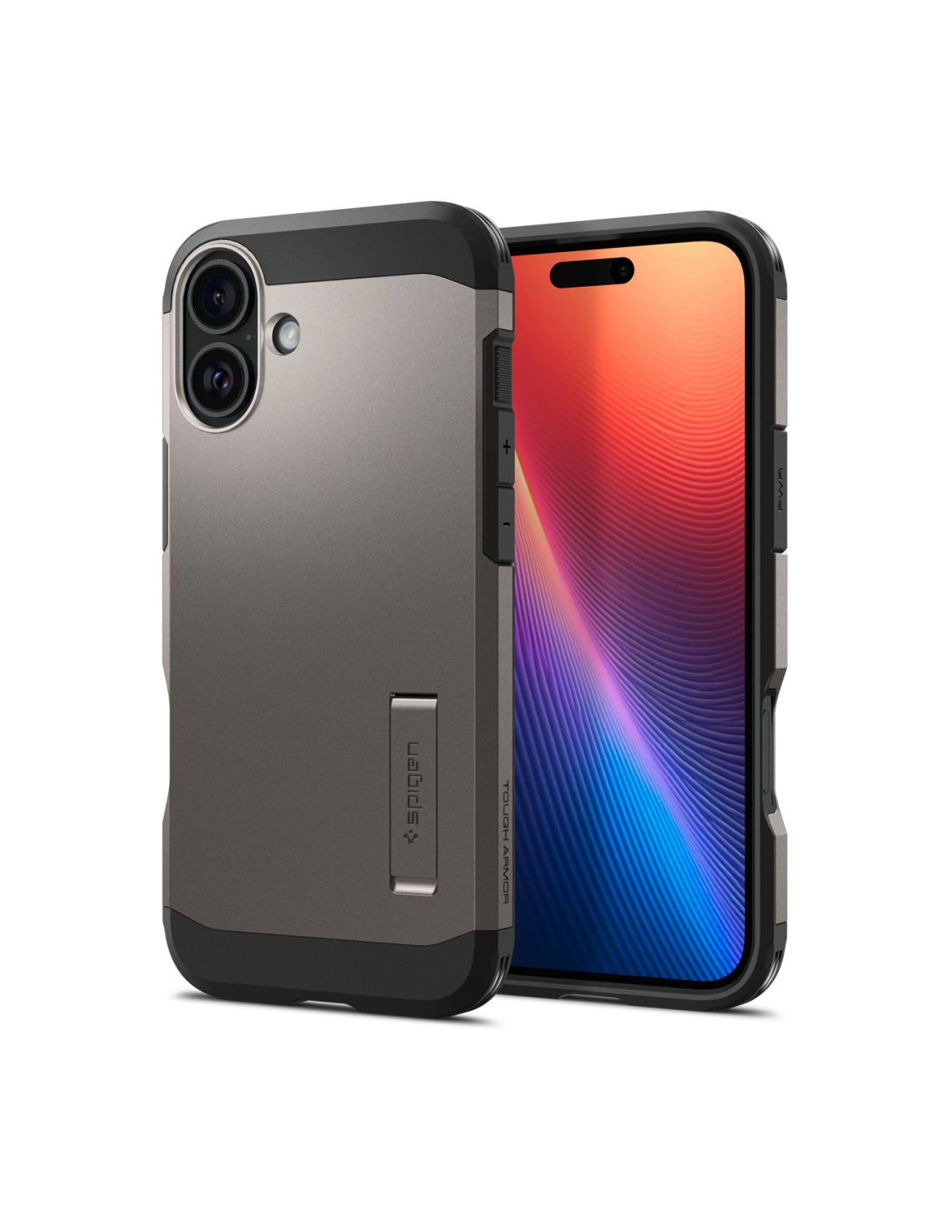 Tvirtas „Armor MagSafe“ dėklas su stovu, skirtas „iPhone 16“ – metalo spalvos