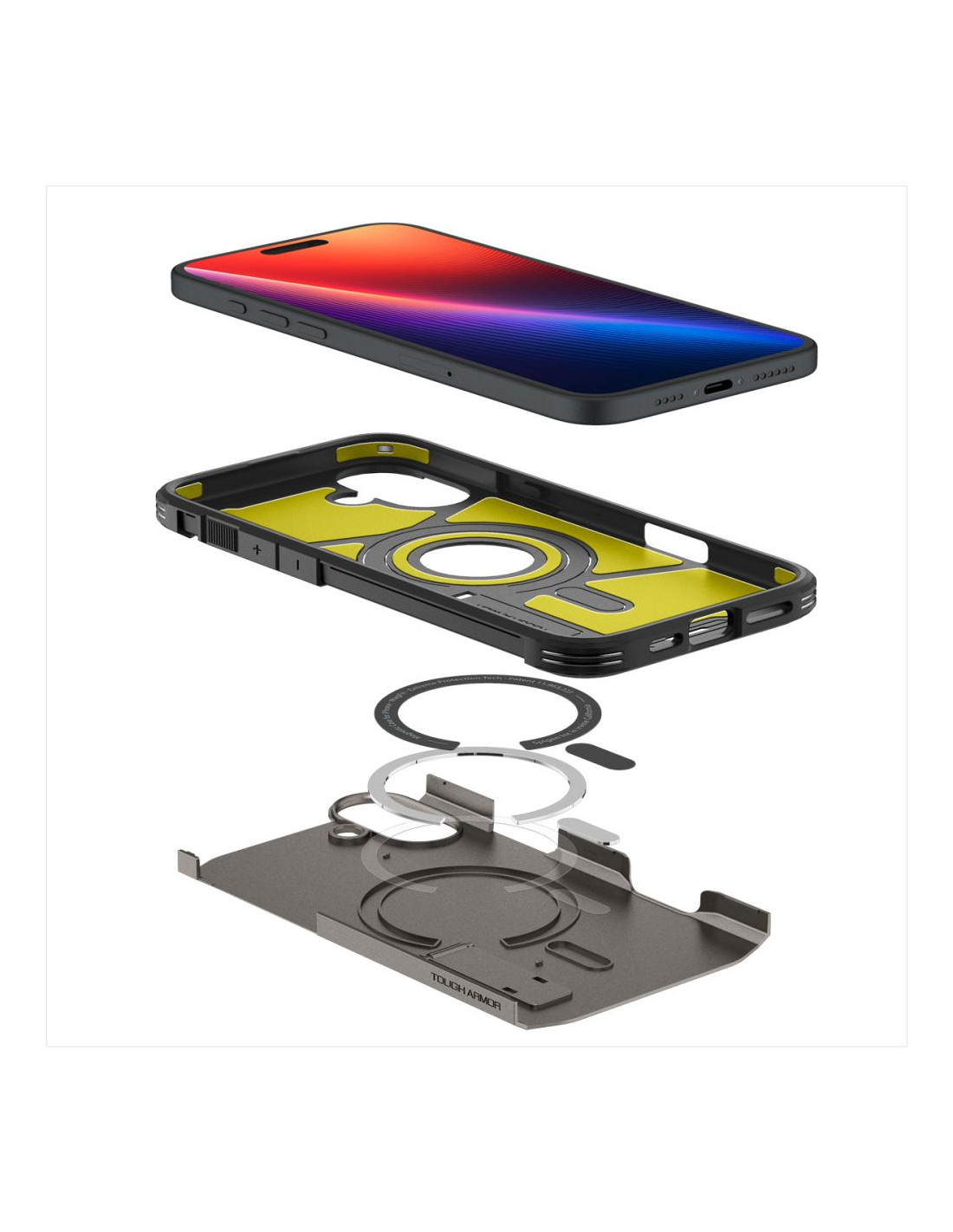 „Spigen“ „Tough Armor Mag“ dėklas yra patobulinta savo pirmtako versija. Jame yra magnetinis žiedas , suderinamas su „Apple MagSafe“ belaidžio įkrovimo ir tvirtinimo sistema , užtikrinantis greitą ir paprastą „Apple“ technologijų naudojimą. Dviejų dalių konstrukcija pagaminta iš dilimui atsparaus termoplasto ir sutvirtinančio polikarbonato rėmo. Dėklo viduje yra technologinis putplasčio paminkštinimas, kuris suteikia papildomą apsaugos sluoksnį nuo smūgių ar kritimų. Dėklas puikiai priglunda ir netrukdo belaidžiam įkrovimui. Šiek tiek pakelta konstrukcija aplink kamerą ir ekraną apsaugo jį nuo įbrėžimų, pakeliant telefoną šiek tiek virš lygaus paviršiaus. Jame yra mygtukų dangteliai ir angos prievadams. „Tough Armor“ dėklas buvo 26 kartus išbandytas kritimo metu iš 1,2 metro aukščio, todėl gavo Amerikos MIL-STD 810G-516.6 sertifikatą.