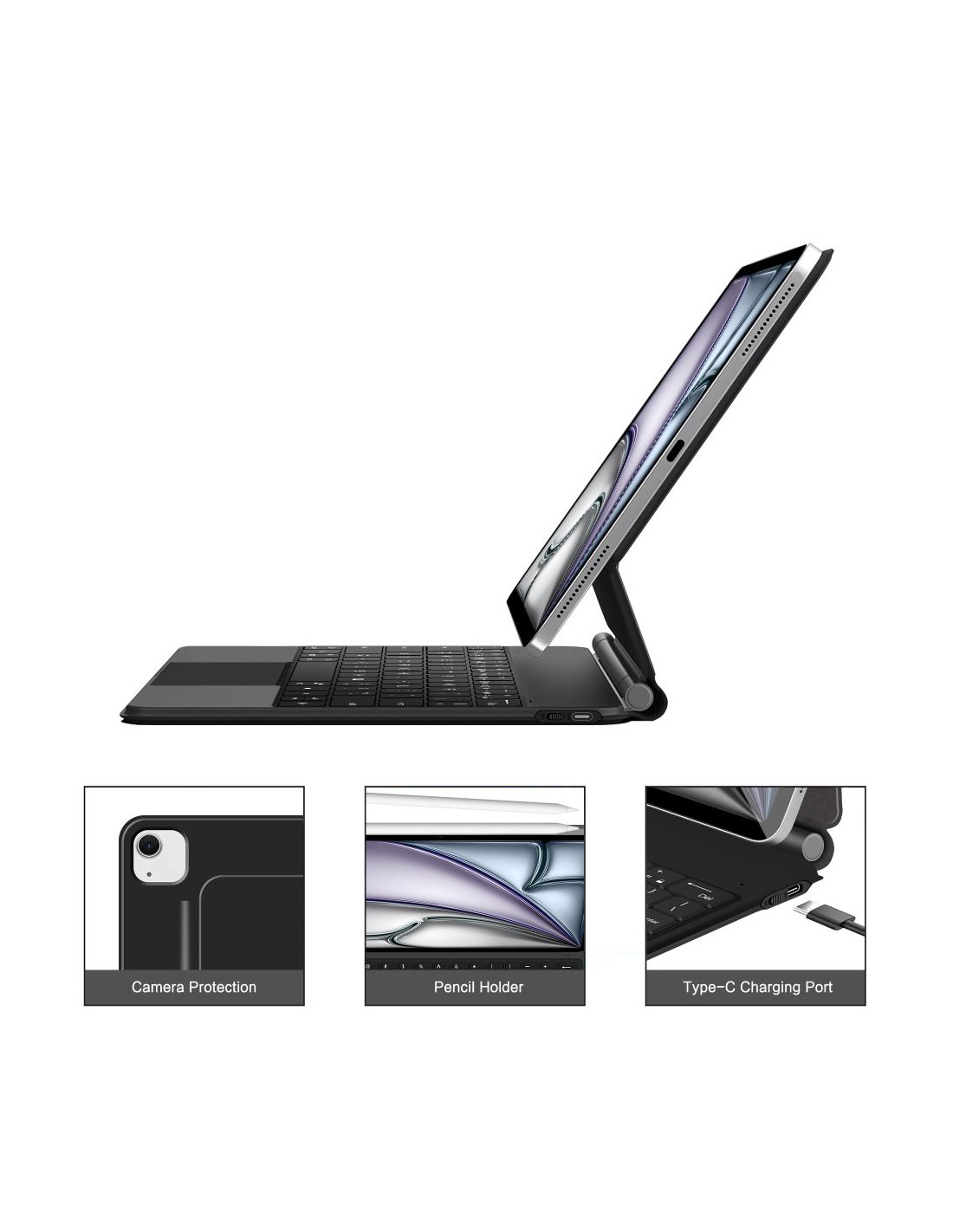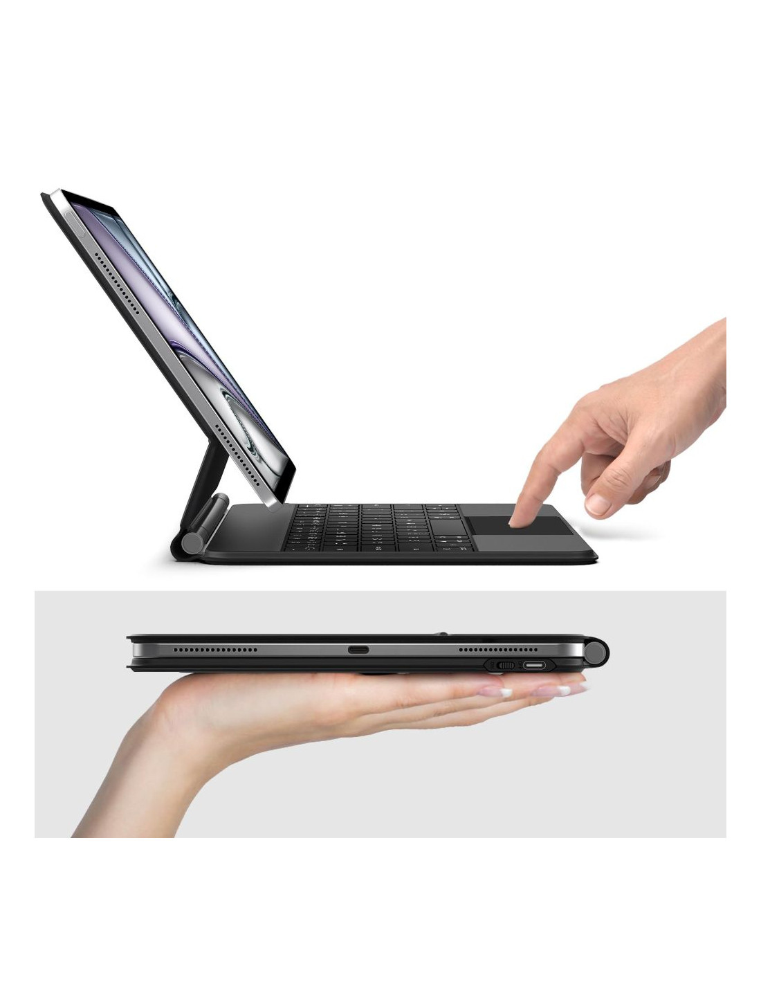 „Tech-Protect SmartCase Magnetic“ su klaviatūra yra praktiškas ir modernus aksesuaras, paverčiantis jūsų „iPad“ funkcionalia priemone darbui, mokymuisi ir pramogoms. Šis elegantiško dėklo, magnetinio laikiklio ir belaidės klaviatūros su jutikliniu skydeliu derinys kasdienį planšetinio kompiuterio naudojimą daro dar patogesnį. Magnetinis dėklas tvirtai laiko jūsų „iPad“ vietoje, todėl galite jį reguliuoti tobulu kampu – nesvarbu, ar rašote, žiūrite filmus, ar atliekate vaizdo skambučius. Kameros ir prievadų išpjovos leidžia visapusiškai išnaudoti įrenginio funkcijas nenuimant dėklo. Pridedama „Bluetooth“ klaviatūra su foniniu apšvietimu pasižymi patogiu, nešiojamojo kompiuterio stiliaus išdėstymu ir tiksliu jutikliniu skydeliu, leidžiančiu rašyti, naršyti internete ir naršyti programose neliečiant ekrano. Integruoti sistemos spartieji klavišai pagreitina darbo eigą, o klaviatūrą lengva prijungti ir naudoti.