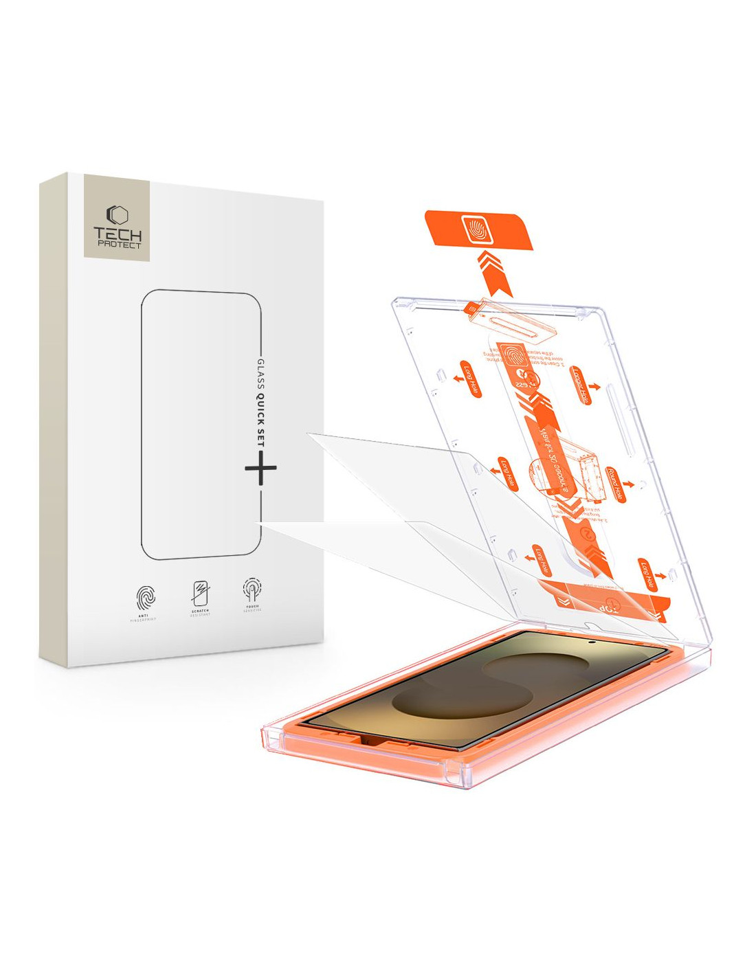 „Tech-Protect Quick Set+“ grūdintas stiklas yra aukščiausios kokybės ekrano apsauga, kurioje derinamas patvarumas, komfortas ir modernios technologijos. Pagamintas iš 9H kietumo stiklo , jis pasižymi išskirtiniu atsparumu smūgiams ir įbrėžimams. Dėl inovatyvios tvirtinimo sistemos su rėmeliu stiklo uždėjimas yra neįtikėtinai greitas, tikslus ir be jokių rūpesčių – be oro burbuliukų ar dulkių rizikos. Krištolinio skaidrumo paviršius garantuoja puikią vaizdo kokybę ir išskirtinai sklandų lietimą. Speciali oleofobinė danga efektyviai sumažina pirštų atspaudus ir apsaugo nuo vandens kondensacijos ant stiklo paviršiaus. „Tech-Protect Quick Set+“ yra puikus sprendimas visiems, kurie tikisi maksimalios apsaugos ir patogaus išmaniojo telefono naudojimo.