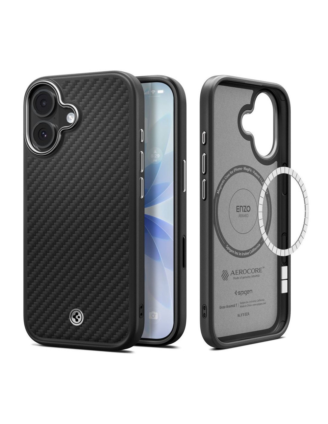 „Spigen Enzo Aramid „T“ Magsafe“ dėklas sujungia naujausias technologijas ir medžiagas, užtikrindamas maksimalią išmaniojo telefono apsaugą neprarandant elegantiškos išvaizdos. Pagamintas iš pažangaus aramidinio pluošto , žinomo dėl išskirtinio patvarumo, tiksli aliuminio apdaila ne tik suteikia unikalią išvaizdą, bet ir užtikrina papildomą apsaugą nuo smūgių ir pažeidimų. Sukurtas atsižvelgiant į minimalizmą, dėklas yra neįtikėtinai lengvas, todėl jo praktiškai nepastebima kišenėje ar rankoje. Dėkle yra žiedas, suderinamas su belaide „MagSafe“ technologija. Magnetinis žiedas užtikrina maksimalų įkrovimo efektyvumą ir greitą bei paprastą prijungimą prie visų „MagSafe“ palaikančių priedų. „Ultra Hybrid #8221;T#8221;“ turi specialiai sukurtą apsauginį mygtuką , kuris sklandžiai integruojasi su kameros valdikliais. Mygtukas yra jautrus lietimui, užtikrinantis puikų reagavimą, išlaikant visas funkcijas.