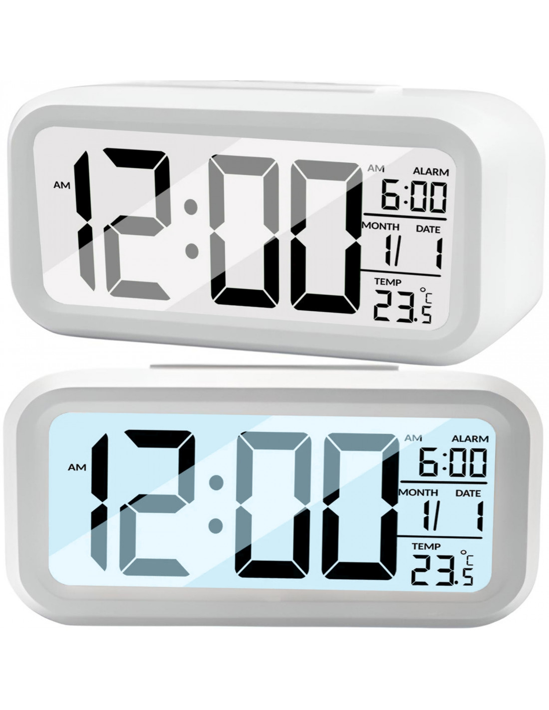 Baterijomis maitinamas žadintuvas su termometru, data ir foniniu apšvietimu