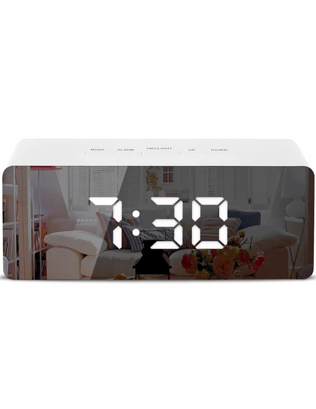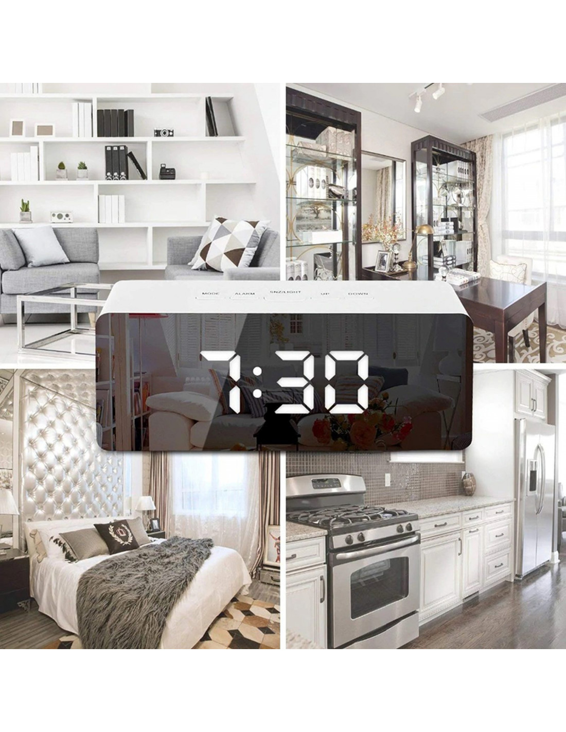 Šis elektroninis žadintuvas su veidrodiniu LED ekranu ir termometru yra modernus ir funkcionalus prietaisas, kuriame elegantiškas ir kompaktiškas dizainas sujungia laikrodį, žadintuvą, termometrą ir veidrodį. Jis puikiai tinka miegamajam, svetainei, biurui, virtuvei ar kelionėms.