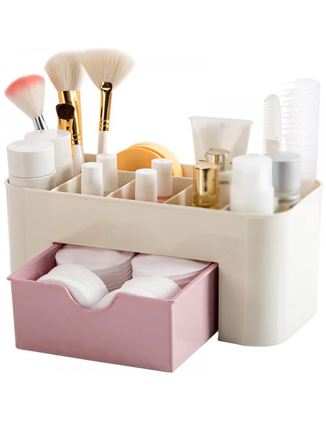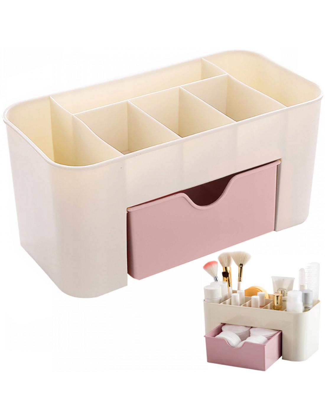 Šis stilingas ir praktiškas organizatorius leidžia vienoje vietoje susitvarkyti kosmetiką, papuošalus, laikrodžius ir smulkius aksesuarus. Jis puikiai tinka vonios kambariui, stalui ar praustuvui. Turėdamas šešis skyrius ir vieną užrakinamą stalčių , jis leidžia lengvai susitvarkyti kasdienius daiktus. Modernus, tačiau universalus dizainas puikiai tiks bet kokiam interjerui.