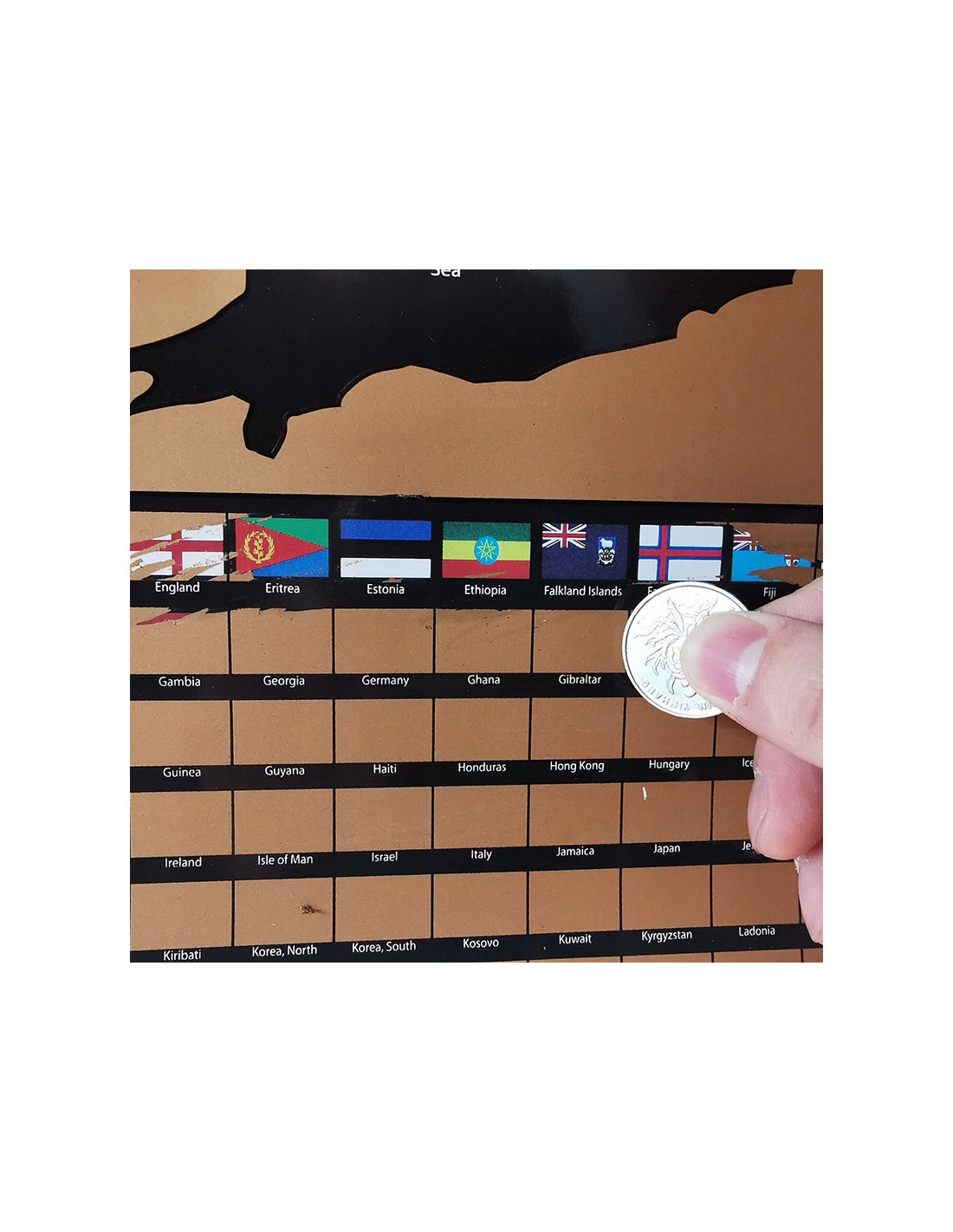 Šis nutrinamas žemėlapis yra unikalus prietaisas kelionių entuziastams , leidžiantis jiems pažymėti savo apsilankymus ir planuoti kitas keliones. Pagamintas iš patvarios, įbrėžimams atsparios medžiagos, jį nubraižius atsiskleidžia spalvingi šalių kontūrai. Jis puikiai tinka kaip namų puošmena, geografijos mokymosi priemonė ar keliautojo dovana. Dėl pridėtų priedų jį galima pakabinti ir suasmeninti.