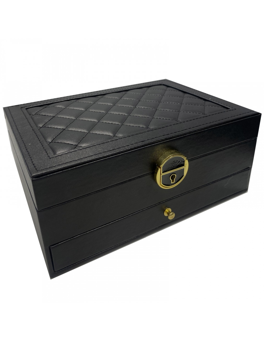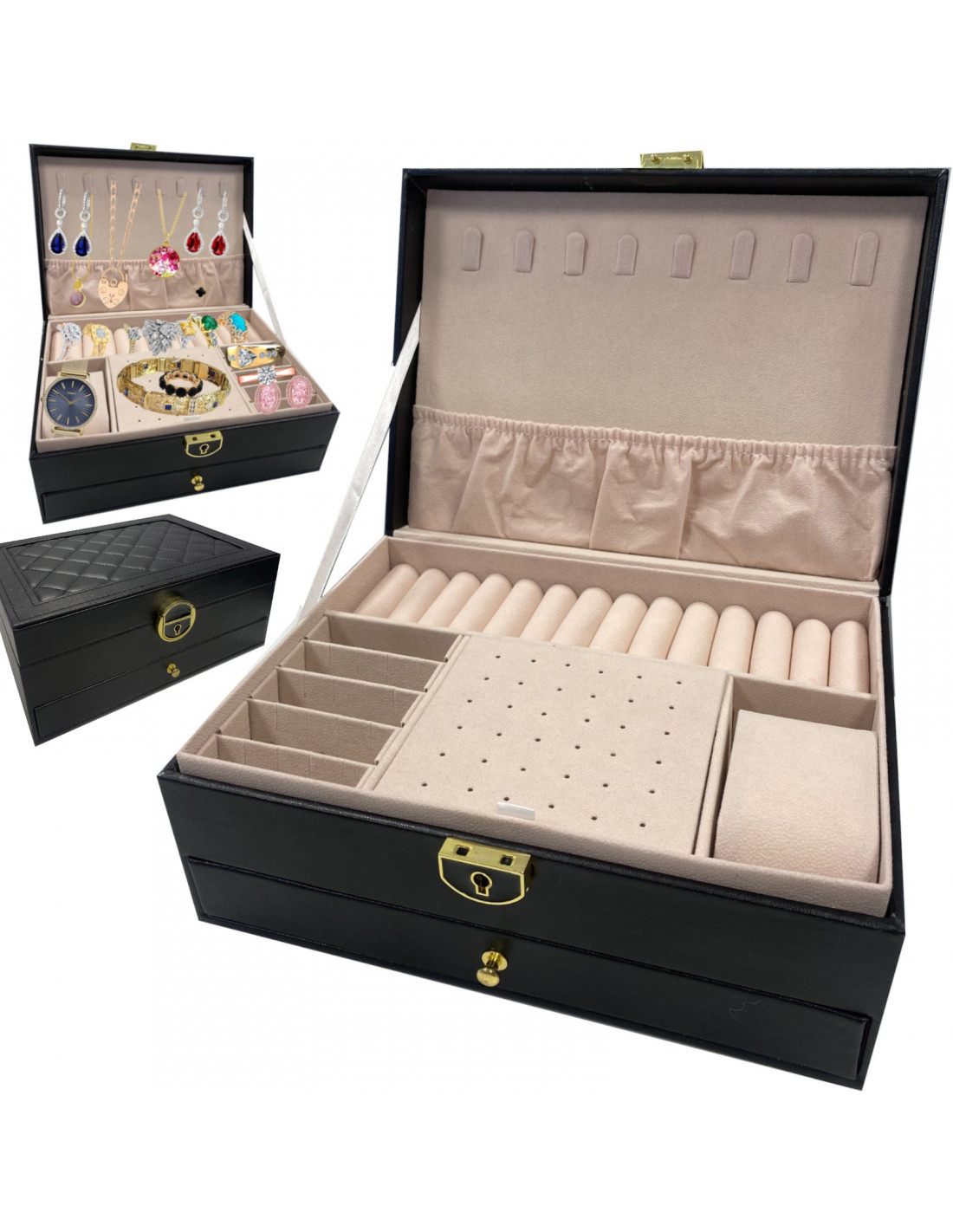 Ši papuošalų dėžutė, pagaminta iš aukštos kokybės juodos dirbtinės odos, yra elegantiška ir praktiška organizatorius, kuris padės jums tvarkingai laikyti savo kolekciją. Įrengta daugybe skyrelių ir rakto spyna , todėl joje galite saugiai ir patogiai laikyti žiedus, grandinėles, auskarus, laikrodžius ir apyrankes. Dėl kompaktiško dydžio ji taip pat puikiai tinka kelionėms.