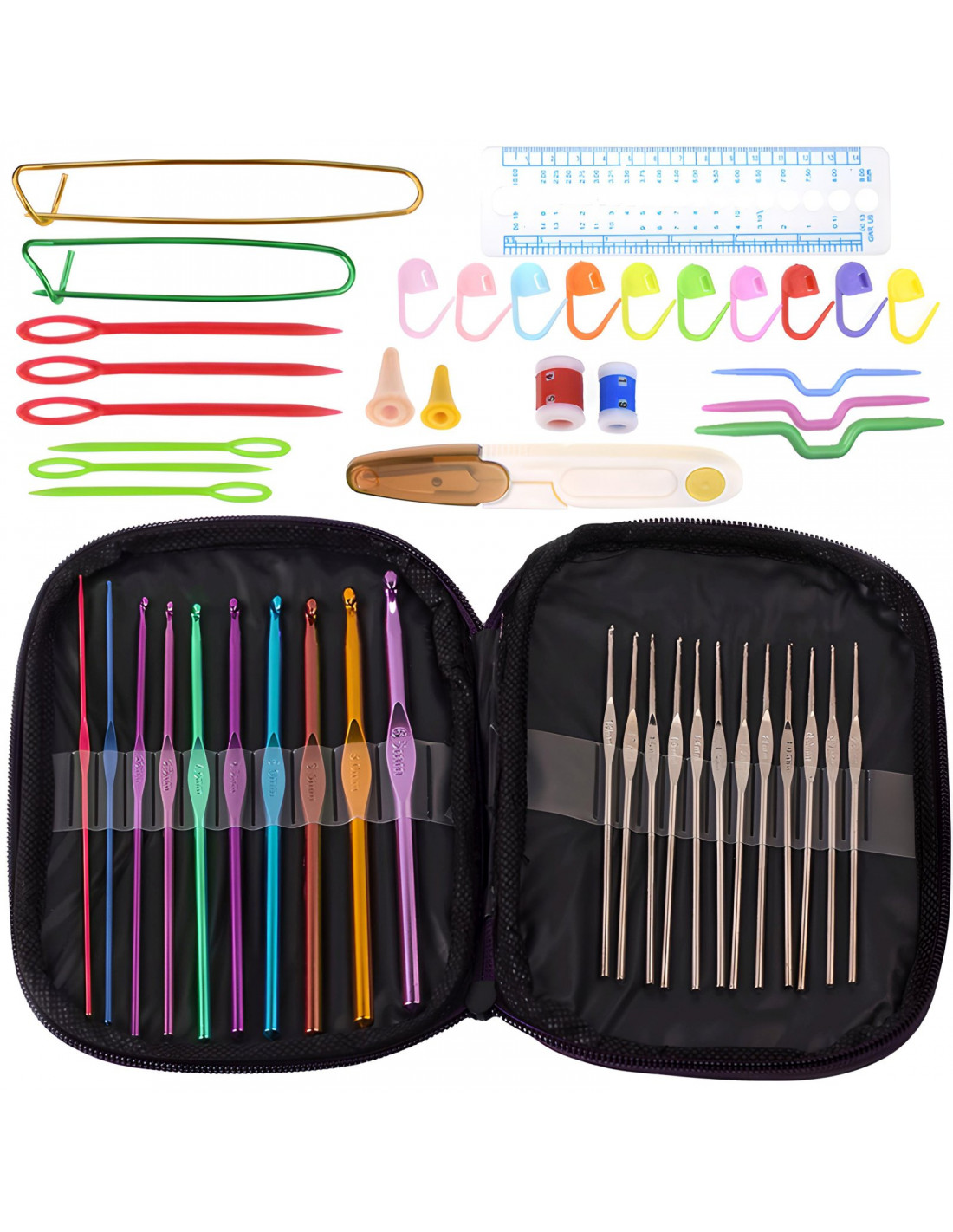 Pilnas nėrimo rinkinys pradedantiesiems ir pažengusiems naudotojams, kurį sudaro 50 dalių, įskaitant 22 įvairių dydžių nėrimo vąšelius. Viskas supakuota praktiškame eko odos dėkle patogiam laikymui ir transportavimui. Nėrimo vąšeliai, pagaminti iš lengvo aliuminio ir nerūdijančio plieno, užtikrina patogumą ir tikslumą. Ideali dovana arba praktiškas rinkinys kasdieniam naudojimui.