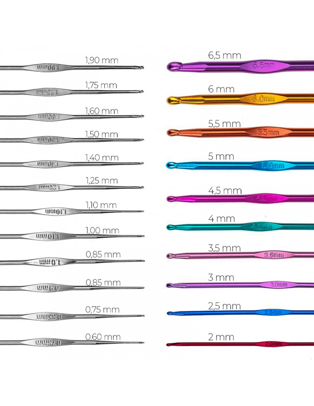 - - Spalvotų nėrimo vąšelių skersmenys: 2,0, 2,5, 3,0, 3,5, 4,0, 4,5, 5,0, 5,5, 6,0, 6,5 mm