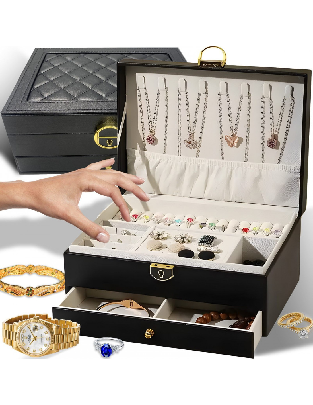 Ši papuošalų dėžutė, pagaminta iš aukštos kokybės juodos dirbtinės odos, yra elegantiška ir praktiška organizatorius, kuris padės jums tvarkingai laikyti savo kolekciją. Įrengta daugybe skyrelių ir rakto spyna , todėl joje galite saugiai ir patogiai laikyti žiedus, grandinėles, auskarus, laikrodžius ir apyrankes. Dėl kompaktiško dydžio ji taip pat puikiai tinka kelionėms.