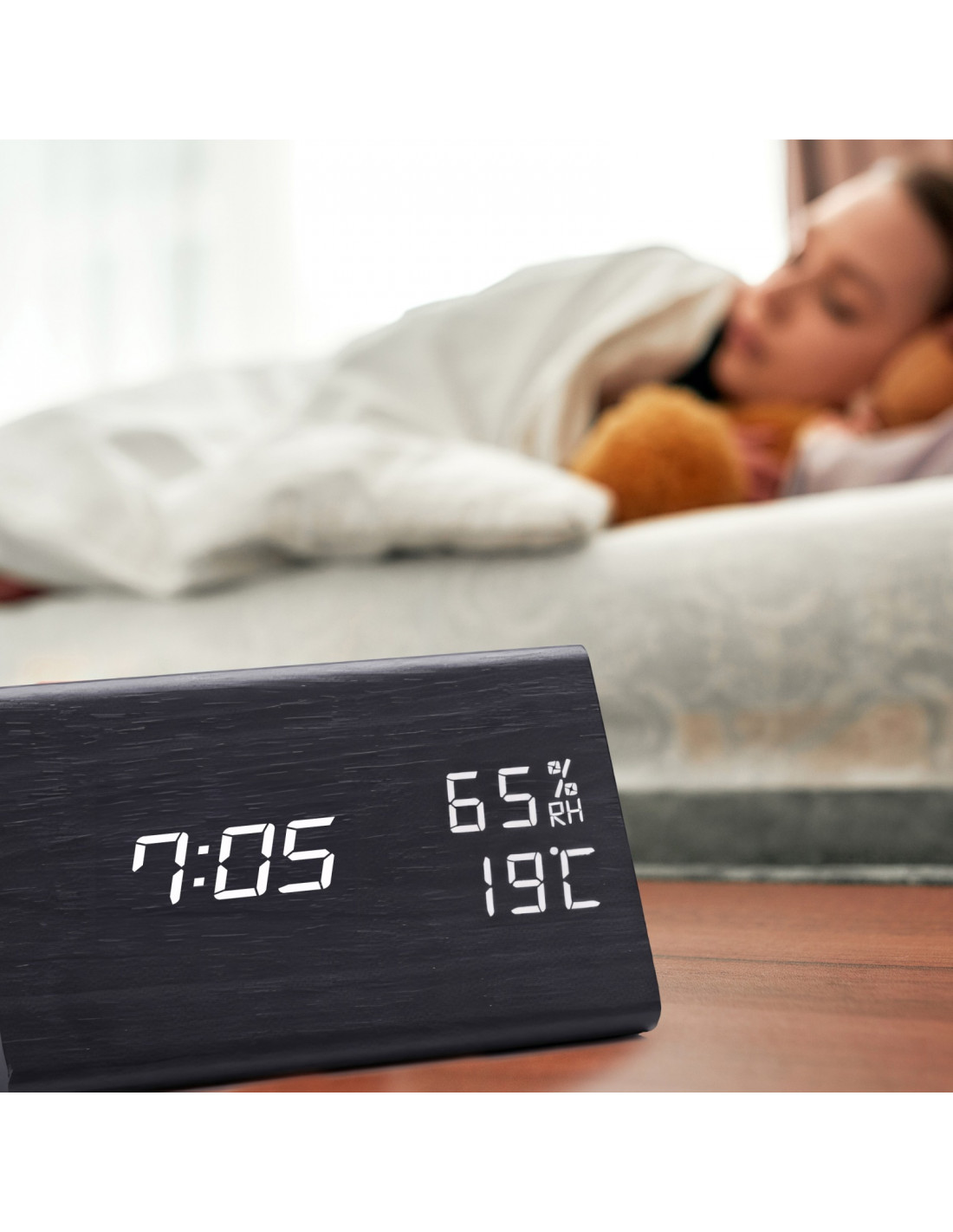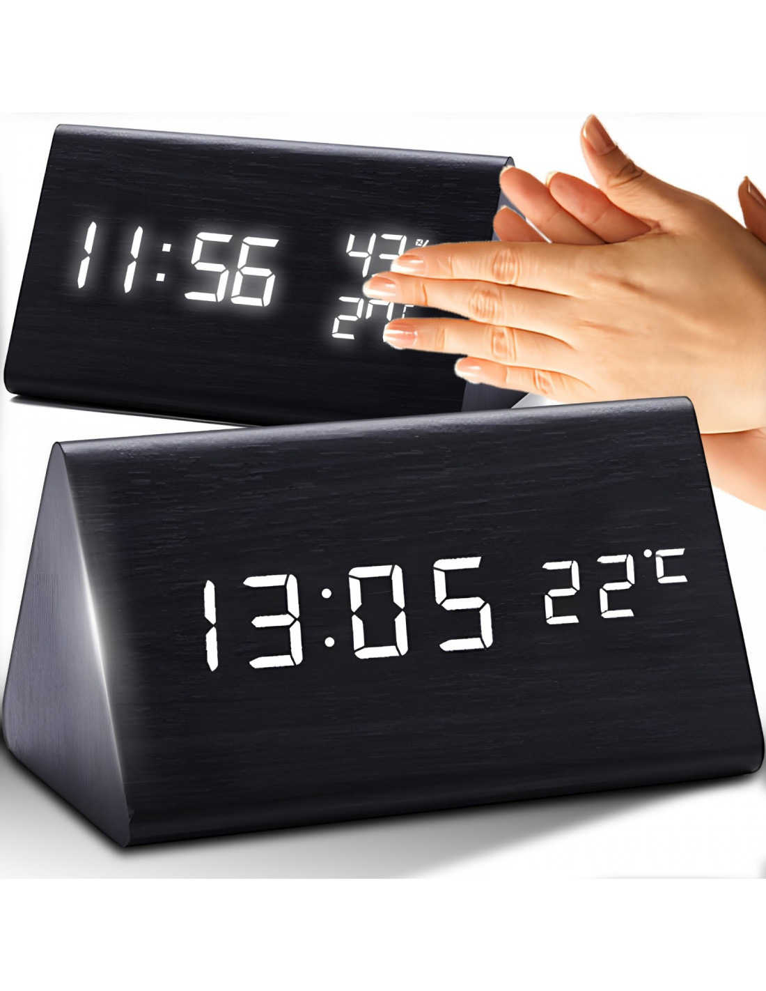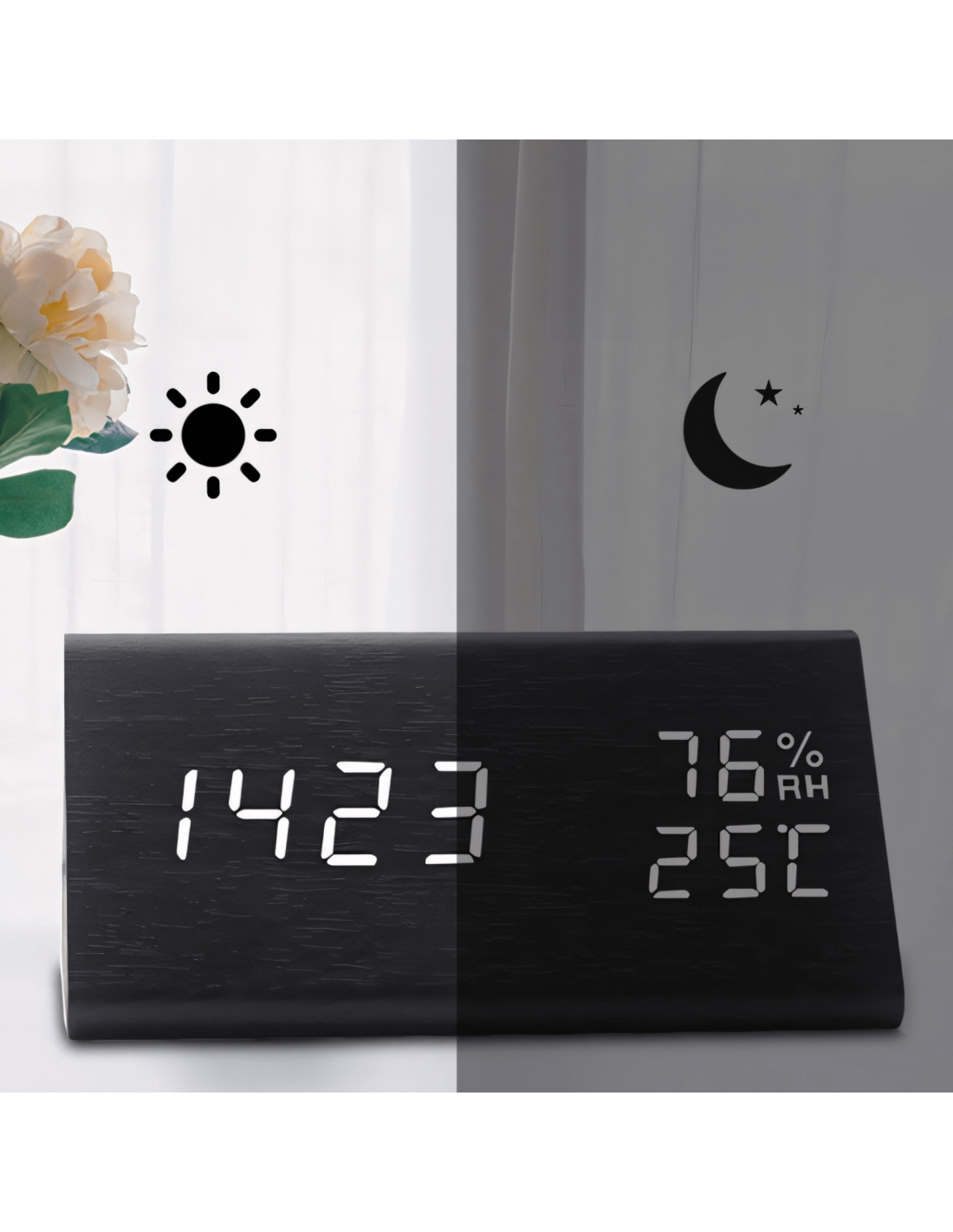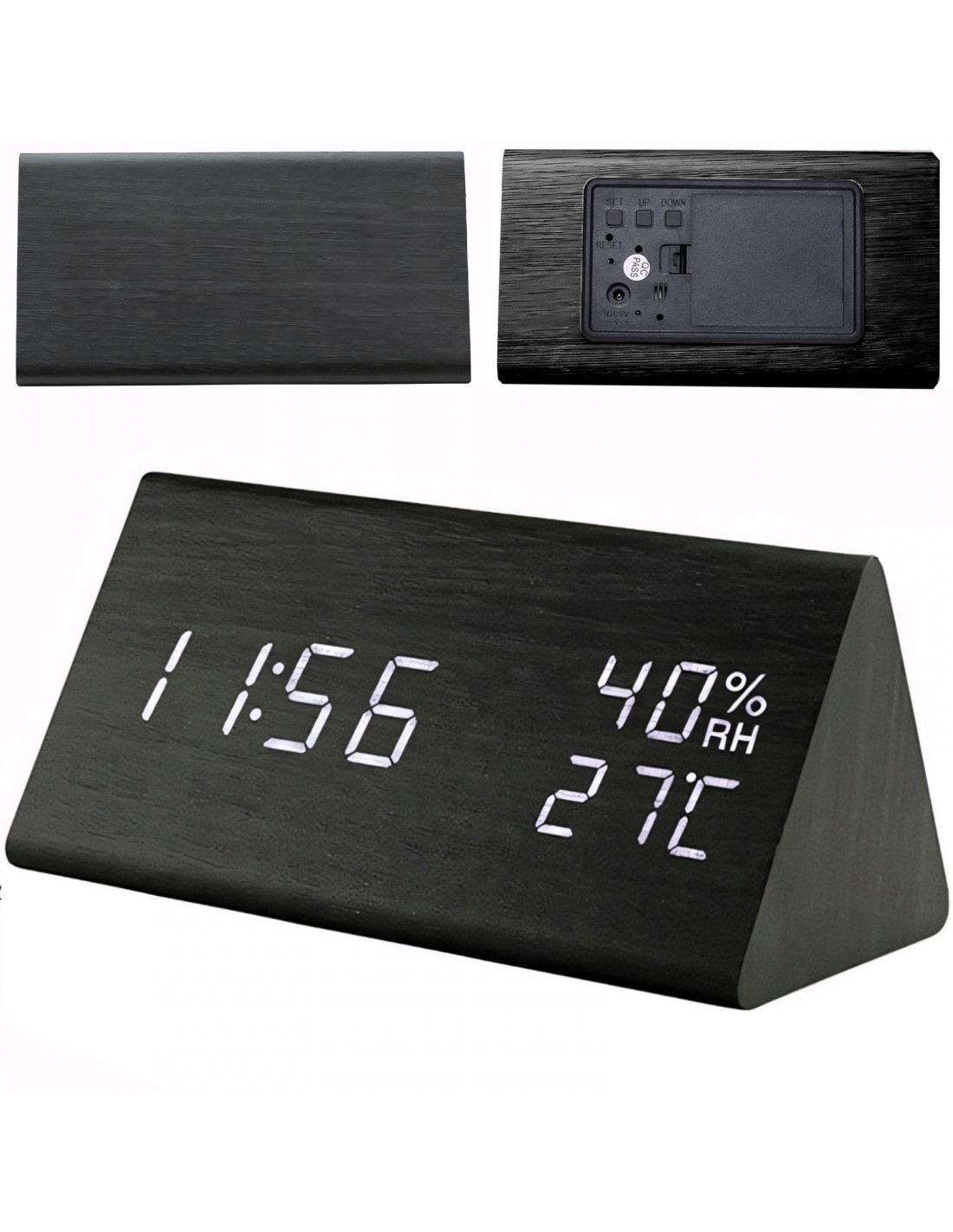 Trikampio formos laikrodis su žadintuvu, termometru ir higrometru, dekoruotas medžio imitacijos rėmeliu. Elegantiškas dizainas puikiai dera prie bet kokio interjero, o funkcionalumas praskaidrins bet kurį rytą. Balso valdymo sistemos dėka ekranas įsijungia paplojus ar palietus , taip taupant energiją. Jame yra trys nepriklausomi žadintuvai ir du rodymo režimai: DP1, kuris nuolat rodo drėgmę, temperatūrą, laiką ir datą; DP-2, kuris pakaitomis rodo drėgmę, temperatūrą, laiką ir datą.