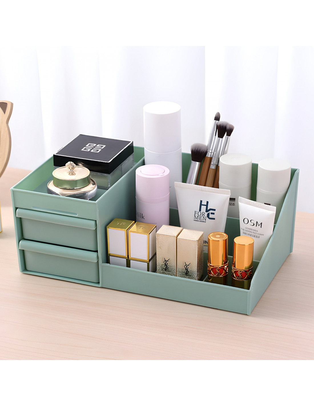 Šis kosmetikos organizatorius yra praktiškas ir universalus sprendimas, palengvinantis įvairių daiktų laikymą ir organizavimą. Pagamintas iš aukštos kokybės PP plastiko , jis yra patvarus ir estetiškai patrauklus, pasižymi moderniu dizainu. Kompaktiškas dizainas su dviem stalčiais ir viršutine lentyna su skyriais leidžia patogiai sutvarkyti kosmetiką, papuošalus, biuro reikmenis ir smulkius kasdienius daiktus. Šis organizatorius puikiai tinka vonios kambariui, persirengimo kambariui, praustuvui, biurui, virtuvei ar dirbtuvėms.