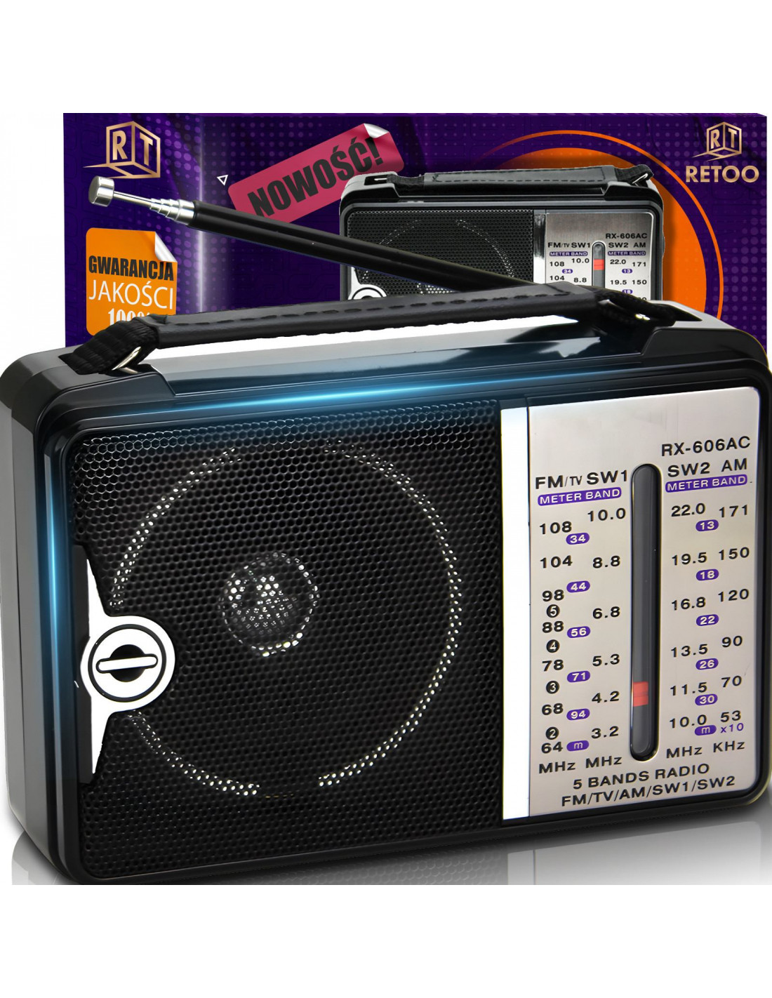 Šis nešiojamas RETOO radijo imtuvas yra universalus įrenginys, skirtas klausytis radijo stočių FM, AM, SW1 ir SW2 diapazonuose. Maitinimas iš elektros tinklo ir baterijų (2 x R20 baterijos – nepridedamos) puikiai tinka naudoti namuose, virtuvėje, biure, taip pat statybvietėse, stovyklaujant ar mėgaujantis gamta. Dėl kompaktiško dydžio ir lengvo, patvaraus korpuso jis yra praktiškas ir nešiojamas sprendimas kasdieniam naudojimui.