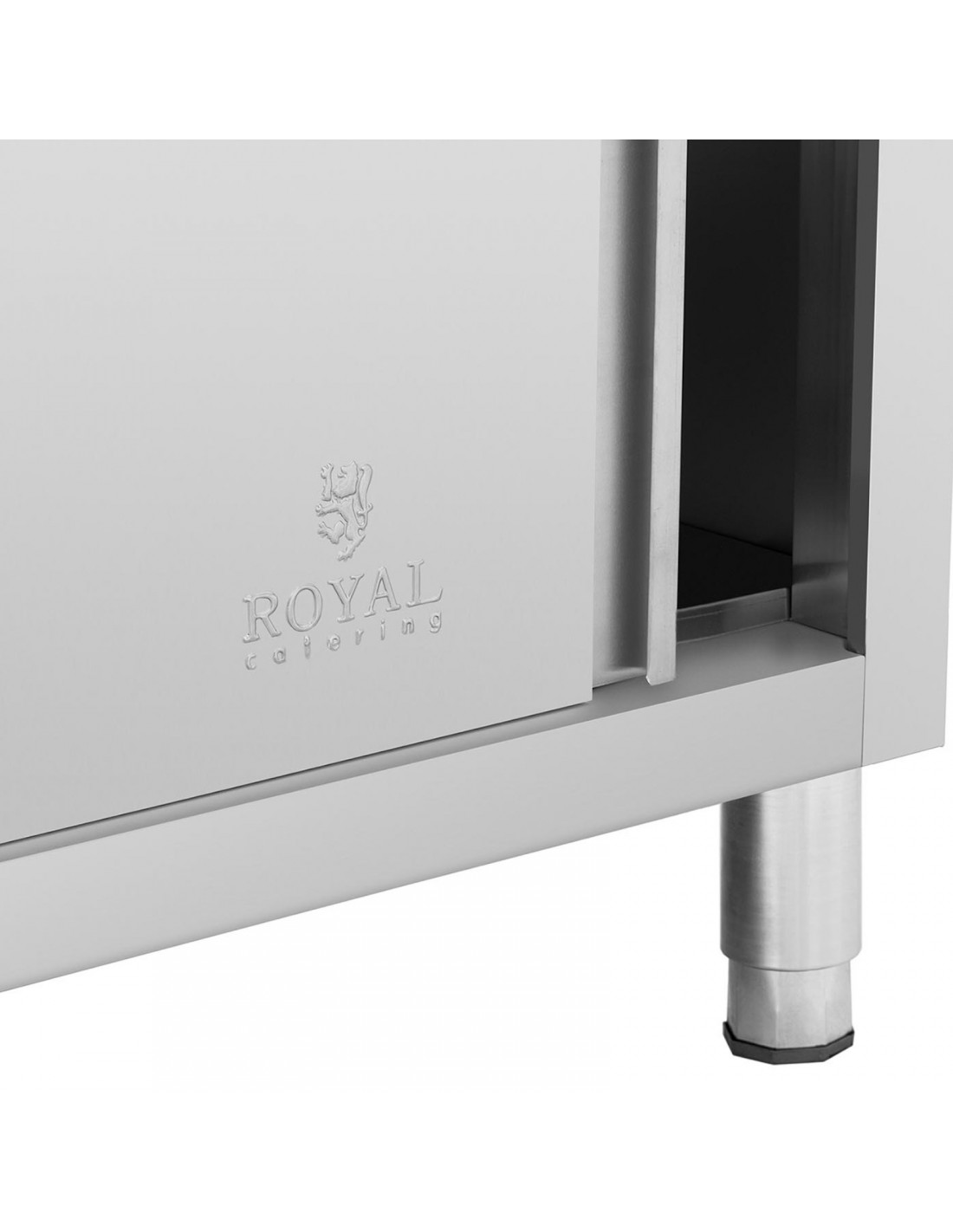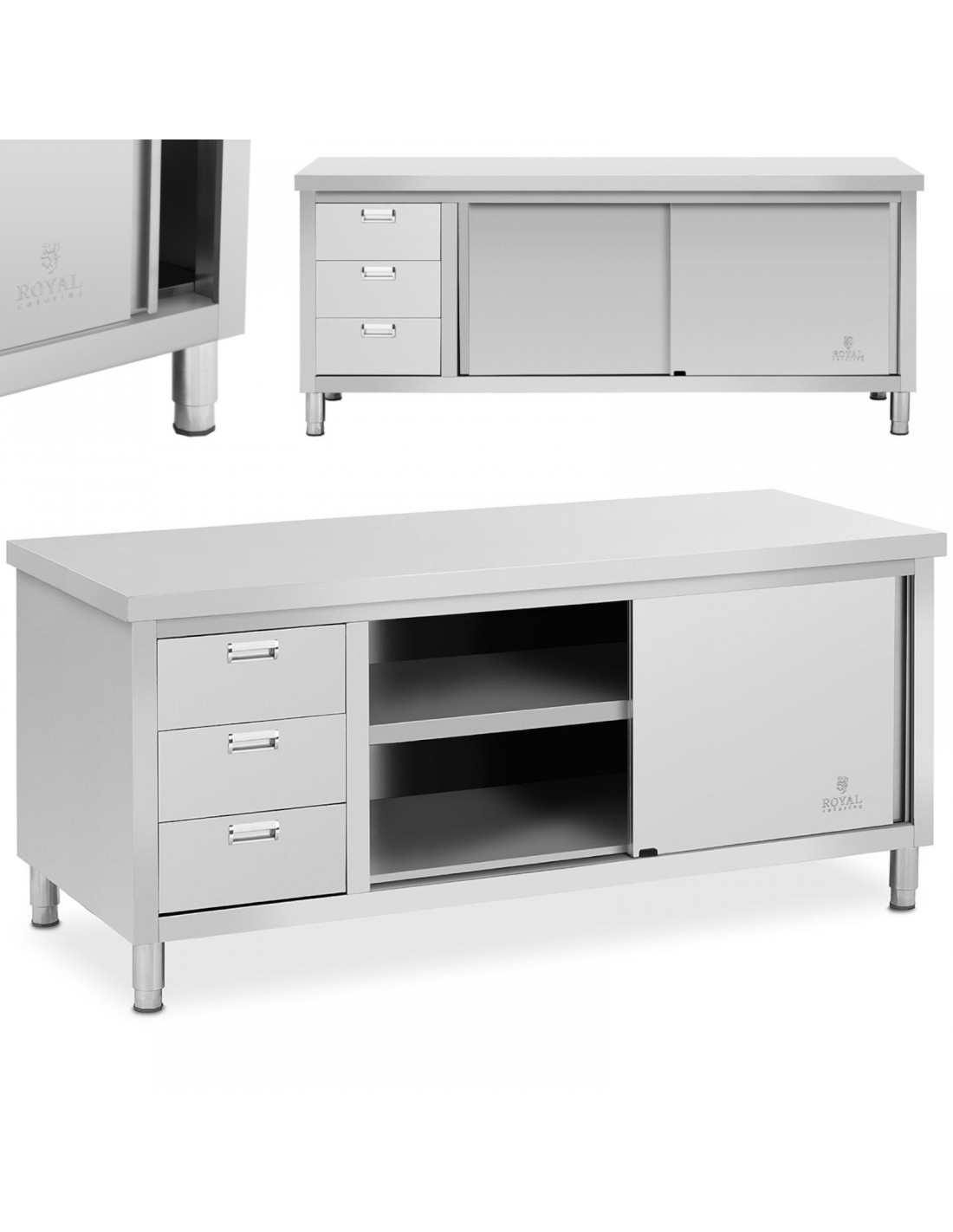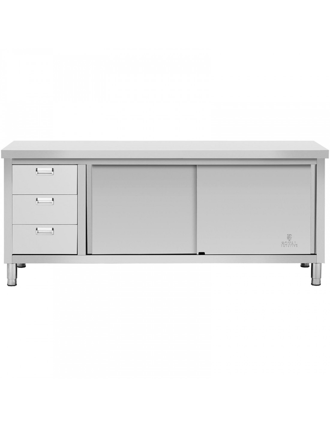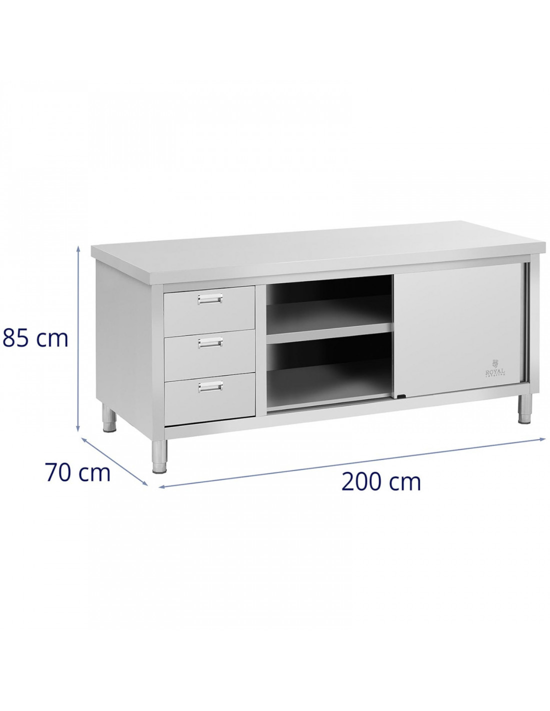 Ši „Royal Catering“ spintelė puikiai tinka restoranams, viešbučiams, valgykloms, ligoninėms ir mėsinėms. Jos matmenys yra 200 x 70 cm . Didelėje spintelėje telpa įvairi įranga. Joje yra lentyna papildomam daiktų laikymui. Ji turi vietą taupančias, saugias naudoti stumdomas duris, kurios užtikrina lengvą prieigą. Trys papildomi stalčiai padeda tvarkingai laikyti mažesnius priedus. Spintelė pagaminta iš nerūdijančio plieno ir yra atspari pažeidimams bei nuolatiniams dėmėms. Jos keliamoji galia yra 600 kg . Reguliuojamos kojelės leidžia stalą pritaikyti prie nelygių grindų.